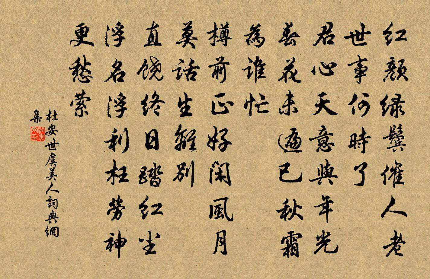 詩詞名句歷史字典書法欣賞書法字典國語詞典說文解字康熙字典古漢語字典標 題 作 者 詩 句 虞美人作者:杜安世 朝代:宋代虞美人原文紅顏綠鬢催人老。世事何時了。君心天意與年光。春花未遍已秋霜。為誰忙。樽前正好閒風月。莫話生離別。直饒終日踏紅塵。浮名浮利枉勞神。更愁縈。詩詞問答問:虞美人的作者是誰?答:杜安世問:虞美人寫於哪個朝代?答:宋代問:虞美人是什麼體裁?答:詞杜安世虞美人書法欣賞虞美人書法作品詩詞推薦早朝魏吉甫〔宋代〕鳴珂曉入奉天門,仰見宸居氣象尊。斗轉星回新歲月,龍盤虎踞舊乾坤。國威震疊邊陲肅,帝澤汪洋浪井溫。雒邑和吳侍郎龍門寶應寺設齋宋庠〔宋代〕闕塞千岩入畫圖,八關修供柅徵車。半斤運泰賢將用,不二門深疾始除。香缽淨羞熏寶席,法螺仙曲逗晴虛。從茲和蔡天啟贈文潛之什秦觀〔宋代〕蔡侯飽學困千釜,濯足清江起南土。劇談頗似燕客豪,快奪范雎如墜雨。東城橋梓未足論,柏直何為口方乳。蔣侯虎丘六絕句致爽閣范成大〔宋代〕碧嶂橫陳似斷鰲,畫闌相對兩雄豪。東軒只有雲千頃,不似西山爽氣高。青城縣何子方使君同年園池范成大〔宋代〕榿塍芋壟意中行,浩蕩薰風不計程。雨腳背人歸玉壘,江聲隨馬入青城。五橋今日新知路,千佛當年舊綴名。水竹【越調】鬥鵪鶉_歌姬教坊馳喬吉〔元代〕歌姬教坊馳名,梨園上班,院本詼諧,宮妝樣範。膚若凝脂,顏如渥丹,香肩憑玉樓,湘雲擁翠鬟。羅帕分香,春清平樂(贈歌者)袁去華〔宋代〕移商換羽。花底流鶯語。唱徹秦娥君且住。腸斷能消幾許。勸觥斜注微波。真情著在誰那。只怕如今歸去,酒醒無慶元冬再到盱眙四首陳造〔宋代〕虎頭山下參天柳,親見栽時共我長。柳自摧殘人自老,半生不抵熟黃粱。時充之訪盤溪有詩次韻王柏〔宋代〕聖賢不出此心公,有為為之未必充。絕學當歸三洞左,正源慾障百川東。坐春立雪誰能繼,弄月吟風豈浪從。方己隱靜遺枇杷梅堯臣〔宋代〕五月枇杷實,青青味尚酸。獼猴定撩亂,欲待熱應難。羅浮李龍高〔宋代〕謾說師雄醉月邊,稚川曾隱此山巔。料伊不是丹砂力,只服梅花換得仙。因禪人發明以頌示之釋子淳〔宋代〕水闊雲深古路賒,五湖禪侶共同家。夜來喜得真訊息,無影林中杇木花。紹定庚寅紀事蕭澥〔宋代〕山花依舊發新叢,溝澮池塘水自通。前日人家無間斷,頹牆破灶草萊中。永遇樂(次稼軒北固樓詞韻)姜夔〔宋代〕雲隔迷樓,苔封很石,人向何處?數騎秋煙,一篙寒汐,千古空來去。使君心在,蒼崖綠嶂,苦被北門留住。有尊靈照女贊釋紹曇〔宋代〕幾對丹霞斗活機,噁心腸有老爺知。笊籬妥得春風滿,不直分文賣與誰。自和效顰一首劉克莊〔宋代〕未受京師傳子真,園池冷落戶庭貧。神仙疑是丹丘子,年紀高於絳縣人。春去似催花送老,歲荒聊喜麥嘗新。晚知丹景山至德寺徐氏〔唐代〕周回雲水游丹景,因與真妃眺上方。晴日曉升金晃曜,寒泉夜落玉丁當。松梢月轉琴棲影,柏徑風牽麝食香。虔炸哀溺文序柳宗元〔唐代〕 永之氓鹹善游。一日,水暴甚,有五、六氓乘小船絕湘水。中濟,船破,皆游。其一氓盡力而不能尋常。其侶華州祗役往馮翊留別楚正叔司馬光〔宋代〕芳菲不得駐,會取余春不。欲知回首處,渭曲蒼茫間。小園即事二首劉克莊〔宋代〕因聽簫聲一念差,碧雲遮斷阿環家。春來無遣閒愁處,玉面紗巾出看花。名句推薦當時輕別意中人,山長水遠知何處。晏殊《踏莎行·碧海無波》 丈夫志,當景盛,恥疏閒。蘇舜欽《水調歌頭·滄浪亭》 不鳴則已,一鳴驚人。司馬遷《滑稽列傳》 獨樹沙邊人跡稀,欲行愁遠暮鍾時韋應物《賦得沙際路送從叔象》 提出西方白帝驚,嗷嗷鬼母秋郊哭。李賀《春坊正字劍子歌》 稚子金盆脫曉冰,彩絲穿取當銀錚。楊萬里《稚子弄冰》 一朝春盡紅顏老,花落人亡兩不知。曹雪芹《紅樓夢·第二十七回》 舊山松竹老,阻歸程。岳飛《小重山·昨夜寒蛩不住鳴》 仰天大笑出門去,我輩豈是蓬蒿人。李白《南陵別兒童入京》 借與門前磐石坐,柳陰亭午正風涼。范成大《夏日田園雜興》