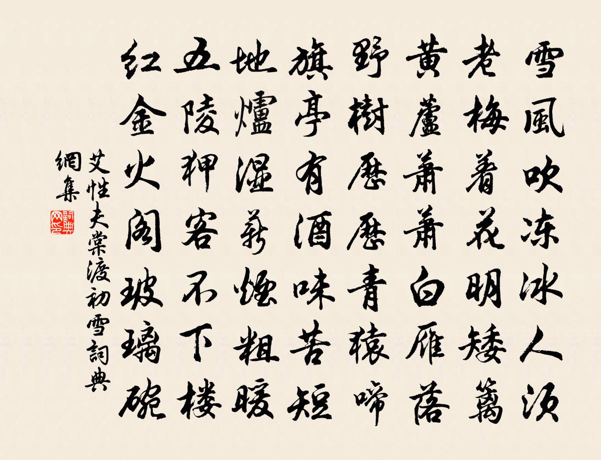 詩詞名句歷史字典書法欣賞書法字典國語詞典說文解字康熙字典古漢語字典標 題 作 者 詩 句 棠渡初雪作者:艾性夫 朝代:宋代棠渡初雪原文雪風吹凍冰人須,老梅著花明矮籬。黃蘆蕭蕭白雁落,野樹歷歷青猿啼。旗亭有酒味苦短,地爐濕薪煙粗暖。五陵狎客不下樓,紅金火閣玻璃盌。詩詞問答問:棠渡初雪的作者是誰?答:艾性夫問:棠渡初雪寫於哪個朝代?答:宋代問:棠渡初雪是什麼體裁?答:七古艾性夫棠渡初雪書法欣賞棠渡初雪書法作品詩詞推薦緣識宋太宗〔宋代〕真境堪依仗,周遷四敘移。人忙閒聖跡,心達罷狐疑。俊造皆流品,逢能即是師。二從寒暑變,龍浴鳳皇池。偈頌六十五首釋普濟〔宋代〕驗人眼,截流機。德山臨際,伏惟伏惟。病不能從沈德遠少卿草堂醵飲袁說友〔宋代〕溪南十里山,有客今淵明。歸來厭城市,著腳鷗鷺汀。客來笑談劇,日暮車馬行。我昔曾見之,浩氣猶憑陵。尊酒乙丑中秋與山僧數輩自虎邱靈岩泛太湖登洞庭史堯弼〔宋代〕七十二山湖面橫,橫斜出沒亂青冥。只疑亦有鈞天奏,驚起魚龍舞洞庭。松徑郭岩〔宋代〕一逕深且紆,森森蔭松柏。清風池上來,幽思與之發。逸響諧素琴,涼陰散清帙。弘景或可邀,高懷共披豁。和崇安壁間陳宓〔宋代〕人人盡道為貧驅,出不高車食不魚。陋巷最貧誰氏子,藜羹淪飯味詩書。夜泊牛渚趁薛八船不及孟浩然〔唐代〕星羅牛渚夕,風退鷁舟遲。浦漵嘗同宿,煙波忽間之。榜歌空里失,船火望中疑。明發泛潮海,茫茫何處期。望仙門張掄〔宋代〕紫微枝上露華濃。起秋風。管弦聲細出簾櫳。象筵中。仙酒斟雲液,山歌轉繞樑虹。此時佳會慶相逢。歡醉且從容幽居陸游〔宋代〕海澨結茆新,退藏常畏人。已侵垂老境,尚愛不貲身。丹灶長生藥,巢居上古民。秋來有奇事,鷗鷺日相親。上知府趙侍郎二首魏野〔宋代〕往哲英靈在,重生出鎮初。傳岩存舊跡,棠樹認前居。美化民歌實,流言帝覺虛。暫來淹外郡,再入老中書。善欲句宋光宗〔宋代〕晴進駐花侵路,春陂水上橋。意難忘·蜀道登天林正大〔宋代〕蜀道登天。望峨眉橫絕,石棧相連。西來當鳥道,逆浪俯回川。猿與鶴,莫攀緣。九折聳岩巒。算咫尺、捫參歷井西征回途中二絕張舜民〔宋代〕靈州城下千株柳,總被官軍斫作薪。他日玉關歸去路,將何攀折贈行人。連雨偶成二首蘇籀〔宋代〕檻欞生菌地生衣,釜甑有魚盤有薇。適俗簪袂取縈挽,累人口腹得嶇崎。行看海霧江雲盡,卻放風台月觀輝。撥置次韻和盛博士寄許州任從事之什楊億〔宋代〕射策曾攀郄桂枝,從軍猶賦仲宣詩。陳琳草檄應非久,貢禹彈冠素有期。梁苑勝游思霰雪,潯陽舊隱廢茅茨。初筵醉落魄(海棠)范成大〔宋代〕馬蹄塵撲。春風得意笙歌逐。款門不問誰家竹。只揀紅裝,高處燒銀燭。碧雞坊里花如屋。燕王宮下花成谷。不須徐祠曾碑久仆前山長鬍端逸與士友共豎之邀予陳杰〔宋代〕短世人間廈幾顛,高風湖上榻猶懸。荒涼士豎殘碑日,遼邈官修廢祀年。萬古南州人似玉,千秋曾子筆如椽。斯文楊南仲寓湖陳元晉〔宋代〕紛紛市道交,翻覆雲雨手。不如清風明月請,情分卻於人耐久。夫君不受塵土污,湖上結茅誰與處。坐中只著風月大雪入洛陽范祖禹〔宋代〕昨夜關山雪,僕夫晨起驚。揮鞭騎紫馬,曉入洛陽城。川原渺茫茫,長嘯視八紘。有如乘風馭,迢遞奔玉京。伊水游普濟寺王休〔宋代〕排險凌空入磴斜,參差金碧倚煙霞。一山門裡分三剎,萬柳湖邊帶幾家。世人無人吞粟棘,國中有佛吐蓮花。憑欄名句推薦玩人喪德,玩物喪志。佚名《尚書·周書·旅獒》 顛狂柳絮隨風去,輕薄桃花逐水流。杜甫《絕句漫興九首·其五》 奢侈者鮮有不敗李大師、李延壽《南史·列傳·卷四十五》 蘭葉春葳蕤,桂華秋皎潔。張九齡《感遇十二首·其一》 隔水氈鄉,落日牛羊下,區脫縱橫。張孝祥《六州歌頭·長淮望斷》 棠梨花映白楊樹,儘是死生別離處。白居易《寒食野望吟》 月落沙平江似練。望盡蘆花無雁。張炎《清平樂·候蛩淒斷》 月去疏簾才數尺,烏鵲驚飛,一片傷心白。宋琬《蝶戀花·旅月懷人》 今宵剩把銀釭照,猶恐相逢是夢中。晏幾道《鷓鴣天·彩袖殷勤捧玉鍾》 雍雍新雁咽寒聲,愁恨年年長相似。李煜《謝新恩·冉冉秋光留不住》
