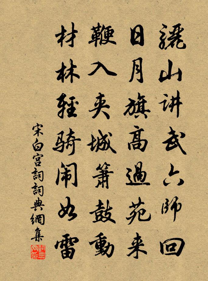 詩詞名句歷史字典書法欣賞書法字典國語詞典說文解字康熙字典古漢語字典標 題 作 者 詩 句 宮詞作者:宋白 朝代:宋代宮詞原文驪山講武六師回,日月旗高過苑來。鞭入夾城簫鼓動,材林輕騎鬧如雷。詩詞問答問:宮詞的作者是誰?答:宋白問:宮詞寫於哪個朝代?答:宋代宋白宮詞書法欣賞宮詞書法作品詩詞推薦題辛稼軒齋彭止〔宋代〕棋子聲乾案接塵,午窗詩夢暖於春。清風不動階前竹,誰道今朝有故人。北樓宋祁〔宋代〕危樓孤堞共巑岏,怒激號風結暝寒。校尉登臨非廣武,王孫回望即長安。來麰蔽隴蹊牛下,密綱橫山獵騎攢。梁霰題汪水雲詩卷十一首劉師復〔宋代〕別港鶯嬌恰恰啼,蘇公堤過趙公堤。水西雲北春無賴,細柳新蒲綠未齊。志未酬梁啓超〔清代〕志未酬,志未酬,問君之志幾時酬?志亦無儘量,酬亦無盡時。世界進步靡有止期,吾之希望亦靡有止期。眾生苦鷓鴣天汪元量〔宋代〕瀲灩湖光綠正肥。蘇堤十里柳絲垂。輕便燕子低低舞,小巧鶯兒恰恰啼。花似錦,酒成池。對花對酒兩相宜。水邊酬楊給事兼見贈台中沈佺期〔唐代〕子云推辨博,公理擅詞雄。始自尚書省,旋聞給事中。言從溫室秘,籍向瑣闈通。顧我叨郎署,慚無草奏功。分曹問塵清坐久之歸途偶得絕句陳文蔚〔宋代〕問塵清坐興悠哉,小立朱橋未忍回。好景吟情忽相契,小海流出柳陰來。啞子觀音贊釋子益〔宋代〕贊者舌禿,畫者口啞。籃里錦鱗,愈增高價。茶溪亭陶弼〔宋代〕茶溪亭上綠沿回,溪上孤城照水開。誰趁落潮離晚渡,自尋芳草上春台。年華有限忙中去,人事無涯暗裡來。安得四月初十日得蜂蠆繭絲之句方回〔宋代〕深言懼忤時,聊復一評之。靡暇防蜂蠆,惟工竭繭絲。因循終不恤,平定豈無期。麥赭秧田廢,人家半忍飢。秋懷連文鳳〔宋代〕茫茫秋水波,灼灼芙蓉姿。采之不盈菊,及此行樂時。陽鍅來南翔,玄鳥將西歸。羈旅獨牽營,泯默生窮思。美人寄福勝長老釋宗杲〔宋代〕真人十八界元空,三十一人同姓呂。分散游山各占山,三十一人又同處。【雙調】沉醉東風_釣台貂裘敝張可久〔元代〕釣台貂裘敝誰憐倦客,錦箋寒難寫秋懷。野水邊,閒雲外,盡教他鷗鷺驚猜。溪上良田得數頃來,也敢上嚴陵釣台秋晚十詠散策李彌遜〔宋代〕散棗經崗路,牛羊歸徑深。水窮人小立,山靜客微吟。點點稻花雨,團團榕葉陰。田翁罷爭席,明日共幽尋。西江月佚名〔宋代〕好個馬山居士,功名富貴浮雲。庵兒側傍萬杉陰。煙里時橫小艇。律中林鍾將半,華堂壽斝頻斟。聲聲齊祝百千齡泊府口陳造〔宋代〕建鄴重東南,爰從吳晉後。鎮戍分淮江,心腹運臂肘。我舟歷陽岸,煙外見鍾阜。問名良賓實,南渡此其口。龍蟠題烏江東隆山鄧氏亭賀鑄〔宋代〕逋客今何許,空餘接隱亭。舟隨潮水上,門背夕陽扃。兔策塵生蠹,漁蓑雨化螢。題詩岩下石,聊代草堂靈。七老會詩(杲年八十九)胡杲〔唐代〕閒居同會在三春,大抵愚年最出群。霜鬢不嫌杯酒興,白頭仍愛玉爐熏。裴回玩柳心猶健,老大看花意卻勤。鑿落別離情所鍾十二章章四句送定叟弟之官嚴陵張栻〔宋代〕嚴之水淪漪,其山復蒼蒼。子陵釣游地,草木有餘光。戲贈李十三判官白居易〔唐代〕垂鞭相送醉醺醺,遙見廬山指似君。想君初覺從軍樂,未愛香爐峰上雲。名句推薦以此虧奪民衣食之財,仁者弗為也。墨子《墨子·32章 非樂(上)》 天闕象緯逼,雲臥衣裳冷杜甫《游龍門奉先寺》 樹樹皆秋色,山山唯落暉。王績《野望》 數萼初含雪,孤標畫本難。崔道融《梅花》 嘆息老來交舊盡,睡來誰共午甌茶。陸游《幽居初夏》 記得武陵相見日,六年往事堪驚周紫芝《臨江仙·送光州曾使君》 民之歸仁也,猶水之就下、獸之走壙也。孟子《孟子·離婁章句上·第九節》 低花樹映小妝樓,春入眉心兩點愁。白居易《春詞》 江碧鳥逾白,山青花欲燃。杜甫《絕句二首》 殘燈孤枕夢,輕浪五更風。徐昌圖《臨江仙·飲散離亭西去》