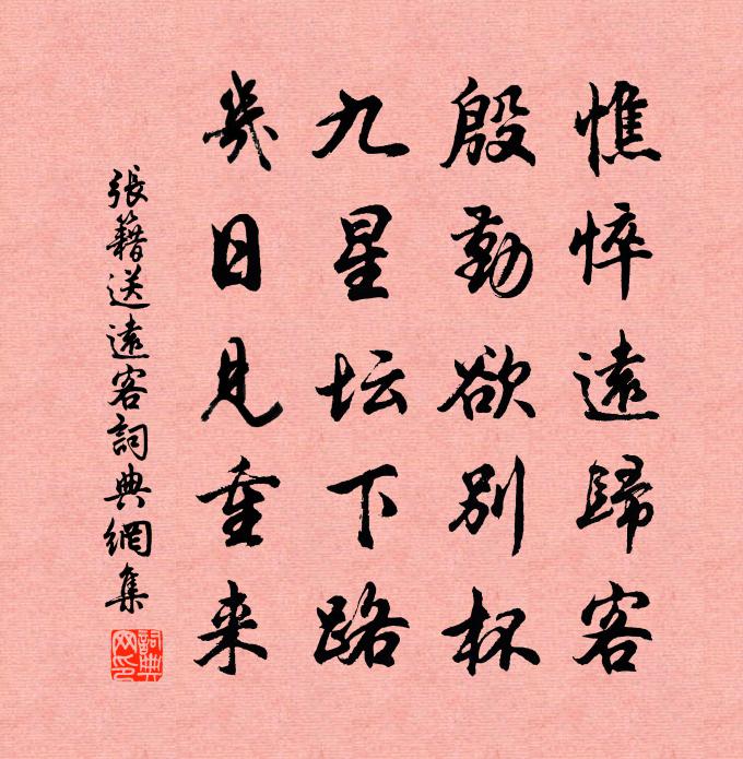 詩詞名句歷史字典書法欣賞書法字典國語詞典說文解字康熙字典古漢語字典標 題 作 者 詩 句 送遠客作者:張籍 朝代:唐代送遠客原文憔悴遠歸客,殷勤欲別杯。九星壇下路,幾日見重來。詩詞問答問:送遠客的作者是誰?答:張籍問:送遠客寫於哪個朝代?答:唐代問:張籍的名句有哪些?答:張籍名句大全張籍送遠客書法欣賞送遠客書法作品注釋全唐詩:卷386-13詩詞推薦陪師厚游百花洲盤礴範文正祠下道羊曇哭謝安黃庭堅〔宋代〕傷心祠下亭,在時公燕處。臨水不相猜,江鷗會人語。友人會宿李白〔唐代〕滌盪千古愁,留連百壺飲。良宵宜清談,皓月未能寢。醉來臥空山,天地即衾枕。小園陸游〔宋代〕窄窄柴門短短籬,山家隨分有園池。客因問字來攜酒,僧趁分題就賦詩。晨露每看花藟坼,夕陽頻見樹陰移。拂衣黑漆弩 為樂府焦元美賦,用馮海粟韻張可久〔元代〕畫船來向高沙駐。便上躡探梅吟屨。對金山有玉娉婷,兩點愁峰眉聚。倚西風目斷行雲,懶唱大江東去。借中郎爨忍辱仙人丘處機〔元代〕一澤天恩齊慶賀。群生地著無飢餓。愁態眉間都蹴破。還真箇。盈街堆畝收田課。醞酒邀賓時唱和。排筵看食重堆海上人知浴求頌釋正覺〔宋代〕溫溫氣象半篙津,匏杓調和冷暖勻。直得通身渾是水,端知赤肉了無塵。風埃面目揩磨淨,丘壑形骸洗濯春。妙觸趙州問牛跡圓澤扣角政黃牛平田婆贊釋紹曇〔宋代〕這畜從來惡跡多,角尖頭也解狂歌。橋邊白鷺擎拳聽,急殺耕田臭老婆。太皇太后合春帖子六首蘇頌〔宋代〕上壽春朝觀外庭,詔恩不許會公卿。即時二史書謙德,只使群官進姓名。西江月(九)張伯端〔宋代〕魚兔若還入手,自然忘卻筌蹄。渡河筏子上天梯。到彼悉皆遺棄。未悟須憑言說,悟來言說皆非。雖然四句屬無為白雲對月張鎮孫〔宋代〕萬山飛翠映瑤空,一抹晴霞淡復濃。何意海風吹不斷,歸鴉飛帶過前峰。二絕句張耒〔宋代〕幽窗老客寒無睡,長聽城樓曉角悲。萬里滄溟初浴日,暗雞先向草間知。少微山觀橘方岳〔宋代〕手劚蒼煙竹逕深,霜寒錯落萬黃金。何年共話商山舊,分種歸來欲滿林。寄盧子高二首蘇泂〔宋代〕君行甫郭門,我病已昏昏。嘔泄輒經日,芳薌空屢飱。每思今古易,終畏別離煩。向匪勤車馬,何因共一尊。安國置酒敬簡堂分韻得柳暗六春字張栻〔宋代〕公臥百尺樓,餘子可下瞰。我每奉談麈,汲古得探探。身外皆為余,此道要無憾。從渠梅雨天,陰晴遞明暗。和二十二弟龜山寺三絕晁說之〔宋代〕海岸石龜恨未平,時時入海自馮陵。此山磐礡清淮上,寶塔分功更就曾。寄奇父胡寅〔宋代〕似聞北舍與南鄰,各向西疇答問津。獨使丈人留闃寂,更無佳客奉光塵。思公待泛山陰雪,破悶須攜曲米春。往行仙掌齊己〔唐代〕峭形寒倚夕陽天,毛女蓮花翠影連。雲外自為高出手,人間誰合斗揮拳。鶴拋青漢來岩檜,僧隔黃河望頂煙。晴露偈頌四十一首釋普寧〔宋代〕圓同太虛,無欠無餘。良由取捨,所以不如。初夏題段郎中修竹里南園劉得仁〔唐代〕高人游息處,與此曲池連。密樹才春後,深山在目前。遠峰初絕雨,片石欲生煙。數有僧來宿,應緣靜好禪。莫飲酒梅堯臣〔宋代〕莫飲酒,酒豈讎,顏回不飲不白頭。千鍾稱帝堯,百觚號聖丘。定國數石無滯留,康成三百杯未休。阮籍作詩語更名句推薦世間最難得者兄弟。程登吉《幼學瓊林·卷二·兄弟》 枝枝相覆蓋,葉葉相交通。佚名《孔雀東南飛 / 古詩為焦仲卿妻作》 銜霜當路發,映雪擬寒開。何遜《詠早梅 / 揚州法曹梅花盛開》 長於春夢幾多時,散似秋雲無覓處。晏殊《木蘭花·燕鴻過後鶯歸去》 我當二十不得意,一心愁謝如枯蘭。李賀《開愁歌》 勤苦守恆業,始有數月糧。黃燮清《秋日田家雜詠》 丈夫處世兮立功名;立功名兮慰平生。慰平生兮吾將醉;吾將醉兮發狂吟!羅貫中《三國演義·第四十五回》 終然獨不見,流淚空自知。李白《獨不見》 物格而後知至,知至而後意誠,意誠而後心正,心正而後身修,身修而後家齊,家齊而後國治,國治而後天下平。曾子《禮記·大學》 冠蓋滿京華,斯人獨憔悴。杜甫《夢李白二首·其二》