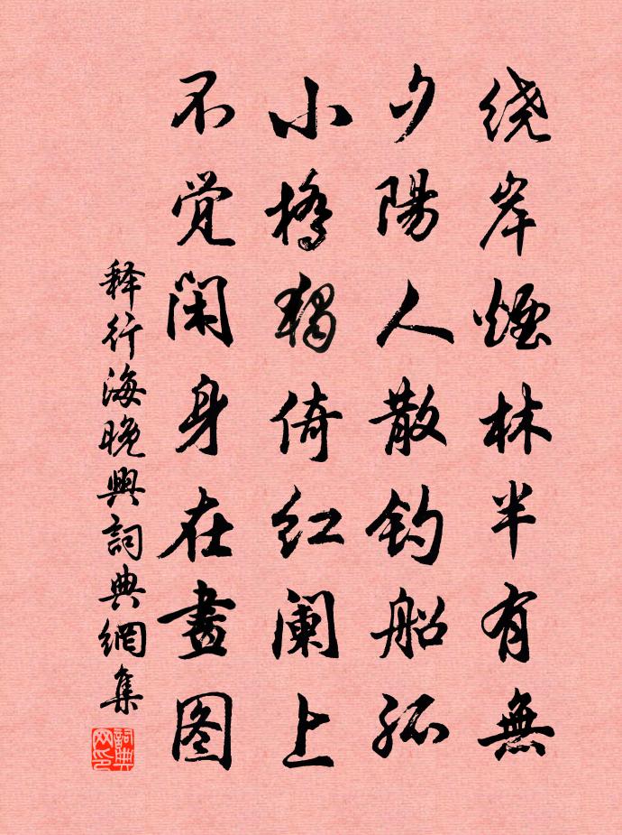 詩詞名句歷史字典書法欣賞書法字典國語詞典說文解字康熙字典古漢語字典標 題 作 者 詩 句 晚興作者:釋行海 朝代:宋代晚興原文繞岸煙林半有無,夕陽人散釣船孤。小橋獨倚紅闌上,不覺閒身在畫圖。詩詞問答問:晚興的作者是誰?答:釋行海問:晚興寫於哪個朝代?答:宋代釋行海晚興書法欣賞晚興書法作品詩詞推薦宿護法寺張勛〔宋代〕亂草織斜陽,天風結曉霜。搖鞭追馬足,投宿問僧房。望眼揮清淚,愁雲罩故疆。客帆更無數,不見祖生航。席上作李商隱〔唐代〕淡雲輕雨拂高唐,玉殿秋來夜正長。料得也應憐宋玉,一生惟事楚襄王。昭潭寄內人黃大受〔宋代〕不接安書動隔年,二千里外極懸懸。老親強健知勤饌,諸子痴頑恐費鞭。幸有田園堪卒歲,使知詩禮可無錢。客中送梵才大師歸天台趙概〔宋代〕建剎存真意,崇台表大因。中藏般若偈,外護赤城神。花雨長霏晝,松風自掃塵。媿心同范寧,蓮社阻相新。惜小園花白居易〔唐代〕曉來紅萼凋零盡,但見空枝四五株。前日狂風昨夜雨,殘芳更合得存無?早梅李公明〔宋代〕東風才了又西風,群木山中葉葉空。只有梅花吹不盡,依然新白抱新紅。雪中雪坡十憶姚勉〔宋代〕近水新栽一巷梅,而今雪裡想齊開。只愁夜後花幽獨,誰與攜筇踏月來。雁塔(開元八年,清河傅岩題此詩於雁塔)解彥融〔唐代〕崢嶸徹倒景,刻峭俯無地。勇進攀有緣,即嶮恐迷墜。窅然喪五蘊,蠢爾懷萬類。實際罔他尋,波羅必可致。南山月夜金陵懷古李白〔唐代〕蒼蒼金陵月,空懸帝王州。天文列宿在,霸業大江流。綠水絕馳道,青松摧古丘。台傾鳷鵲觀,宮沒鳳凰樓。別殿偈三首釋行機〔宋代〕仲秋八月旦,庭戶入新涼。不露風骨句,愁人知夜長。春遊五首邵雍〔宋代〕洛城春色浩無涯,春色城東又復嘉。風力緩搖千樹柳,水光輕盪半川花。煙清翡翠飛平岸,日暖鴛鴦下淺沙。不見本朝治衰高宗生馬廷鸞〔宋代〕歲逢淵獻感炎精,創業中興二主生。天啟高皇符藝祖,人將大觀擬天成。生民厭亂思平治,造物開先毓聖明。甲子重榮檜董嗣杲〔宋代〕一株蒼檜臥龍身,受得隋朝雨露深。地下仙根將換骨,人間劫火不燒心。死條節節蕃春信,生意枝枝蓊翠陰。此木天鑒韓偓〔唐代〕何勞諂笑學趨時,務實清修勝用機。猛虎十年搖尾立,蒼鷹一旦醒心飛。神依正道終潛衛,天鑒衷腸競不違。事歷永遇樂(綠陰)蔣捷〔宋代〕清逼池亭,潤侵山閣,雪氣凝聚。未有蟬前,已無蝶後,花事隨逝水。西園支徑,今朝重到,半礙醉筇吟袂。除非浣溪沙毛滂〔宋代〕本是青門學灌園。生涯渾在亂山前。一犁春雨種瓜田。別後倩雲遮鶴帳,來時和月寄漁船。旁人莫做長官看。于飛樂(別筵贈歌妓姊妹)毛滂〔宋代〕並梅兄,雙蝶子,煙縷衫輕。鳳凰釵、繚繞香雲。淡梳妝,□得恁,雪膩酥勻。揉春捻就,更是他、花與精神。黛懷友人孟貫〔唐代〕浮世況多事,飄流每嘆君。路岐何處去,訊息幾時聞。吟里落秋葉,望中生暮雲。孤懷誰慰我,夕鳥自成群。何郎中出黃公草書四首陳師道〔宋代〕當年闕里與論詩,晚歲河山斷夢思。妙手不為平世用,高懷猶有故人知。和陶勸農韻勉吾鄉之學者吳芾〔宋代〕縱得美官,人亦見鄙。若博群書,更堅素履。雖處常流,亦超塵軌。一旦進為,必兼眾美。名句推薦淡薄之士,必為濃艷者所疑洪應明《菜根譚·概論》 別院深深夏席清,石榴開遍透簾明。蘇舜欽《夏意》 萬物同宇而異體,無宜而有用為人,數也。荀子《荀子·富國》 君子有三樂,而王天下不與存焉。孟子《孟子·盡心章句上·第二十節》 莫信直中直,須防仁不仁。佚名《增廣賢文·上集》 李白乘舟將欲行,忽聞岸上踏歌聲。李白《贈汪倫》 古來存老馬,不必取長途。杜甫《江漢》 林下春晴風漸和,高崖殘雪已無多。王守仁《春晴》 梨花風起正清明,遊子尋春半出城。吳惟信《蘇堤清明即事》 綠杯紅袖趁重陽。人情似故鄉。晏幾道《阮郎歸·天邊金掌露成霜》