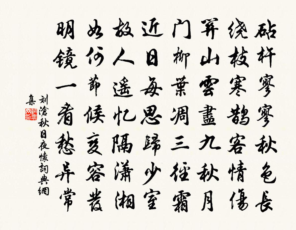 詩詞名句歷史字典書法欣賞書法字典國語詞典說文解字康熙字典古漢語字典標 題 作 者 詩 句 秋日夜懷作者:劉滄 朝代:唐代秋日夜懷原文砧杵寥寥秋色長,繞枝寒鵲客情傷。關山雲盡九秋月,門柳葉凋三徑霜。近日每思歸少室,故人遙憶隔瀟湘。如何節候變容發,明鏡一看愁異常。詩詞問答問:秋日夜懷的作者是誰?答:劉滄問:秋日夜懷寫於哪個朝代?答:唐代問:秋日夜懷是什麼體裁?答:七律劉滄秋日夜懷書法欣賞秋日夜懷書法作品注釋全唐詩:卷586-37詩詞推薦寄陳履常二首張耒〔宋代〕近聞彭澤令,旅飯寄招提。杜老不厭賦,韋郎猶愧妻。得州慚牧養,懷友負招攜。只學新詩好,高吟獨醉泥。吳王試劍石胡仲參〔宋代〕吳王鑄劍成,自謂古難比。試之高山巔,石裂斷橫理。那無昔時人,相逢干將里。故宮中白日長,春風野田百草香夜坐即事呈修竹監簿黃庚〔宋代〕一室冷於冰,秋高夜氣清。月窗攙燈影,風葉亂琴聲。寡慾知身健,安貧覺累輕。吟邊閒倚竹,誰識此時情。近故太師左丞相魏國文忠京公輓歌辭三首楊萬里〔宋代〕鎮蜀雙清獻,回天再子明。何曾動聲色,一笑付權衡。臨絕緣憂國,平生不近名。中興賢相傅,日月奪光精。孤山問梅顧逢〔宋代〕欲扣隴頭信,侵晨踏雪來。不知今夜裡,先放幾花開。地有孤根在,春從何處回。向人如解語,約我辦樽罍。秋寓都城次趙君瑞韻葛起耕〔宋代〕催破橙香薦蟹黃,快斟新酒潤詩腸。雁拖暝色橫秋水,鴉帶寒聲噪夕陽。萬事莫如花下醉,百年渾似夢中狂。登高秋日與張賓客舒著作同游龍門,醉中狂歌,凡白居易〔唐代〕秋天高高秋光清,秋風裊裊秋蟲鳴。嵩峰餘霞錦綺卷,伊水細浪鱗甲生。洛陽閒客知無數,少出遊山多在城。商嶺賢者之孝二百四十首李迥秀林同〔宋代〕生我者為母,無緣貴賤分。不思罵婢語,何可使親聞。奏宣列之樂歌舞江淹〔南北朝〕殷崇配天。周尊明祀。瑞合汾陰。慶同泰畤。青幕雲舒。丹殿霞起。二曜惟新。五精告始。於以享之。景福是履。次韻宋德器春晚即事五首李流謙〔宋代〕樓迥去筇久,庭閒轉榻頻。松衰無直乾,竹好但新筠。漫仁慚逋客,躬耕羨野人。可能千里意,端的為吳蓴。霹靂松鄧肅〔宋代〕老乾千年如削鐵,蟄龍釀春未肯泄。阿香推車動地來,振起虬髭上天闕。砰轟一聲驚倒人,雨勢更挽銀河傾。炎洲嘉泰二年題資州醮壇山星斗閣對是同王資州賈魏了翁〔宋代〕天磨團團任往還,莫將止處認兼山。水歸寒谷斂秋練,木落前峰明曉鬟。天度已歸參井後,日行又值斗箕間。若知永叔贈酒梅堯臣〔宋代〕大門多奇醞,一斗市錢千。貧食尚不足,欲飲將何緣。豈能以口腹,屈節事豪權。閉戶飽於齏,作詩涌如泉。一日寒食前一日發黃堰明日抵定夸連日逆風吹沙不趙蕃〔宋代〕故人留我過寒食,童重寧同所歷家。苦信長年貪道里,翻成五日滯風沙。擬從塔上占鈴語,又見雲間起砲車。立遍次兩知縣韻四首陳造〔宋代〕老去棲遲八品官,劍賾深悔誚田單。東鄰未省吟髭斷,笑擲牙牌命肉盤。秋雨陸游〔宋代〕雨滴何由止,人眠不復成。雲深無雁影,村近有砧聲。草草殘年夢,寥寥後世名。太山並螘垤,俱向酒中平。代梁總挽鄭舜舉侍郎四首劉宰〔宋代〕由來樂事在田園,歸路無人早著鞭。見一堂中誰是伴,亭亭修竹鎖蒼煙。薌林五十詠薌林楊萬里〔宋代〕一代薌林老,吾生不並時。來尋白玉柄,秪見紫蘭枝。覆巢行孟郊〔唐代〕荒城古木枝多枯,飛禽嗷嗷朝哺雛。枝傾巢覆雛墜地,烏鳶下啄更相呼。陽和發生均孕育,鳥獸有情知不足。枝危旅中雜興五首趙蕃〔宋代〕舊雪固已多,新雪翻增劇。立春已涉五,太昊猶辟易。長安有羈旅,無以度朝夕。所願見白日,歸舟泛深碧。名句推薦儒以文亂法,俠以武犯禁。韓非及後人《韓非子·五蠹》 念蘭堂紅燭,心長焰短,向人垂淚。晏殊《撼庭秋·別來音信千里》 楚水巴山江雨多,巴人能唱本鄉歌。劉禹錫《竹枝詞二首·其二》 迴廊遠砌生秋草,夢魂千里青門道。馮延巳《菩薩蠻·迴廊遠砌生秋草》 上林苑裡花徒發,細柳營前葉漫新。杜審言《春日京中有懷》 我心匪石,不可轉也。佚名《柏舟》 十二樓中盡曉妝,望仙樓上望君王。薛逢《宮詞》 我善養吾浩然之氣。孟子《孟子·公孫丑章句上·第二節》 霧柳暗時雲度月,露荷翻處水流螢。張元乾《浣溪沙·山繞平湖波撼城》 西湖又還春晚,水樹亂鶯啼。仲殊《訴衷情·寶月山作》