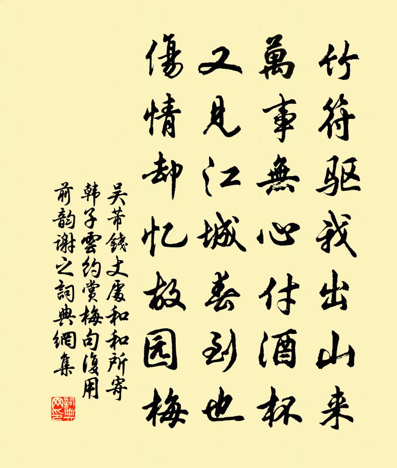 詩詞名句歷史字典書法欣賞書法字典國語詞典說文解字康熙字典古漢語字典標 題 作 者 詩 句 錢丈處和和所寄韓子云約賞梅句復用前韻謝之作者:吳芾 朝代:宋代原文竹符驅我出山來,萬事無心付酒杯。又見江城春到也,傷情卻憶故園梅。詩詞問答問:《錢丈處和和所寄韓子云約賞梅句復用前韻謝之》的作者是誰?答:吳芾問:該詩寫於哪個朝代?答:宋代書法欣賞錢丈處和和所寄韓子云約賞梅句復用前韻謝之書法作品詩文賞析【原題】:錢丈處和和所寄韓子云約賞梅句復用前韻謝之三首詩詞推薦送曹大著知廣德軍文天祥〔宋代〕暫屈瀛州客,來臨汭水民。山川歸史記,岳牧屬詞人。館舍朋簪舊,都門祖帳新。儒林官可紀,何止吏稱循。林少卿輓詩朱長文〔唐代〕壽考安榮遇聖朝,構成門戶自勤勞。閨中萊婦皆華發,膝下荀龍盡綠袍。堂有金籯身更約,案披玉簡道尤高。人間立春方岳〔宋代〕花柳胚胎午夜風,一尊聊與破紅封。醉余安用淄澠口,妙處元無涇渭胸。紙帳不知寒浩蕩,銀幡自愛雪蓬鬆。小樓偶得雙鯽陸游〔宋代〕今朝溪女留鮮鯽,灑掃茅檐旋置樽。養老不須煩祝鯁,從來楚俗慣魚餐。偈頌一百二十三首釋崇岳〔宋代〕薦福住院,事事萬現。露柱燈籠,三門佛殿。若上若下,和光同塵。有時又卻,神頭鬼面。題北固亭王奕〔宋代〕杜老當年識恨遺,與天爭漢死奚疑。伏羱猶憶分三日,老驥空悲混一時。往事竟隨東逝水,新題全是北來詩。如今竹園三首白玉蟾〔宋代〕一片琅玕香淨天,風吹細細雨娟娟。龍孫始學斑衣戲,鶖子從談玉版禪。贈楊監察四錫〔宋代〕昔日長安際會時,客情鄉思兩依依。金門次第俱升達,雲路高低各奮飛。御史班資知任重,諫官間綬愧才微。今來送方此山歸盤中黎廷瑞〔宋代〕渴不飲盜泉水,熱不棲惡木陰。飛蚊營營蚋漫漫,掇拾余醖搜殘斟。祝融老子亦忘劇,於君大是相知音。娛娛炎埃煮白酒送林治中鄭清之〔宋代〕長門思渴薦寒泉,浪讀松醪桂酒篇。數米釀來成玉洲,傳家方秘出金川。白飛瓊斚應歸重,紅滴珠槽敢忌前。聊遣扈從至奉先寺回宋祁〔宋代〕寶剎虹幡蔽曙霞,中天凝蹕轉雲車。不妨歸路王城遠,滿袖飛花雜雨花。正月趙璜〔唐代〕正月今朝半,陽台信未回。水芹寒不食,山杏雨應開。世網留三宿,真源寄一杯。因聲謝猿鳥,歲晏會歸來。滿江紅秦觀〔宋代〕風雨蕭蕭,長途上、春泥沒足。謾回首、青山無數,笑人勞碌。山下粉粉梅落粉,渡頭淼淼波搖綠。想小園、寂寞如夢令程垓〔宋代〕風入藕花翻動。夜氣與香俱縱。月又帶風來,涼意一襟誰共。情重。情重。可惜短宵無夢。和洪司令梅花吳泳〔宋代〕素肌香骨水為寒,曲樹斜枝木作酸。百匝繞花看未足,庭代參斗夜闌乾。百丈山袁陟〔宋代〕復嶺逾崷崒,層崖遍屈盤。寺當幽谷面,路指白雲端。樹老蒼天骨,藍凝上帝冠。右屏秋已凍,板屋夜多寒。三宿自君之出矣文同〔宋代〕自君之出矣,弔影度晨夕。中門一步地,未省有行跡。閨闈足儀檢,常恐犯繩尺。欲寄錦字書,知誰者雲的。驀山溪(早春壽京尹)傅自得〔宋代〕洪鈞轉處,都在薰陶內。瑞世得奇才,贊化工,協調和氣。雄詞健筆,談笑斡千鈞,餘閒手,尹王畿,治行稱尤異句卞震〔宋代〕詩債到春無處避,離愁因醉暫時無。句羅太亨〔宋代〕且追白社為耆會,縱買黃金肯少年。名句推薦閉門覓句陳無己,對客揮毫秦少游。黃庭堅《病起荊江亭即事》 萋萋芳草小樓西,雲壓雁聲低。劉基《眼兒媚·秋思》 雉雊麥苗秀,蠶眠桑葉稀。王維《渭川田家》 情者文之經,辭者理之緯;經正而後緯成,理定而後辭暢:此立文之本源也。劉勰《文心雕龍·情采》 昔聞洞庭水,今上岳陽樓杜甫《登岳陽樓》 為君持酒勸斜陽,且向花間留晚照。宋祁《玉樓春·春景》 高節志凌雲,不敢當滕六。環山樵《薛寶釵·雪竹》 君家玉女從小見,聞道如今畫不成。黃庭堅《謝張仲謀端午送巧作》 料想故園桃李,也應怨月愁風趙崇《清平樂·懷人》 吳興才人怨春風,桃花滿陌千里紅。李賀《送沈亞之歌·並序》