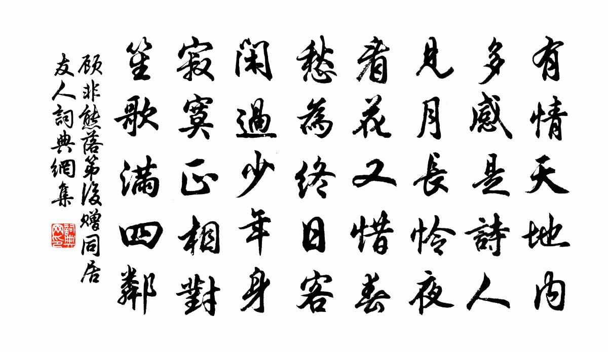詩詞名句歷史字典書法欣賞書法字典國語詞典說文解字康熙字典古漢語字典標 題 作 者 詩 句 落第後贈同居友人作者:顧非熊 朝代:唐代落第後贈同居友人原文有情天地內,多感是詩人。見月長憐夜,看花又惜春。愁為終日客,閒過少年身。寂寞正相對,笙歌滿四鄰。詩詞問答問:落第後贈同居友人的作者是誰?答:顧非熊問:落第後贈同居友人寫於哪個朝代?答:唐代問:落第後贈同居友人是什麼體裁?答:五律顧非熊落第後贈同居友人書法欣賞落第後贈同居友人書法作品注釋全唐詩:卷509-35詩詞推薦席上有唱歐公送劉原甫辭者次日又有唱東坡三晁說之〔宋代〕龍門不見鬢垂絲,莫唱平山楊柳辭。縱使前聲君忍聽,後聲惱殺木腸兒。水龍吟(越調梨花)周邦彥〔宋代〕素肌應怯余寒,艷陽占立青蕪地。樊川照日,靈關遮路,殘紅斂避。傳火樓台,妒花風雨,長門深閉。亞簾櫳半濕【正宮】醉太平 出浴圖顧鑒中〔元代〕盪春心火燒,沐天露油澆。侍兒扶起一團嬌,掩雙酥鳳綃。杏花淺露胭脂萼,雞頭新剝珍珠寶,海堂微隱禍根苗,次韻馬駒父晚菊五絕喻良能〔宋代〕嫩黃初破未凋殘,風露相禁曉色寒。欲並墨梅兼墨竹,何人為作畫圖看。車船無名〔元代〕北人善駕車,南人善使船。易地而為之,船覆車也顛。人生不相習,勉絕也徒然。琴歌先秦無名〔先秦〕百里奚。初娶我時五羊皮。臨當相別烹乳雞。今適富貴忘我為。和友人晚出池上宋庠〔宋代〕節物更徂候,幽衿屬釣台。蘭苕兼佩長,桂葉學旗開。鵲避驚弦去,魚隨晚餌來。謝塘多藻思,弭蓋一相陪。以桃並酒餉賈之奇曹勛〔宋代〕家園有桃瓮有酒,取以先餉國正公。定能百杯步兵飲,可助一枕羲黃風。句王琪〔宋代〕露槿東西照,風荷向背愁。同諸友山行分袂言別五首程公許〔宋代〕大面窈深處,神仙碧玉壺。孫郎妙心眼,催作後山圖。賦四相詩門下侍郎平章事王縉皇甫澈〔唐代〕舟楫濟巨川,山河資秀氣。服膺究儒業,屈指取高位。北征戮驕悍,東守輯攜貳。論道致巍巍,持衡無事事。知己次韻蘇和父自郫見寄魏了翁〔宋代〕敬共事明德,懍如盤水持。豈惟將弗勝,抑恐濁且茲。結髮齒名官,幾被末俗移。學睎遷商博,文慕莊騷為。書不樓居狂吟吳龍翰〔宋代〕樓間丹壁富藏書,誤學相如賣子虛。何不買牛勤教子,邵平瓜地要人鋤。又五首邵雍〔宋代〕萬物有精英,人為萬物靈,必先詳事體,然後論人情。氣靜形安樂,心閒身太平。伊耆治天下,不出此名生。挽孺人雷氏曾豐〔宋代〕箕帚當人室,繅紉起我家。所羞轑釜爾,其憚下機邪。剪髻戶盈屨,斷絲書滿車。天何奪之速,不待服褕霞。句張仲方〔唐代〕入門池色靜,登閣雨聲來。謝潔齋惠爐瓶馬廷鸞〔宋代〕午夢驚殘撥白灰,滿盤雲篆拂輕煤。金猊對舞輪囷吐,曾挹天香鼻觀來。再次首唱韻和楊億〔宋代〕碧樹銀塘接畫樓,天人誰肯降瓊輈。三山密信傳青雀,五日歸鞍躍紫騮。郢酒泛冰星弁側,吳歈倚瑟黛蛾愁。雲峰滿庭芳 破迷馬鈺〔元代〕名成鬼利遂,男鬼婚女娉。鬼不覺容衰霜鬢。轉使**,豈想大限將近。小鬼傍觀失笑,且從他、殘喘胡騁。忽染悼離贈妹詩二首 一左思〔魏晉〕鬱郁岱青。海瀆所經。 * 神靈。為祥為禎。峨峨令妹。應期挺生。如蘭之秀。如芝之榮。總角岐嶷。齠齔夙成。名句推薦山中何所有,嶺上多白雲。陶弘景《詔問山中何所有賦詩以答》 國無九年之蓄曰不足,無六年之蓄曰急,無三年之蓄曰國非其國也。戴聖《禮記·王制》 青山相待,白雲相愛,夢不到紫羅袍共黃金帶宋方壺《山坡羊·道情》 斜日更穿簾幕,微涼漸入梧桐。晏殊《破陣子·燕子欲歸時節》 風風雨雨梨花,窄索簾櫳,巧小窗紗。喬吉《折桂令·客窗清明》 醉里且貪歡笑,要愁那得工夫。辛棄疾《西江月·遣興》 為報今年春色好。花光月影宜相照。李清照《蝶戀花·上巳召親族》 慷慨十年長劍在,登樓一笑暮山橫。崔允《花馬池詠》 一民之軌,莫如法。厲官威名,退淫殆,止詐偽,莫如刑。刑重,則不敢以貴易賤;法審,則上尊而不侵。韓非及後人《韓非子·有度》 國君好仁,天下無敵焉。孟子《孟子·盡心章句下·第四節》
