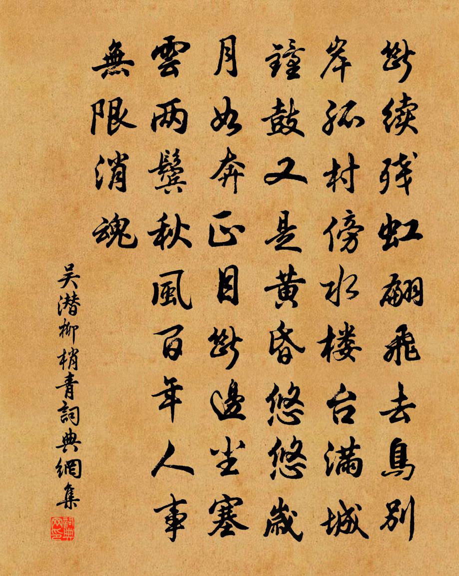 斷續殘虹,翩飛去鳥,別岸孤村。傍水樓台,滿城鐘鼓,又是黃昏。