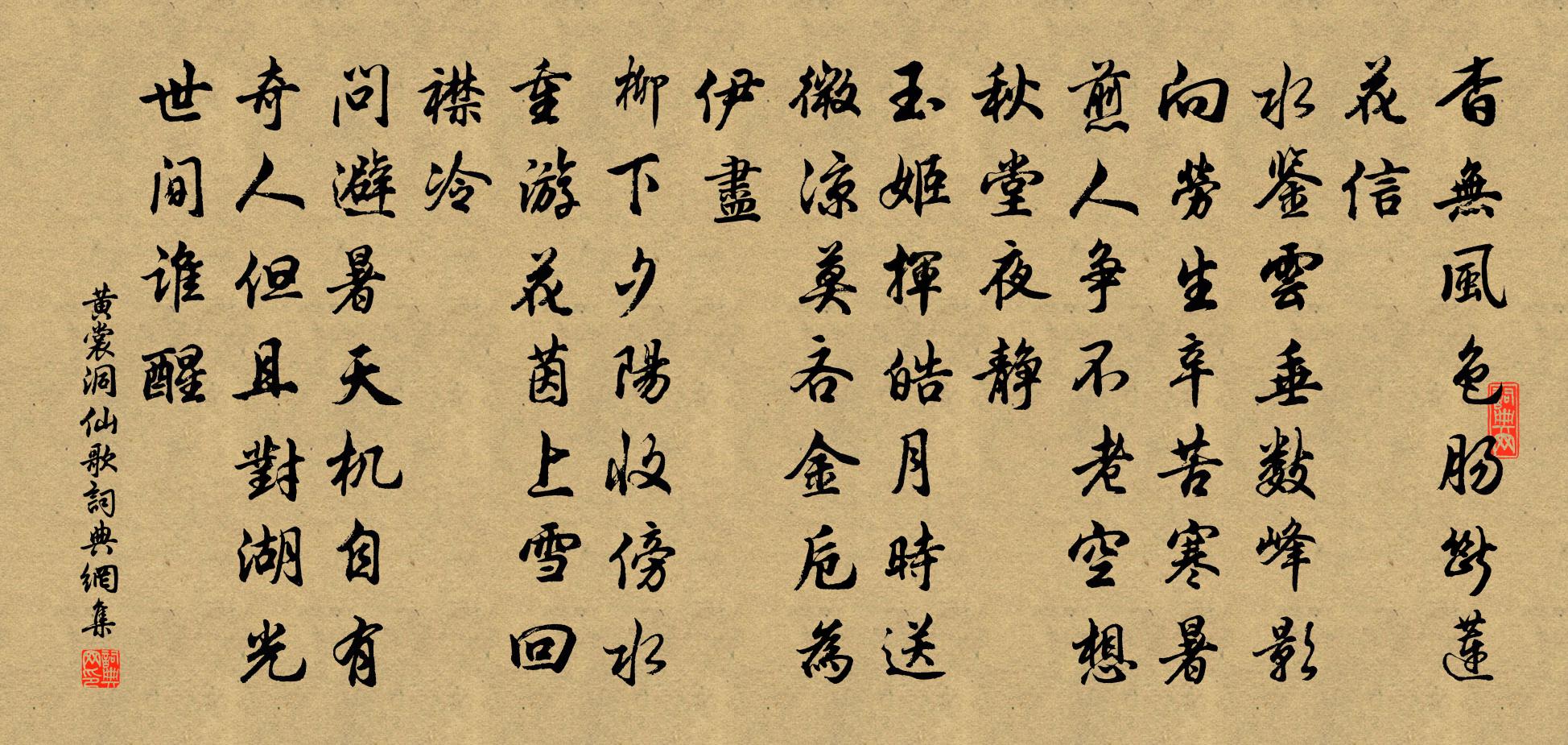 詩詞名句歷史字典書法欣賞書法字典國語詞典說文解字康熙字典古漢語字典標 題 作 者 詩 句 洞仙歌作者:黃裳 朝代:宋代洞仙歌原文杳無風色,腸斷蓮花信。水鑒雲垂數峰影。向勞生辛苦,寒暑煎人,爭不老,空想秋堂夜靜。玉姬揮皓月,時送微涼,莫吝金卮為伊盡。柳下夕陽收,傍水重遊,花茵上、雪回襟冷。問避暑天機、自有奇人,但且對湖光,世間誰醒。詩詞問答問:洞仙歌的作者是誰?答:黃裳問:洞仙歌寫於哪個朝代?答:宋代問:洞仙歌是什麼體裁?答:詞黃裳洞仙歌書法欣賞洞仙歌書法作品詩詞推薦再寄洪皓〔宋代〕樽酒遙期共細傾,孫郎假道莫貪程。科名雖已追何僅,隱語尤當繼子荊。上巳與二客游水月洞分韻得事字劉克莊〔宋代〕勝踐造物慳,貧交世情棄。昔戒十客來,旦無一人至。惟余暨兩君,鼎足坐水次。歡言天氣佳,誰謂風土異。高吟題浣川戴栩〔宋代〕五十知非雪鬢鮮,尚將疏褊謫塵緣。近來萬境心如洗,笑改斜川作浣川。滿庭芳佚名〔宋代〕歸去袋來兮,不袋如歸去,袋算來都是便宜。也無煩惱,也沒是和非。選個岩前淨處,好袋個、小小庵兒。黃昏後七兄以庚戌重陽前解江東常平印泝江而歸先寄周必大〔宋代〕早日常同席,中間屢話離。呂梁今破夢,曹發共深期。菊圃新開徑,茅齋正築基。不妨風雨夜,酌酒更論詩。寄四明閭丘道士二首貫休〔唐代〕淮海兵荒日,分飛直至今。知擔諸子出,卻入四明深。衣必編仙草,僧應共栗林。秋風溪上路,應得一相尋。三千客中夜雨柴望〔宋代〕離情先怯向邊州,寒葉敲窗更報秋。幾點攪殘千里夢,一聲滴作兩鄉愁。苦緣楊柳沾離席,偏傍梧桐濺小樓。惟有戲和東坡先生牛尾貍詩韻且效其體虞儔〔宋代〕夜寒那得到簾帷,前擁紅爐後翠眉。未致馬蹄沙水鱉,且嘗牛尾雪天貍。葅寒石芥愁辛鼻,鮓熟雛鵝怯帶脂。端的太皇太后合春帖子六首蘇頌〔宋代〕聖詔頒寬大,天恩遍邇遐。雷風孚號令,草木動萌芽。江上楓成彥雄〔唐代〕江楓自蓊鬱,不競松筠力。一葉落漁家,殘陽帶秋色。中書侍郎傅公輓詞范祖禹〔宋代〕岩野為霖後,千年復有人。累朝推鯁直,二聖倚經綸。盡瘁憂民色,孤忠許國身。徐公德不變,可使俗還淳。柳枝詞十三首司馬光〔宋代〕五柳先生門作開,宅邊植杖久徘徊。陌頭遙認顏光祿,詰旦先乘瘦馬來。齊天樂(左綿道中)陸游〔宋代〕角殘鍾晚關山路,行人乍依孤店。塞月征塵,鞭絲帽影,常把流年虛占。藏鴉柳暗。嘆輕負鶯花,謾勞書劍。事往和文與可洋州園亭三十詠其二十五寒蘆港蘇轍〔宋代〕蘆深可 * ,下有扁舟泊。正似洞庭風,日暮孤帆落。歸李江州後寄別王氏程洛賓〔唐代〕魚雁回時寫報音,難憑銼櫱數年心。雖然情斷沙吒後,爭奈平生怨恨深。河內詩二首李商隱〔唐代〕鼉鼓沉沉虬水咽,秦絲不上蠻弦絕。常娥衣薄不禁寒,蟾蜍夜艷秋河月。碧城冷落空濛煙,簾輕幕重金鉤欄。靈香別齊安稅務窗竹二絕張耒〔宋代〕隨流泛梗雖無定,別渚棲鴻亦有情。為問竹窗清夜月,從今誰解聽秋聲。初賜幡勝戲和諸公二首孔武仲〔宋代〕鏤幡剪勝喜傾朝,不問紆藍與珥貂。群玉參差排晚日,萬花瑣碎動春霄。蕙風已轉東郊綠,柳雪猶低北苑條。從此太博同年葉兄紓以詩及建茶為貺家有蜀箋二軸司馬光〔宋代〕西來萬里浣花箋,舒捲雲霞照手鮮。書笥久藏無可稱,願投詩客助新編。刑台懷古洪邁〔宋代〕蕞爾邢侯國,巍然昭義軍。未能為晉重,忽已被梁分。壤沃連三郡,時移出四君。蒼茫懷古意,群醜謾紛紜。名句推薦念蘭堂紅燭,心長焰短,向人垂淚。晏殊《撼庭秋·別來音信千里》 杏樹壇邊漁父,桃花源里人家。王維《田園樂七首·其三》 黎明即起,灑掃庭除,要內外整潔;既昏便息,關鎖門戶,必親自檢點。朱柏廬《朱子家訓·全文》 喧鳥覆春洲,雜英滿芳甸。謝朓《晚登三山還望京邑》 醉折殘梅一兩枝,不妨桃李自逢時。陸游《落梅》 春城無處不飛花,寒食東風御柳斜。韓翃《寒食 / 寒食日即事》 言不中法者,不聽也;行不中法者,不高也;事不中法者,不為也。商鞅《商君書·君臣》 就解佩旗亭,故人相遇。吳文英《掃花游·西湖寒食》 憑高遠望,見家鄉、只在白雲深處。王瀾《念奴嬌·避地溢江書於新亭》 空勞縴手,解佩贈情人。牛希濟《臨江仙·柳帶搖風漢水濱》