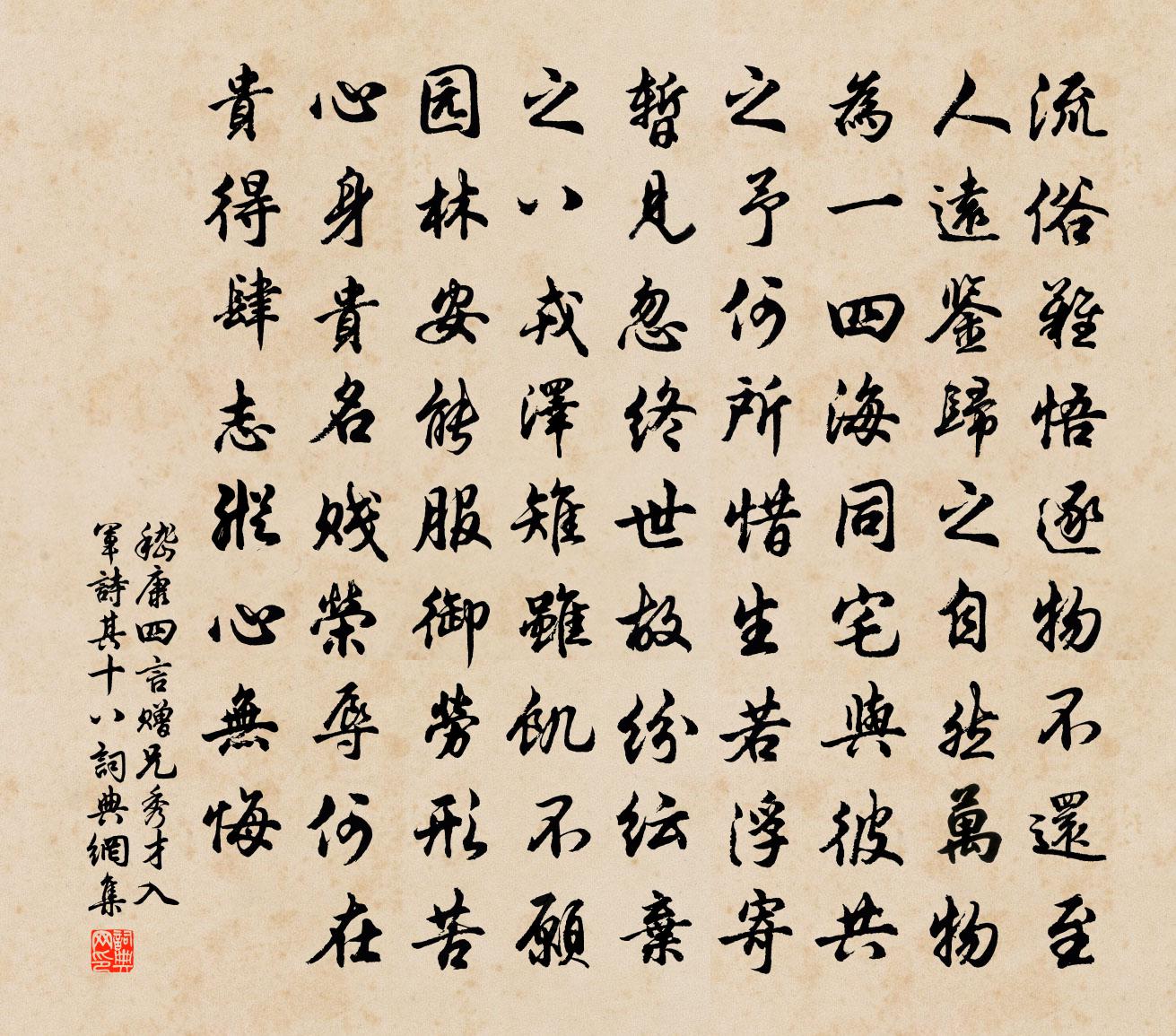 詩詞名句歷史字典書法欣賞書法字典國語詞典說文解字康熙字典古漢語字典標 題 作 者 詩 句 四言贈兄秀才入軍詩 其十八作者:嵇康 朝代:兩漢原文流俗難悟。逐物不還。至人遠鑒。歸之自然。萬物為一。四海同宅。與彼共之。予何所惜。生若浮寄。暫見忽終。世故紛紜。棄之八戎。澤雉雖飢。不願園林。安能服御。勞形苦心。身貴名賤。榮辱何在。貴得肆志。縱心無悔。詩詞問答問:《四言贈兄秀才入軍詩 其十八》的作者是誰?答:嵇康問:該詩寫於哪個朝代?答:兩漢書法欣賞四言贈兄秀才入軍詩 其十八書法作品詩詞推薦宿直宋祁〔宋代〕三重仙閣道家山,寓直由來恧素餐。漏近章溝先報暝,樹連溫省未知寒。蘭釭靜對朱花結,芒帙閒披白蠹乾。前膝偈頌一百二十三首釋普度〔宋代〕今朝五月五,諸方盡鳴鼓。不說藥病相治,便說書符呪士。金山伎倆既無,未免別行一路。日輪當午。賦梅堂閒吟陳宓〔宋代〕窮冬天意似奢華,白璧明珠剩作花。付與東風向何處,恩勤不為五侯家。梅花仇遠〔宋代〕為怕緇塵染素衣,凍痕封蕊放春遲。月來忽送闌乾影,春到不分南北枝。啼夢翠禽依樹宿,斷魂玉笛隔花吹。任他頌古十四首釋師體〔宋代〕門庭推倒亂縱橫,火迸星飛無路行。赤契分明基業在,依前淺種又深耕。嘲飛卿七首段成式〔唐代〕曾見當壚一個人,入時裝束好腰身。少年花蒂多芳思,只向詩中寫取真。醉袂幾侵魚子纈,飄纓長罥鳳凰釵。知君感春連文鳳〔宋代〕賞心未足事多違,啼鳥聲聲怨夕暉。客夢一番芳草歇,人生幾度落花飛。病難為別鄉情遠,老不禁愁酒力微。猶記謝趙昌父投贈詩卷喻良能〔宋代〕趙子有新作,鼎珍初出庖。端能工競病,寧復費推敲。白戰應難敵,清臞亦任嘲。風流前輩盡,試合續弦膠。夜坐鄭剛中〔宋代〕酒軟剛腸愁脈脈,夜靜微風搖老柏。七星插卯雲縱橫,月影昏昏半牆白。雪用歐陽公白戰律,仍禁用映雪訪戴等故事,楊萬里〔宋代〕細聽棄仍有,貪看立又行。落時晨卻暗,積處夜還明。幸自漫山好,何如到夏清。似知吾黨意,未遣日華晴。此樂文同〔宋代〕吏散收簿書,公館如山居。歸來換野服,攜策將焉如。園亭極瀟灑,陰森修竹下。拂石坐終日,徒倚不知夜。山月抱膝仇遠〔宋代〕抱膝坐終日,澹然忘是非。縱令官未滿,已與世相違。古道平蕪合,誰家新燕歸。年荒煙火歇,空老一山薇。贈竹十韻陸游〔宋代〕放翁小築湖西偏,虛窗曲檻無炎天。人間乃有真富貴,遶舍十萬碧玉椽。連林娟娟泫清露,高枝裊裊搖蒼煙。常憂奉和幸三會寺應制李乂〔唐代〕睿德總無邊,神皋擇勝緣。二儀齊法駕,三會禮香筵。漢闕中黃近,秦山太白連。台疑觀鳥日,池似刻鯨年。滿月女貧苦難妍洪邁〔宋代〕女貧苦難妍,士貧苦難高。了知論此者,不識一切豪。此身百斛鼎,流俗欲手操。寧當舍其中,侷促計所遭。頗疑東山彭澤鄧林〔宋代〕氣靈風鶴屐折齒,壁後寘人汗如洗。樵漁雜沓坐林間。蜉蝣塵埃不可攀,石頭擾擾柴桑閒。酬微之開拆新樓初畢相報末聯見戲之作白居易〔唐代〕海山鬱郁石稜稜,新豁高居正好登。南臨贍部三千界,東對蓬宮十二層。報我樓成秋望月,把君詩讀夜回燈。無妨孤標上人留宿真山民〔宋代〕山僧留我宿,我亦似山僧。香茗半甌雪,寒虀一籌冰。廊風響黃葉,壁雨暗青燈。參透詩三昧,何須契一乘。風入松 梅花謝應芳〔元代〕歲寒心事舊相知。相別去年時。如今重觀春風面,此年時、消瘦些兒。天上玉堂何在,人間金鼎頻移。風塵不染素南柯子/南歌子曾揆〔宋代〕桐葉涼生夜,藕花香滿時。幾多離思有誰知。遙望盈盈一水、抵天涯。雨灑征衣淚,月顰分鏡眉。相逢又是隔年期名句推薦試問鄉關何處是,水雲浩蕩迷南北。趙鼎《滿江紅·丁未九月南渡泊舟儀真江口作》 曾把梨花,寂寞淚闌乾朱淑真《江城子·賞春》 篇之彪炳,章無疵也;章之明靡,句無玷也;句之清英,字不妄也。劉勰《文心雕龍·章句》 大膽天下去得,小心寸步難行。馮夢龍《警世通言·卷二十一》 思君如隴水,長聞嗚咽聲。雍裕之《自君之出矣》 輕寒細雨情何限。不道春難管。秦觀《虞美人·碧桃天上栽和露》 無處不傷心,輕塵在玉琴。納蘭性德《菩薩蠻·蕭蕭幾葉風兼雨》 衰楊古柳,幾經攀折,憔悴楚宮腰柳永《少年游·參差煙樹灞陵橋》 玉帛朝回望帝鄉,烏孫歸去不稱王常建《塞下曲四首·其一》 無功不賞,無罪不罰。荀子《荀子·王制》