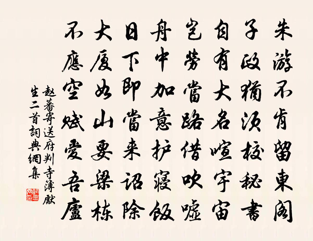 詩詞名句歷史字典書法欣賞書法字典國語詞典說文解字康熙字典古漢語字典標 題 作 者 詩 句 寄送府判寺簿先生二首作者:趙蕃 朝代:宋代寄送府判寺簿先生二首原文朱游不肯留東閣,子政猶須校秘書。自有大名喧宇宙,豈勞當路借吹噓。舟中加意護寢飯,日下即當來詔除。大廈如山要梁棟,不應空賦愛吾廬。詩詞問答問:寄送府判寺簿先生二首的作者是誰?答:趙蕃問:寄送府判寺簿先生二首寫於哪個朝代?答:宋代趙蕃寄送府判寺簿先生二首書法欣賞寄送府判寺簿先生二首書法作品詩詞推薦國人諺佚名〔遼代〕五個翁翁四百歲,南面北面頓瞌睡。 自己精神管不得,有甚心情管女真。 挽李舒州二首趙蕃〔宋代〕忽報舒州逝,深同海內傷。平泉無草木,北海漫文章。要作人琴嘆,空懷道路長。臨風為之慟,發色變蒼蒼。病中作陸游〔宋代〕浮世寄酣枕,勞生居漏船。已悲身老大,更著病沈綿。親舊動千里,歡娛無百年。床頭周易在,端擬絕韋編。憶舊遊(聞雁)劉應幾〔宋代〕記銅駝載酒,翠陌 * ,曾聽相呼。不盡離離意,覺柔腸如剪,立馬踟躕。人生似此蒼鬢,禁得幾聲疏。想怨入秋皇帝聽講尚書徹太清樓錫宴夏竦〔宋代〕洛書初罷講,漢苑特開筵。將許陪旒扆,先容況簡編。神宗遺札啟,真祖實文宣。密坐瞻堯日,凝心聽舜弦。賜花憶昨呈元老吳則禮〔宋代〕憶昨參戎幕,交情子獨真。共為關塞客,各負水雲身。跡遠金閨籍,衣沾玉壘塵。雕鞍暮橫槊,錦幄曉行春。隱几贈姊韋璜〔唐代〕修短各有分,浮華亦非真。斷腸泉壤下,幽憂難具陳。淒淒白楊風,日暮堪愁人。去年余佐京口遇王嘉叟從張魏公督師過焉魏公陸游〔宋代〕河亭挈手共徘徊,萬事寧非有數哉!黃閣相君三黜去,青雲學士一麾來。中原故老知誰在,南嶽新丘共此哀。火冷觀何君寶畫梅堯臣〔宋代〕燕馬易畫,吳牛難圖。馬骨隱細牛骨麤,馬毛厚密牛毛疏。麤疏必辨別,細密多模胡。乃知戴嵩筆,能出韓乾徒。峽石鋪范成大〔宋代〕峰頭壁立偉天造,萬雉石城如帶繞。山骨鱗皴火種難,山下流泉卻宜稻。新秧一棱綠茸茸,茅花先秋雪搖風。後皇和黃戶曹投贈二首劉克莊〔宋代〕羞問胡奴乞米炊,君恩朴斷老儋祠。蚤賡殿閣微涼作,晚課田園雜興詩。洛下共游無在者,岩頭末句欲傳誰。天公南歌子洪适〔宋代〕頑健輸村老,嬉遊付後生。七旬才有五清明。須趁良辰美景、繞園行。雲意將飛雪,天心未肯晴。難將性命作人情獐猿鄭獬〔宋代〕翠樹不從青嶂出,蟠根卻向屏中生。黃獐引脰探綠葉,老猿護雛枝上驚。獝然相顧見異態,誰言野物能忘情。我來劍池李峴〔唐代〕闔閭葬日勞人力,嬴政穿來役鬼功。澄碧尚疑神物在,等閒雷雨起潭中。贈臨川嚴泰伯秀才楊萬里〔宋代〕臨汝嚴夫子,搘筇扣敝廬。文如漆園壯,人似客星孤。善相遺驎瘦,深參得腹腴。行看最先進,辨論詘諸儒。緣識宋太宗〔宋代〕任從寒暑鎮常侵,一氣韜藏萬種心。堪笑愚痴澆盪甚,卻非淳樸不幽深。和宇文漢州□□氣房樓記詩魏了翁〔宋代〕房公胸中妙刀尺,翦刻玻璃貯寒碧。今侯著樓於其上,竹色荷光得良覿。詩來殷勤問故侯,別日雖賒情轉密。因思旅次滑台投獻陸侍御許棠〔唐代〕已是鴻來日,堪驚卻背秦。天遙三楚樹,路遠兩河人。旅夢難歸隱,吟魂不在身。霜台欹冠豸,賴許往來頻。文蔚侍者請贊釋崇岳〔宋代〕心粗膽大,少實多虛。瞎衲僧眼,斷肘後符。臨濟東山之道命若懸絲,念念刀耕火種老此殘軀。寥落林泉意自殊。和徐季功墨梅王之道〔宋代〕便是朱唇素麵,那知綠葉青枝。淨幾明窗展處,微風淡月醒時。名句推薦一年將盡夜,萬里未歸人。戴叔倫《除夜宿石頭驛》 為惜故人去,復憐嘶馬愁。高適《送魏八》 梨花院落溶溶月,柳絮池塘淡淡風。晏殊《無題·油壁香車不再逢》 日用必須簡省,杜奢端,即以昭儉德。王永彬《圍爐夜話·第八三則》 尺之木必有節目,寸之玉必有瑕適。呂不韋《呂氏春秋·覽·離俗覽》 中年親友難別,絲竹緩離愁。蘇軾《水調歌頭·安石在東海》 秋天一夜靜無雲,斷續鴻聲到曉聞。張仲素《秋閨思二首》 治國常富,而亂國常貧。管仲《管子·治國》 侯門一入深如海,從此蕭郎是路人。崔郊《贈去婢》 粗繒大布裹生涯,腹有詩書氣自華。蘇軾《和董傳留別》
