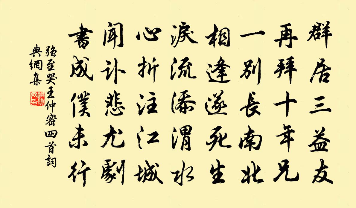 詩詞名句歷史字典書法欣賞書法字典國語詞典說文解字康熙字典古漢語字典標 題 作 者 詩 句 哭王仲密四首作者:強至 朝代:宋代哭王仲密四首原文群居三益友,再拜十年兄。一別長南北,相逢遂死生。淚流添渭水,心折注江城。聞訃悲尤劇,書成仆未行。詩詞問答問:哭王仲密四首的作者是誰?答:強至問:哭王仲密四首寫於哪個朝代?答:宋代強至哭王仲密四首書法欣賞哭王仲密四首書法作品詩詞推薦妻子第一百四十六文天祥〔宋代〕妻子隔絕久,飄颻若埃塵。漠漠世間黑,性命由他人。寄林平山顧逢〔宋代〕登高先一日,扶病強相辭。幾度懷君處,孤燈獨坐時。爐溫余篆在,雞唱和聲隨。安得相同醉,狂歌別後詩。壽宮使余丞相楊炎正〔宋代〕間世生英傑,呈時瑞幅員。昔為天下宰,今作地行仙。帝渴梅調鼎,民思楫濟川。元戎辭屏翰,珍館逸林泉。勳業口號十首呈程殿撰陳造〔宋代〕福地常披十幅圖,仙翁隱處玉為壺。九華山側雙峰下,還許儂家半席無。劉僕射東山集學騷江淹〔南北朝〕含秋一顧。眇然山中。檀欒循□。便娟來風。木瑟瑟兮氣芬蒀。石戔戔兮水成文。擿江崖之素草。窺海岫之青雲。天台萬年山羅漢樹林憲〔宋代〕羅漢嶺頭羅漢樹,開闢余工所鍾聚。百圍直上摩紫霄,鐵剝犀空自無蠹。積年魔怪不敢棲,暫過鸞凰卻回顧。初晴蒙恩易鎮豫章丐假還鄉途中偶成十七首吳芾〔宋代〕觸目盡陂塘,山光接水光。近來仍雨足,莫道是山鄉。鷓鴣天(王婉)趙彥端〔宋代〕未有年光好破瓜。綠珠嬌小翠鬟丫。清肌瑩骨能香玉,艷質英姿解語花。釵插鳳,鬢堆鴉。舞腰春柳受風斜。有時書事吳則禮〔宋代〕溪北溪南梅樹枝,斬新華萼出疏籬。獨憐醉處錦成幄,端恨愁時雪打圍。老夫不奈羽觴急,幽討未辜春日遲。慚愧游鍾阜呈同集諸公張祁〔宋代〕曉出白下門,東山聳孱顏。脫身廛市中,辦此一日閒。西風忽凜冽,秋容著堅頑。煙樹小搖落,寒雲起斕斑。但驚辛亥二月望祭齋公因游甘園朱繼芳〔宋代〕海棠陰下小徘徊,屐齒深深一徑苔。忽聽銅鉦花外近,園丁說是主人來。紀夢趙文〔宋代〕既不夢於我,胡然無一言。形容那可認,骨發想俱存。淚盡血猶滴,霧開山尚昏。相看憐稚子,老病莫銷魂。漫浪翁張耒〔宋代〕堂書有書萬卷,園有竹千竿。逍遙於其間,漫浪追昔賢。乃祖首陽人,疾世餓空山。堂堂秘書公,赤手犯鯨鱣。後寄東湖溥侍者釋智愚〔宋代〕聲前未舉已先知,曾用輸機陷國師。險處與誰分勝負,苹花汀草暗相宜。雜曲歌辭鳳歸雲滕潛〔唐代〕金井欄邊見羽儀,梧桐樹上宿寒枝。五陵公子憐文彩,畫與佳人刺繡衣。飲啄蓬山最上頭,和煙飛下禁城秋。曾將情詩其九倉央嘉措〔清代〕欲倚綠窗伴卿卿,頗悔今生誤道行。有心持缽叢林去,又負美人一片情。迢迢高樓和紫煙曹勛〔宋代〕迢迢高樓入紫煙,上連阿閣巢青鸞。青鸞飛飛不復返,朱甍碧瓦空般般。而今燕雀互棲止,便便飽逸嗤鷹鸇。黃金我昔題南莊壁晁說之〔宋代〕我昔柴門宜樂只,田園遠近亦康哉。花搖笠頂唱歌去,草塞瓶頭沽酒來。白叟披衣論甲子,青禽哺乳占莓苔。豈期次韻李元老柬王令周簿喜雨陳棣〔宋代〕山色雲容潑墨深,隨車甘澍濕衣襟。神龍應禱方施力,虐魃為殃漫有心。洗出篔簹無滯暑,養成{禾罷}稏有餘陰宴楊駙馬山池(一作陳羽詩,又作朱灣詩)韓翃〔唐代〕垂楊拂岸草茸茸,繡戶簾前花影重。鱠下玉盤紅縷細,酒開金瓮綠醅濃。中朝駙馬何平叔,南國詞人陸士龍。落日名句推薦女慕貞潔,男效才良。周興嗣《千字文·全文》 人而無儀,不死何為?佚名《相鼠》 葉上初陽乾宿雨、水面清圓,一一風荷舉。周邦彥《蘇幕遮·燎沉香》 屏卻相思,近來知道都無益。王國維《點絳唇·屏卻相思》 義人在上,天下必治。墨子《墨子·35章 非命(上)》 天下三分明月夜,二分無賴是揚州。徐凝《憶揚州》 草樹知春不久歸,百般紅紫斗芳菲。韓愈《晚春》 試上吳門窺郡郭,清明幾處有新煙。張繼《閭門即事》 狡兔盡則良犬烹,敵國滅則謀臣亡。韓非及後人《韓非子·內儲說下六微》 漸近燕山。回首鄉關歸路難。蔣氏女《減字木蘭花·題雄州驛》