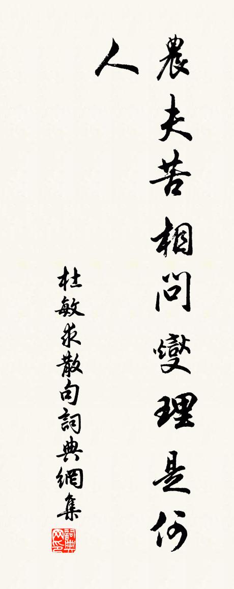 詩詞名句歷史字典書法欣賞書法字典國語詞典說文解字康熙字典古漢語字典標 題 作 者 詩 句 句作者:杜敏求 朝代:宋代句原文農夫苦相問,燮理是何人。詩詞問答問:句的作者是誰?答:杜敏求問:句寫於哪個朝代?答:宋代杜敏求句書法欣賞句書法作品詩詞推薦岩桂花徐介軒〔宋代〕翠葉金華小膽瓶,輕拈微嗅不勝情。從教失陷沈煙冷,驀地薰心夢也清。湖州歌九十八首 其三十四汪元量〔宋代〕宰執連鑣向北行,淮南夜夜鬼燈青。雖然適意無南北,生死難逃篩下星。胡武平遺牡丹一盤梅堯臣〔宋代〕疇昔居洛陽,看盡名園花。臨水復蔭竹,艷色照彤霞。良友相與至,競飲歡無涯。而今猶老翁,鬢髮但未華。昨日送饒守萬仲衡葬次山園韻陶夢桂〔宋代〕塵埃滿面雪蒙頭,只合滄洲把釣釣。鄉里故人今日少,山川英氣一時收。絕憐逝者成千古,誰念淒其老一邱。野店尋詩方岳〔宋代〕蹇驢踏雪灞橋春,畫出茅茨野水濱。才見梅花詩便好,梅花卻是定詩人。十九兄郡樓有宴病不赴杜牧〔唐代〕十二層樓敞畫檐,連雲歌盡草纖纖。空堂病怯階前月,燕子嗔垂一行簾。和吳龍圖韻五首洗竹文同〔宋代〕斤斧從來到此稀,為撩疏密繞藩籬。已繁不用饒新筍,縱礙何妨惜舊枝。風外清音聞曲閣,月中寒影下方池。想公送雍郢州李端〔唐代〕厭郎思出守,遂領漢東軍。望月逢殷浩,緣江送范雲。城閒菸草遍,浦迥雪林分。誰伴樓中宿,吟詩估客聞。寶公井曾極〔宋代〕一片當街百尺深,行人環轍免苔侵。塵容俗狀暫窺影,欲汲寒泉洗此心。淨居院陳岩〔宋代〕繚白縈青照眼波,芙蓉出沒在天河。不因雲影閒來去,安得春山熊度多。寄太白禪師張蠙〔唐代〕何年萬仞頂,獨有坐禪僧。客上應無路,人傳或見燈。齋廚唯有橡,講石任生藤。遙想東林社,如師誰復能。問秋光白居易〔唐代〕殷卿領北鎮,崔尹開南幕。外事信為榮,中懷未必樂。何如不才者,兀兀無所作。不引窗下琴,即舉池上酌。淡交次韻答吳江周縣尉飲垂虹見寄范成大〔宋代〕垂虹亭上角巾傾,鼉怒龍吟醉不聽。安得對君浮大白,想應嗤我汗新青。夢魂舞蝶隨春草,時節賓鴻點暮汀。湖海春日即事吳晦之〔宋代〕山居無事到襟懷,日午柴門尚未開。啼鳥一聲春晝寂,隔牆風送落花來。新漕道中趙蕃〔宋代〕夜雨響屋瓦,曙煙遮樹林。田行疑倍滑,水度覺知深。顧望勞雙目,顛躋怖此心。垂堂不知戒,家故乏千金。題闕里呂蒙正〔宋代〕南沂西泗繞晴霞,北岱東蒙擁翠華。萬里冠裳王者會,千年鄒魯聖人家。高從蔽日無巢鳥,古碣埋雲半吐花。瞻望寄杜北山顧逢〔宋代〕住與老逋鄰,空湖隔市塵。布衣安破屋,白髮守清貧。引鶴風穿袖,聽猿月滿身。五言吟得苦,一字不投人。春色三首項安世〔宋代〕花因實盛村村有,樹為花繁處處明。浩蕩九州春色里,輸他桃李最多情。論俗詩四首何耕〔宋代〕傷人利己事多端,唆訟尤為第一般。二競力疲俱願息,中人未了又經官。緣識宋太宗〔宋代〕堅心不退道皆同,元始天尊大教通。多是世人迷自惑,豈能容易見仙蹤。名句推薦逕直夫何細!橋危可免扶?楊萬里《寒食上冢》 人煙寒橘柚,秋色老梧桐。李白《秋登宣城謝朓北樓》 黃金燃桂盡,壯志逐年衰。孟浩然《秦中感秋寄遠上人 / 秦中寄遠上人》 狗吠深巷中,雞鳴桑樹顛。陶淵明《歸園田居·其一》 子用私道者家必亂,臣用私義者國必危。劉向《戰國策·趙二·趙燕後胡服》 霜威出塞早,雲色渡河秋。李白《太原早秋》 好風憑藉力,送我上青雲。曹雪芹《臨江仙·柳絮》 君子之所貴者,遷善懼其不及,改惡恐其有餘。徐幹《中論·上卷·虛道》 天不為人之惡寒也輟冬,地不為人之惡遼遠也輟廣,君子不為小人之匈匈也輟行。荀子《荀子·天論》 言者所以在意,得意而忘言。莊子《莊子·雜篇·外物》