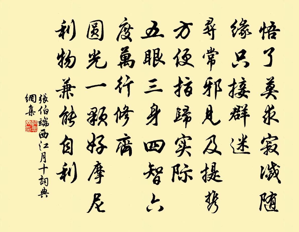 詩詞名句歷史字典書法欣賞書法字典國語詞典說文解字康熙字典古漢語字典標 題 作 者 詩 句 西江月(十)作者:張伯端 朝代:宋代西江月(十)原文悟了莫求寂滅,隨緣只接群迷。尋常邪見及提攜。方便指歸實際。五眼三身四智,六度萬行修齊。圓光一顆好摩尼。利物兼能自利。詩詞問答問:西江月(十)的作者是誰?答:張伯端問:西江月(十)寫於哪個朝代?答:宋代問:西江月(十)是什麼體裁?答:詞張伯端西江月(十)書法欣賞西江月(十)書法作品詩詞推薦又次韻二首廖行之〔宋代〕幾日春寒似禁菸,杜門渾欲任流年。得錢相覓非難辦,載酒來過定孰先。無奈梅邊虛勝踐,遙憐柳外漲晴川。佳時豆葉黃/憶王孫呂渭老〔宋代〕晚妝新試碧衫涼。金鴨猶殘昨夜香。柳際風來月滿廊。一雙雙。人對鴛鴦浴小塘。詠懷阮籍〔魏晉〕平生少年時,輕薄好弦歌。西遊鹹陽中,趙李相經過。娛樂未終極,白日忽蹉跎。驅馬復來歸,反顧望三河。黃金夢觀牡丹陸游〔宋代〕忘卻晨梳滿把絲,楝花嫌不似臙脂。起來一笑看清鏡,惟插梨花卻較宜。送崔五太守王維〔唐代〕長安廄吏來到門,朱文露網動行軒。黃花縣西九折坂,玉樹宮南五丈原。褒斜谷中不容幰,唯有白雲當露冕。子午北海題渚宮竇儼〔宋代〕紀南南望水城寬,水色天光混一般。大抵江鄉足詩景,詠吟如把畫圖看。挽施文叔三首趙蕃〔宋代〕豈但吾州少,端如四海稀。儒椅據根柢,玉德著光輝。不遇寧渠戚,傳亡始謂非。及今何所語,徒有淚沾衣。曲江漁者得鱖魚棄之目為師婆魚朱翌〔宋代〕巨口細鱗初出綱,{左魚右辟}皮玳瑁乃斑。了無骨鯁人人喜,更搗鹽虀發笑顏。擬古其四李白〔唐代〕清都綠玉樹,灼爍瑤台春。攀花弄秀色,遠贈天仙人。香風送紫蕊,直到扶桑津。取掇世上艷,所貴心之珍。相思子規來鵠〔唐代〕雨恨花愁同此冤,啼時聞處正春繁。千聲萬血誰哀爾,爭得如花笑不言。十一夜無寐懷九日南山之游方回〔宋代〕代步僅一馬,奄忽乏敝帷。扶輿陟南山,幸有淵明兒。樹陰玩苔蘚,稍讀古板碑。江湖豈無人,不如僧能詩。穩坐吳宮殷堯藩〔唐代〕吳王愛歌舞,夜夜醉嬋娟。見日吹紅燭,和塵掃翠鈿。徒令勾踐霸,不信子胥賢。莫問長洲草,荒涼無限年。水西葉氏園袁說友〔宋代〕風月欲在眼,園林須傍家。崚嶒飛翠巘,颭灩舞綃花。門近山光入,堂深樹影斜。猶將小西景,更為石林夸。念奴嬌朱敦儒〔宋代〕老來可喜,是歷遍人間,諳知物外。看透虛空,將恨海愁山,一時挼碎。免被花迷,不為酒困,到處惺惺地。飽來觀石魚趙汝廩〔宋代〕預喜金穰驗石鱗,○能免俗且怡神。曉行鯨背占前夢,瑞絕龜陵知幾春。拂石已無題字處,觀魚皆是願豐人。片雲除夕次東坡守歲韻楊蟠〔宋代〕人生無百年,誰問嶺龜蛇。容顏鏡水換,老醜不可遮。殷勤守此歲,來歲復如何。南鄰祭竈喧,北里驅儺嘩。須臾武侯廟(廟在白帝西郊)杜甫〔唐代〕遺廟丹青落,空山草木長。猶聞辭後主,不復臥南陽。鄂渚送池州程使君劉長卿〔唐代〕蕭蕭五馬動,欲別謝臨川。落日蕪湖色,空山梅冶煙。江湖通廨舍,楚老拜戈船。風化東南滿,行舟來去傳。呈水心先生趙汝回〔宋代〕鶴骨雖癯發未斑,秋風鷗鷺共修間。芙蓉夾徑纏通馬,楊柳沿池不礙山。外稿定於何日上,中興只在十年間。谷城將離柯山十月二十七日張耒〔宋代〕去此定有期,逝將泛扁舟。千里須聚糧,尚復少遲留。雖有隸囚籍,聊喜脫遐陬。問我行何之,岱宗古東州。念我名句推薦白雲依靜渚,春草閉閒門。劉長卿《尋南溪常山道人隱居 / 尋南溪常道士》 不用憑欄苦回首,故鄉七十五長亭。杜牧《題齊安城樓》 求人須求大丈夫,濟人須濟急時無。佚名《增廣賢文·上集》 紙屏石枕竹方床,手倦拋書午夢長。蔡確《夏日登車蓋亭》 耕夫召募愛樓船,春草青青萬項田;張繼《閭門即事》 報答春光知有處,應須美酒送生涯。杜甫《江畔獨步尋花七絕句》 綠葉青跗映丹萼,與君裴回上金閣。王勃《落花落》 半生已分孤眠過,山枕檀痕涴。納蘭性德《虞美人·曲闌深處重相見》 梅子黃時日日晴,小溪泛盡卻山行曾幾《三衢道中》 江春不肯留歸客,草色青青送馬蹄。劉長卿《送李判官之潤州行營》