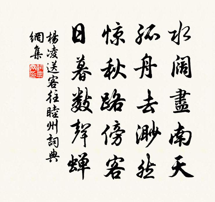 詩詞名句歷史字典書法欣賞書法字典國語詞典說文解字康熙字典古漢語字典標 題 作 者 詩 句 送客往睦州作者:楊凌 朝代:唐代送客往睦州原文水闊盡南天,孤舟去渺然。驚秋路傍客,日暮數聲蟬。詩詞問答問:送客往睦州的作者是誰?答:楊凌問:送客往睦州寫於哪個朝代?答:唐代問:送客往睦州是什麼體裁?答:五絕楊凌送客往睦州書法欣賞送客往睦州書法作品注釋全唐詩:卷291_8詩詞推薦幸秦始皇陵李顯〔唐代〕眷言君失德,驪邑想秦餘。政煩方改篆,愚俗乃焚書。阿房久已滅,閣道遂成墟。欲厭東南氣,翻傷掩鮑車。和卷中韓子蒼梅花三首蘇籀〔宋代〕凍卉雖臞甚,含英山意催。斲冰沖曉色,綻綠透春回。健步故人信,流芳好事杯。不論山水僻,往往拾香來。春從天上來佚名〔宋代〕日月高奔。這奧妙機,塵世難聞。太一壺中,清江谷口,芝草發蘭薰。看金蓮佳景,吐慶雲、開顯生門。道惟尊。玉清壇鮑溶〔唐代〕上陽宮裡女,玉色楚人多。西信無因得,東遊奈樂何。買舟王鎡〔宋代〕赤闌橋上路,幾度卜歸期。流水無休日,行人有老時。潮來江勢逆,月出海門遲。風順輕舟快,蒲帆盡夜吹。上尚郎中劉鑒〔宋代〕衰年何用響錚錚,一錯元來鑄不成。為役誰憐燭之武,浮言枉累鐵元城。鑠金有口難從眾,轑釜無羹枉怨兄。一點秋中夜坐李昌符〔唐代〕空庭吟坐久,爽氣入荷衣。病葉先秋落,驚禽背月飛。瘴雲晴未散,戍客老將依。為應金門策,多應說戰機。胡笳曲二首曹勛〔宋代〕漢使通沙漠,胡人過渭橋。春風吹客恨,千里去迢迢。隨州沙溪黃載〔宋代〕石路崎嶇石瀨鳴,峰巒回合小原平。桑麻積雨肥春壠,雞犬一村喧晝晴。田婦共攜中飯去,樵童相喚上山聲。邊頭窮劫曲先秦無名〔先秦〕王耶王耶何乖劣。不顧宗廟聽讒孽。任用無忌多所殺。誅夷白氏族幾滅。二子東奔適吳越。吳王哀痛助忉怛。垂涕寄廬陵劉國博會孟先輩連文鳳〔宋代〕吁嗟天地何夢中,魈{魎外換其}日夜噓寒風。萬物元氣銷鑠盡,文章千古無時窮。先生驅文挾風雨,筆勢不傍心颺稻行章甫〔宋代〕屋頭場地如鏡光,未是攻相呼來破場。今年慚愧好天色,颺稻得風尤省力。分時往往只論{上竹下差},主客四六寄張十八白居易〔唐代〕飢止一簟食,渴止一壺漿。出入止一馬,寢興止一床。此外無長物,於我有若亡。胡然不知足,名利心遑遑。念茲沁園春(癸卯佛生翼日,將戟,夢中有作。既醒,但易數字)劉克莊〔宋代〕有個頭陀,形等枯株,心猶死灰。幸春山筍賤,無人爭吃,夜爐芋美,與客同煨。何處幡花,忽相導引,莫是天宮和答鞏提乾見賀浙東總戎姜特立〔宋代〕黜陟何嘗取耳邊,旋栽花木學平泉。二年竊食祠官冷,一日頒恩寶篆鮮。閫寄暫居油幕副,朋從遙憶竹林賢。詩筒無題廖行之〔宋代〕州牧誰能舉,邦人願借情。聲名簡宸扆,恩信著湘城。龐統才何陋,班超策故平。何如今別駕,膏澤與江橫。新晴丘葵〔宋代〕新晴登{倍左換山}嶁,欣此凍初解。春風入條肄,枯卉依然在。有美北山薇,良苗正堪采。我欲攜短筐,悠悠隔百寶妝長筌子〔元代〕榴蕊濃芳,簾幕半卷,清閒白晝偏長。院宇無塵,微雨過池塘。幽軒細細,風披竹欹,石枕藤床。分外涼。看雲峰頌古二十七首釋雲賁〔宋代〕以何為體呵呵笑,推倒當頭陷 * 。鳥帶香從花里出,龍含雨向洞中歸。謝楊景山送酒器黃庭堅〔宋代〕楊君喜我梨花盞,卻念初無注酒魁。矲矮金壺肯持送,挼莎殘菊更傳杯。名句推薦想見讀書頭已白,隔溪猿哭瘴溪藤。黃庭堅《寄黃幾復》 從別後,憶相逢,幾回魂夢與君同。晏幾道《鷓鴣天·彩袖殷勤捧玉鍾》 王母歡闌瓊宴罷,仙人淚滿金盤側。文天祥《滿江紅·代王夫人作》 春風試手先梅蕊,頩姿冷艷明沙水。趙令畤《菩薩蠻·春風試手先梅蕊》 如絲苣甲飣春盤,韭葉金黃雪未乾。張耒《春日·如絲苣甲飣春盤》 虛負凌雲萬丈才,一生襟抱未曾開。崔珏《哭李商隱》 唯器與名,不可以假人左丘明《左傳·成公·成公二年》 湘江兩岸花木深,美人不見愁人心。盧仝《有所思》 不見又思量,見了還依舊。李之儀《謝池春·殘寒銷盡》 治於神者,眾人不知其功;爭於明者,眾人知之。墨子《墨子·50章 公輸》