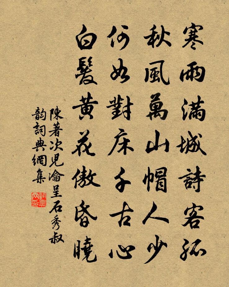 詩詞名句歷史字典書法欣賞書法字典國語詞典說文解字康熙字典古漢語字典標 題 作 者 詩 句 次兒瀹呈石秀叔韻作者:陳著 朝代:宋代次兒瀹呈石秀叔韻原文寒雨滿城詩客孤,秋風萬山帽人少。何如對床千古心,白髮黃花傲昏曉。詩詞問答問:次兒瀹呈石秀叔韻的作者是誰?答:陳著問:次兒瀹呈石秀叔韻寫於哪個朝代?答:宋代陳著次兒瀹呈石秀叔韻書法欣賞次兒瀹呈石秀叔韻書法作品詩詞推薦雜歌呈鄭錫司空文明李端〔唐代〕昨宵夢到亡何鄉,忽見一人山之陽。高冠長劍立石堂,鬢眉颯爽瞳子方。胡麻作飯瓊作漿,素書一帙在柏床。啖我會霜晴詩陳深〔宋代〕朝暾上高樹,霧卷第天遙。勁氣乘寒凝,嚴威見日鎖。鍾清出遠寺,馬滑恐危橋。稍逼南枝暖,疏花破寂寥。潘恭叔欲歸壽其母夫人謝子暢以事客其館辭病趙蕃〔宋代〕伏暑推不去,秋風來何暮。深居謝巾幘,適意親杖屨。緬懷江湖游,悵望南北路。舊交已如隔,新知孰成故。龐公水調歌頭梁啓超〔清代〕拍碎雙玉斗,慷慨一何多。滿腔都是血淚,無處著悲歌。三百年來王氣,滿目山河依舊,人事竟如何?百戶尚牛酒清夜施樞〔宋代〕客身隨取止,一室冷如冰。景遠吟何托,情疏夢不曾。雨粘初蘚壁,風謝欲花燈。豈是無家者,甘為有發僧。偈頌一百零四首釋紹曇〔宋代〕寂寞萬峰頭,佳節成虛度。貧無一盞燈,好有多般事。洞山姜索價太穹,無縫塔入門辯主。廁籌子動地放光,利市過比干墓聶夷中〔唐代〕殷辛帝天下,厭為天下尊。乾綱既一斷,賢愚無二門。佞是福身本,忠作喪己源。餓虎不食子,人無骨肉恩。日影簡徐判院潘檉〔宋代〕風誼崢嶸昔未親,正懸一榻待高人。當年曾接東萊話,今日寧嫌北阮貧。世味梅花開野水,詩情馬首沒黃塵。何時戲詠村居陸游〔宋代〕馬跡車聲斷已無,鄰翁笑語自相呼。衣裁大布如亭長,船設低篷學釣徒。愍物慾師僧施食,畏人愁報吏催租。陳蕃寄兄呂希純〔宋代〕江南江北來,昨夜同枝宿。平明一聲起,回顧已極目。和子由四首 韓太祝送游太山蘇軾〔宋代〕偶作郊原十日游,未應回首厭籠囚。但教塵土驅馳足,終把雲山爛漫酬。聞道逢春思濯錦,更須到處覓菟裘。恨君次韻原仲竹劉子翬〔宋代〕夕煙浮野圃,春竹過鄰牆。石澗深深影,風軒遠遠涼。禪心敲有韻,翠袖倚生香。不有冰霜勁,蒿萊到汝長。陸侍石右得祠歸里往餞弗及寄以是詩趙汝回〔宋代〕三以囊封入紫微,一星今夜出朗闈。賈誼幸無湘水謫,知章乞得鏡湖歸。乘潮不等詩人別,望闕恨憂諫者稀。笠澤頌古二十七首釋雲賁〔宋代〕一雨一陰風未和,春從不快里消磨。桃花暗已隨流水,空使劉郎惆悵多。和虞永康梅花十絕句魏了翁〔宋代〕世間無物可談空,開落榮枯實理同。百樹好花一編易,主人立處儼當中。送戴徵士還山李端〔唐代〕柔桑錦臆雉,相送到煙霞。獨隱空山里,閒門幾樹花。草生楊柳岸,鳥囀竹林家。不是謀生拙,無為末路賒。明道親享先農十首佚名〔宋代〕冕服地御,壇壝有儀。陟降左右,天惟敢思。秋夜聞砧杜荀鶴〔唐代〕荒涼客舍眠秋色,砧杵家家弄月明。不及巴山聽猿夜,三聲中有不愁聲。簡雲臥趙崇鉘〔宋代〕憶君心事如流水,流向江頭作暮潮。想得潮平沙有雪,白鏗鐵版和 * 。贈黃虛舟李曾伯〔宋代〕君不見君家知命今師日,白衫騎驢人不識。當時畫作梁園圖,惟有龍眠老仙筆。又不見異時知命離戌州,終身原學名句推薦心事孤山春夢在,到思量、猶斷詩魂吳文英《極相思·題陳藏一水月梅扇》 猶憐慣去國,疑是夢還家。盧僎《歲晚還京台望城闕成口號先贈交親》 不蹶于山,而蹶於垤,則細微宜防也。王永彬《圍爐夜話·第五二則》 羈心積秋晨,晨積展游眺。謝靈運《七里瀨》 頌其詩,讀其書,不知其人,可乎?是以論其世也。孟子《孟子·萬章章句下·第八節》 卻看妻子愁何在,漫捲詩書喜欲狂杜甫《聞官軍收河南河北》 君疑臣則臣必死。羅貫中《三國演義·第一百一十九回》 曉風不散愁千點,宿雨還添淚一痕。曹雪芹《詠白海棠》 獨行潭底影,數息樹邊身。賈島《送無可上人》 激濁揚清,嫉惡好善吳兢《貞觀政要·卷二·論任賢》