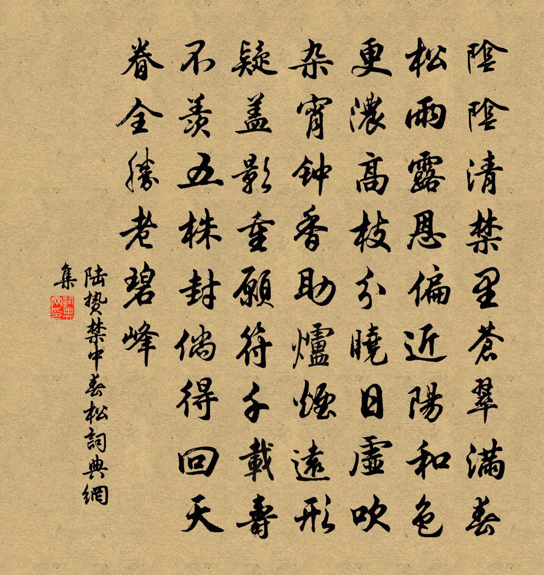 詩詞名句歷史字典書法欣賞書法字典國語詞典說文解字康熙字典古漢語字典標 題 作 者 詩 句 禁中春松作者:陸贄 朝代:唐代禁中春松原文陰陰清禁里,蒼翠滿春松。雨露恩偏近,陽和色更濃。高枝分曉日,虛吹雜宵鍾。香助爐煙遠,形疑蓋影重。願符千載壽,不羨五株封。倘得回天眷,全勝老碧峰。詩詞問答問:禁中春松的作者是誰?答:陸贄問:禁中春松寫於哪個朝代?答:唐代問:禁中春松是什麼體裁?答:五排陸贄禁中春松書法欣賞禁中春松書法作品注釋全唐詩:卷288_2詩詞推薦和張荊州所寄張栻〔宋代〕自古荊州通陸海,只今學士過青錢。笑譚坐子安邊策,取次成詩盡可編。春晚寄盧使君貫休〔唐代〕滿郭春如畫,白堂心自澄。禪拋金鼎藥,詩和玉壺冰。白雨飄花盡,晴霞向閣凝。寂寥還得句,因寄柳吳興。寄王十四舍人司空圖〔唐代〕幾年汶上約同游,擬為蓮峰別置樓。今日鳳凰池畔客,五千仞雪不回頭。沁園春李道純〔元代〕叉手者誰,合掌者誰,擊拳者誰。只這些伎倆,人猶錯會,無為妙理,孰解操持。我為諸公,分明舉似,老子瞿曇席上探題二首范祖禹〔宋代〕秋夜雨點滴,梧桐亂人語。幾行寒雁起沙汀,萬里漁舟泊煙渚。題李處士山居楊嗣復〔唐代〕臥龍決起為時君,寂寞匡廬惟白雲。今日仲容修故業,草堂焉敢更移文。送王協律游杭越十韻元稹〔唐代〕去去莫淒淒,餘杭接會稽。松門天竺寺,花洞若耶溪。浣渚逢新艷,蘭亭識舊題。山經秦帝望,壘辨越王棲。江樹春日書事張耒〔宋代〕蟲飛絲墮兩悠揚,人意遲遲日共長。春草滿庭門寂寂,數欞窗日掛空堂。賀新郎(壽蔡久軒參政,癸丑生)王庚〔宋代〕滿勸黃封酒。是年年、春色長繞,徑花宮柳。碧水丹山添清氣,歲月蘭亭癸丑。看樞極、光騰台斗。細數中書堂壁雪孟郊〔唐代〕忽然太行雪,昨夜飛入來。崚嶒墮庭中,嚴白何皚皚。奴婢曉開戶,四肢凍徘徊。咽言詞不成,告訴情狀摧。官給送致明之高沙三首劉子翬〔宋代〕不夢清淮鬢欲凋,因君行色意飄飄。鐵頭船子舊遊處,三尺霜鱗鏡面跳。柘枝舞史浩〔宋代〕竹,閒六律以皆調;僸佅兜離,賀四夷之率伏。請翻妙舞,來奉多歡。鼓吹連催,柘枝入隊。念了,後行吹引子半追送奎上人還鄞釋文珦〔宋代〕隨緣游上國,興盡即言行。今日不辭我,他宵還夢兄。出山雲滿橐,歸路水兼程。無奈汀洲畔,春風草又生。湖村晚興林逋〔宋代〕滄洲白鳥飛,山影落晴暉。映竹犬初吠,弄舡人合歸。水波隨月動,林翠帶煙微。寺近疏鍾起,蕭然還掩扉。伯氏臨江使君寄薌林次韻王洋〔宋代〕力湯橫空萬斛舟。一函酬唱紀川游。篇篇秀潤東南竹,落落珠璣小大鄒。人物百年同富壽,客懷千里夢逡遒。主人無俗念尹志平〔元代〕天涯海角,任縱橫、到處一身閒拓。世事知空風過耳,別有些兒歡樂。玉鼎烹煎,金爐滾沸,煉就丹砂藥。服之歸夢行簡白居易〔唐代〕天氣妍和水色鮮,閒吟獨步小橋邊。池塘草綠無佳句,虛臥春窗夢阿憐。風雨吟吳融〔唐代〕風騷騷,雨涔涔,長洲苑外荒居深。門外流水流澶漫,河邊古木鳴蕭森。夐無禽影,寂無人音。端然拖愁坐,萬感將到金陵投宿烏江寺李彌遜〔宋代〕閱世真成一夢闌,塵埃誰復共開顏。辛壬癸甲常為客,南北東西只問山。縈樹遠雲高作蓋,護田流水曲於環。秋風繡觀音章甫〔宋代〕蜀人多巧思,組繡用功深。生綃三尺余,成此觀世音。慈悲歡喜容,如出旃檀林。蓮花隨步武,纓絡縵衣襟。手中名句推薦流水落花春去也,天上人間。李煜《浪淘沙令·簾外雨潺潺》 芙蓉生在秋江上,不向東風怨未開。高蟾《下第後上永崇高侍郎》 秋菊有佳色,裛露掇其英。陶淵明《飲酒·其四》 且看欲盡花經眼,莫厭傷多酒入唇。杜甫《曲江二首》 智欲圓而行欲方,膽欲大而心欲小。程登吉《幼學瓊林·卷三·人事》 老吾老,以及人之老;幼吾幼,以及人之幼。孟子《孟子·梁惠王章句上·第八節》 窮不失義,達不離道。孟子《孟子·盡心章句上·第九節》 大兒鋤豆溪東,中兒正織雞籠。辛棄疾《清平樂·村居》 我醉君復樂,陶然共忘機。李白《下終南山過斛斯山人宿置酒》 碧玉妝成一樹高,萬條垂下綠絲絛。賀知章《詠柳 / 柳枝詞》