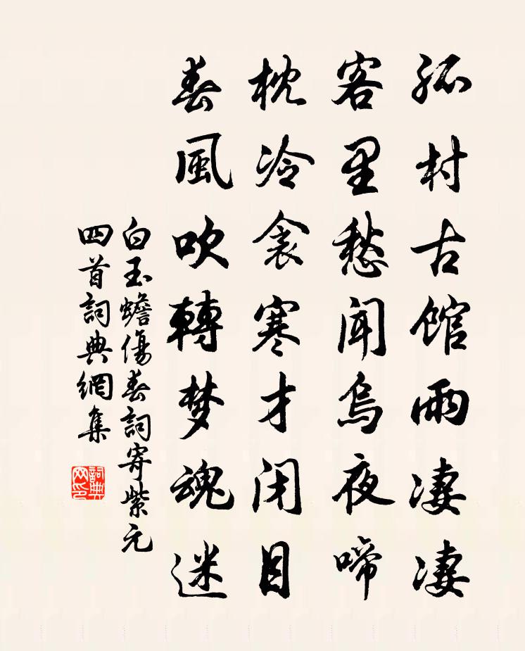 詩詞名句歷史字典書法欣賞書法字典國語詞典說文解字康熙字典古漢語字典標 題 作 者 詩 句 傷春詞寄紫元四首作者:白玉蟾 朝代:宋代傷春詞寄紫元四首原文孤村古館雨淒淒,客里愁聞烏夜啼。枕冷衾寒才閉目,春風吹轉夢魂迷。詩詞問答問:傷春詞寄紫元四首的作者是誰?答:白玉蟾問:傷春詞寄紫元四首寫於哪個朝代?答:宋代問:傷春詞寄紫元四首是什麼體裁?答:七絕白玉蟾傷春詞寄紫元四首書法欣賞傷春詞寄紫元四首書法作品詩詞推薦頌四賓主釋印肅〔宋代〕要會箇中真活計,釋迦老子不蓋被。更尋祖意外馳求,管取下梢落魔魅。陳丞以南安寨上所得二詩及到龍泉聞余戍地最趙蕃〔宋代〕郴州何許是,山遠水仍多。江徼重重柵,田夫戶戶戈。雷同嗟不早,嘆我亦奔波。未必甘如此,而今敢謂何。南歌子詞二首 / 新添聲楊柳枝詞溫庭筠〔唐代〕一尺深紅勝麴塵,天生舊物不如新。合歡桃核終堪恨,里許元來別有人。井底點燈深燭伊,共郎長行莫圍棋。玲瓏借汪路教韻題趙東麓判丞臨清堂楊公遠〔宋代〕結屋俯清溪,蕭然迥出奇。書藏千萬卷,梅浸兩三枝。入竹風聲細,移花日影遲。樂山仍樂水,何慮復何思。菊有天香(龍涎香)周密〔宋代〕碧腦浮冰,紅薇染露,驪宮玉唾誰搗。麝月雙心,鳳雲百和,寶釧佩環爭巧。濃熏淺注,疑醉度、千花春曉。金餅熊李嶠〔唐代〕導洛宜陽右,乘春別館前。昭儀忠漢日,太傅翊周年。列射三侯滿,興師七步旋。莫言舒紫褥,猶異飲清泉。偈頌七十一首釋了惠〔宋代〕屋前基業,屋後生涯。堂堂妙用,不假安排。暑退涼飈起,燕歸鴻雁來。天台南嶽,峨嵋五台。新羅擊鼓大唐齋。送高士安下第歸岷南寧覲歐陽詹〔唐代〕偕隱有賢親,岷南四十春。棲雲自匪石,觀國暫同塵。就養思兒戲,延年愛鳥伸。還看謝時去,有類潁陽人。過忠州訪酆都觀二首李曾伯〔宋代〕是山來自古,與世類相忘。雨染新苔翠,風吹老柏香。神仙多漢魏,祠像半隋唐。幾許煙霞侶,相從老此鄉。偈頌一百零二首釋慧遠〔宋代〕若能離諸相,即入法王家。法王無二法,無法即是家。是故法王法,當甚苦瓠瓜。吳興送梁補闕歸朝賦得荻花朱長文〔唐代〕柳家汀洲孟冬月,雲寒水清荻花發。一枝持贈朝天人,願比蓬萊殿前雪。句朱裔〔宋代〕會入天台里,看予度金山。石州慢 題玉笙手卷張翥〔元代〕仙去緱山,宴罷武夷,瓊響吹徹。叢霄舊樣親傳,琢就玉煙凝白。悠揚彩鳳恰從雲杪飛來,數聲又趁鴛鴦歇。零落送莊糾一首劉克莊〔宋代〕忽枉高軒訪,殷勤不忍離。雖書督郵考,率在過庭時。辯素推三語,清尤畏四知。歸裝無長物,一首後村詩。孟君復贈王侯元俞詩兩皆英妙神奇次韻方回〔宋代〕孟侯與王侯,妙年俱作州。窮窮鬼揄我,汝堪並英游。汝無曲逆計,汝無裨諶謀。汝乃蹄涔水,可配江河流。倉卒頌古十六首釋心月〔宋代〕善法堂前探淺深,寒濤平地涌千尋。探竿靠壁出門去,也是貧兒拾得金。答趙生紅梨花詩謝金蓮〔宋代〕本分天然白雪香,誰知今日卻濃妝。鞦韆院落溶溶月,羞覩紅脂睡海棠。仙草歐陽修〔宋代〕世說書有仙草,書得之能隱書身。仙書已怪書妄,此事況無文。嗟爾得從誰,不辨偽與真。持行入都市,自謂術通答韓中丞容不飲酒李頻〔唐代〕老大成名仍足病,強聽絲竹亦無歡。高情太守容閒坐,借與青山盡日看。大港即事次韻蔡肇〔宋代〕村落家家有酒沽,黃童白叟醉相扶。恨無韓滉丹青手,更作豐年幾幅圖。名句推薦橋成漢渚星波外,人在鸞歌鳳舞前。晏幾道《鷓鴣天·當日佳期鵲誤傳》 白日依山盡,黃河入海流。王之渙《登鸛雀樓》 客子光陰詩卷里,杏花訊息雨聲中。陳與義《懷天經智老因訪之》 興盡晚回舟,誤入藕花深處。李清照《如夢令·常記溪亭日暮》 玉座猶寂寞,況乃妾身輕。謝朓《同謝諮議詠銅雀台》 覆巢毀卵,而鳳皇不翔;刳胎焚夭,而麒麟不至。劉向《戰國策·趙四·秦攻魏取寧邑》 草色全經細雨濕,花枝欲動春風寒。王維《酌酒與裴迪》 織婦何太忙,蠶經三臥行欲老。元稹《織婦詞》 會桃花之芳園,序天倫之樂事李白《春夜宴桃李園序/春夜宴從弟桃花園序》 歷冰霜、不變好風姿,溫如玉。陸容《滿江紅·詠竹》