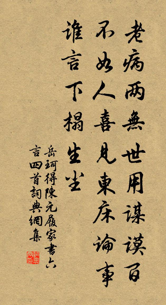 詩詞名句歷史字典書法欣賞書法字典國語詞典說文解字康熙字典古漢語字典標 題 作 者 詩 句 得陳元履家書六言四首作者:岳珂 朝代:宋代得陳元履家書六言四首原文老病兩無世用,謀謨百不如人。喜見東床論事,誰言下榻生塵。詩詞問答問:得陳元履家書六言四首的作者是誰?答:岳珂問:得陳元履家書六言四首寫於哪個朝代?答:宋代岳珂得陳元履家書六言四首書法欣賞得陳元履家書六言四首書法作品詩詞推薦題壁廬陵田父〔宋代〕雲兮雲兮,變化有神靈兮。捲起地下黃,飛去天上青兮。仙人乘雲天盡五,借我清陰覆赤土。雲間逍遙人間苦,年南柯子 再用前韻袁易〔元代〕綠酒忘年友,黃花入幕賓。狂歌鼓腹混堯民。冷笑世間,名利細如塵。二妙真無敵,千篇轉逼人。蛟龍驚避噤無神垂絲釣(戊戌迓客。自入淮南,多所感愴作)丘崈〔宋代〕夕烽戍鼓。悲涼江岸淮浦。霧隱孤城,水荒沙聚。人共語。盡向來勝處。謾懷古。問柳津花渡。露橋夜月, * 人秋懷六首洪邁〔宋代〕穿堵超玉繩,倒影夜窗寂。火雲一洗空,月露清欲滴。幽人負疴臥,起坐三嘆息。歸同對床第,晤語永佳夕。念奴嬌(和誠齋休致韻)劉克莊〔宋代〕此翁雙手,頓閒處、且把香篝籠袖。西掖北門辭不要,肯要南柯太守。小小亭台,些些竹木,何必靈和柳。地行仙偈釋警玄〔宋代〕夜半烏雞抱鵠卵,天明起來生老鸛。鶴毛鷹觜鷺鸞身,卻共烏鴉為侶伴。高入煙霄,低飛柳岸。向晚歸來子細看,臨江仙(柳)許庭〔宋代〕不見昭陽宮內柳,黃金齊捻輕柔。東君昨夜到皇州。玉階金井,無處不風流。悵望翠華春欲暮,六宮都鎖春愁。暖答客劉克莊〔宋代〕誰謂貧難忍,三年閉戶居。老兵能合藥,小僕會抄書。白髮羞彈鋏,青山去荷鋤。既於吟得趣,功業合乘除。寶應界中絕句三首孔武仲〔宋代〕倒景虞淵日,餘威澤國霞。宵行逐明月,水宿傍人家。癸未至節以病晚起走筆戲書紀事排悶十首方回〔宋代〕貧家無節物,何況此荒城。村妓聞來賀,山翁懶出迎。頭瘍連耳腫,夜雨雜風鳴。政爾堪高臥,床香菊枕成。扶溝白鶴觀有蘇子兄弟贈黃道士詩二闋縣令周鄭獬〔宋代〕道士黃初平,愛酒老不衰。二豪留醉墨,瀟灑白雲辭。流鶯境寂寞,無復落花枝。空餘鳳凰字,猶得周郎悲。賢者之孝二百四十首齊侯無野林同〔宋代〕我母亦君母,吾翁即君翁。分羹何太忍,請質可堪從。湯婆釋文珦〔宋代〕野翁有湯婆,愛逾美淑姬。眡之若彭亨,虛中而無為。冬日則飲湯,身唯一衲隨。曾不涴脂粉,簡潔良易資。終宵寄羅機宜竟陵督捕六首項安世〔宋代〕萬仞山根螻蟻,千車轍底螳琅。不怕{左麥右豐}蕡嬰刃,只尤玉石焚罔。夜行船吳文英〔宋代〕逗曉闌乾沾露水。歸期杳、畫檐鵲喜。粉汗餘香,傷秋中酒,月落桂花影里。屏曲巫山和夢倚。行雲重、夢飛不起史太師病癒未果走賀誕辰伊邇作古詩三首寄之劉應時〔宋代〕真隱出人間,了此一大事。堯舜既授受,邊障息烽燧。袖手辭鈞衡,澹然不色喜。高臥北山雲,戲掬西湖水。齊天樂 和蔣四清病喝逢秋所作曹伯啟〔元代〕普天炎赫衣流汗。號呼坐恨更淺。節序推移,陰陽代謝,誰敢心懷咨怨。冥迷展轉。夢遠壑層冰,澄江匹練。大地賀皇太子九月四日生辰四首楊萬里〔宋代〕地出雷初震,天升日更重。高飛千里鵠,潛躍九淵龍。隆準如高帝,虯須似太宗。八荒陰賜里,戶戶是華封。頌古釋道顏〔宋代〕老僧正在東司上,不將佛法為人說。一般屎臭旃檀香,父子之機俱漏泄。太華觀李白〔唐代〕厄磴層層上太華,白雲深處有人家。道童對月閒吹笛,仙子乘雲遠駕車。恠石堆山如坐虎,老藤纏樹似騰蛇。曾聞名句推薦秋到長門秋草黃。畫梁雙燕去,出宮牆。薛昭蘊《小重山·秋到長門秋草黃》 智足以拒諫,言足以飾非司馬遷《史記·汲鄭列傳》 孤雁不飲啄,飛鳴聲念群。杜甫《孤雁 / 後飛雁》 山明水淨夜來霜,數樹深紅出淺黃。劉禹錫《秋詞二首》 親愛我,孝何難。親憎我,孝方賢。李毓秀《弟子規·入則孝》 影孤憐夜永,永夜憐孤影蘇軾《菩薩蠻·回文秋閨怨》 微雨如酥,草色遙看近卻無。蘇軾《減字木蘭花·鶯初解語》 三十功名塵與土,八千里路雲和月。岳飛《滿江紅·寫懷》 征蓬出漢塞,歸雁入胡天。王維《使至塞上》 貴名不可以比周爭也,不可以誇誕有也,不可以勢重脅也荀子《荀子·儒效》