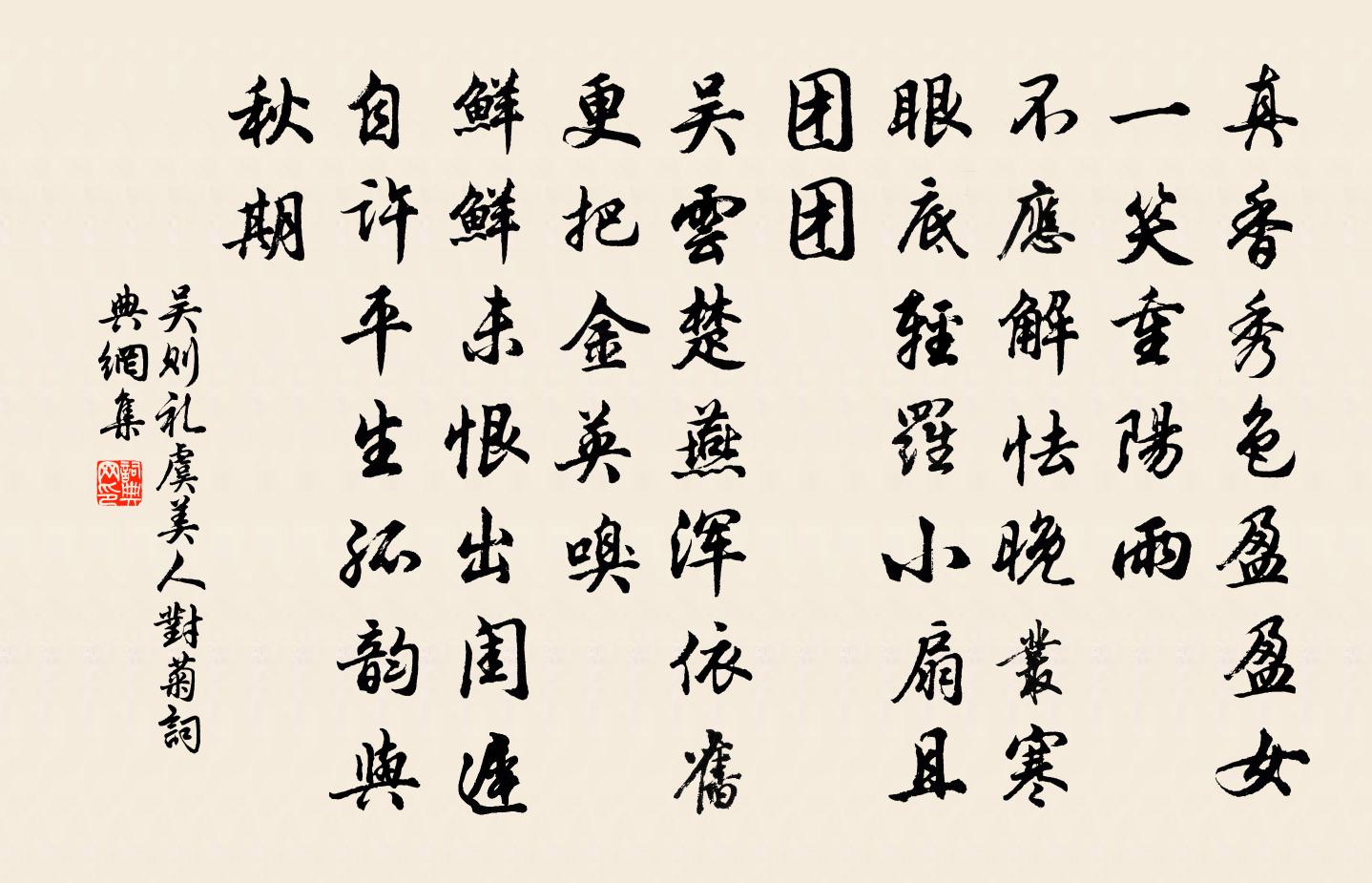 詩詞名句歷史字典書法欣賞書法字典國語詞典說文解字康熙字典古漢語字典標 題 作 者 詩 句 虞美人(對菊)作者:吳則禮 朝代:宋代虞美人(對菊)原文真香秀色盈盈女。一笑重陽雨。不應解怯晚叢寒。眼底輕羅小扇、且團團。吳雲楚燕渾依舊。更把金英嗅。鮮鮮未恨出閨遲。自許平生孤韻、與秋期。詩詞問答問:虞美人(對菊)的作者是誰?答:吳則禮問:虞美人(對菊)寫於哪個朝代?答:宋代問:虞美人(對菊)是什麼體裁?答:詞吳則禮虞美人(對菊)書法欣賞虞美人(對菊)書法作品詩詞推薦寄故人施彥執張九成〔宋代〕百念都忘萬事休,一觴一詠自賡酬。坐看庾嶺當南斷,又送橫江轉北流。已覺摧頹侵兩鬢,更無術畫補前旒。何時四月十一日游湖上作張嵲〔宋代〕余花送春暮,群綠迎夏初。清晨出郡郭,溪山含雨濡。宿靄昏近麓,初陽灩平湖。空明映山樹,澹淡浮青蕪。亭亭遣興黃超然〔宋代〕曬麥有餘粒,雙鳩下庭際。知我無我心,相忘兩兩礙。風暝物意樂,雲薄花影晦。試知春色深,精覺靜可愛。紛紛感鏡韋應物〔唐代〕鑄鏡廣陵市,菱花匣中發。夙昔嘗許人,鏡成人已沒。如冰結圓器,類璧無絲髮。形影終不臨,清光殊不歇。一感擬古蘇泂〔宋代〕日月遞相見,玄發驚蹉跎。冥冥北邙路,去者何其多。妻孥聚歡樂,志遠身已訛。功名無富貴,此路不可過。可憐種麥後栽補桑柘至田家憩息舒岳祥〔宋代〕桑柘疏時補,篁茅密處刪。水邊黃葉路,雨外夕陽山。一鳥自啼足,兩牛相對閒。山翁留壁記,子醜話時艱。鄒律蘇拯〔唐代〕鄒律暖燕谷,青史徒編錄。人心不變遷,空吹閒草木。世患有三惑,爾律莫能抑。邊苦有長征,爾律莫能息。斯術王屋山送道士司馬承禎還天台李隆基〔唐代〕紫府求賢士,清溪祖逸人。江湖與城闕,異跡且殊倫。間有幽棲者,居然厭俗塵。林泉先得性,芝桂欲調神。地道次韻魯參政觀潮柳貫〔元代〕怒潮卷雪過樟亭,人立西風酒旆青。日轂行天淪左界,地機激水出東溟。倒排山嶽窮千變,闔辟雲雷竦百靈。望海過西溪華岳〔宋代〕路隨馬足難知數,山疊魚鱗不記名。隔岸青簾人不渡,一溪流水暮潮生。老將吳泳〔宋代〕一從十五長邊城,少見兵戈日太平。代馬依風都護道,飛鳶熏霧伏波營。紅雕臘軟君王賜,青兕裘輕子女情。昨夜射堋司馬光〔宋代〕疊鼓花前急,紅旌竹外高。驚飈分白羽,餘響振烏號。壯觀傾人陌,歡聲肖夜濤。因茲形禮俗,豈獨事游遨。物化舒岳祥〔宋代〕擾擾孰分形,紛紛誰與明。螻蛄擘地走,蚯蚓上階鳴。隨事皆天道,因人見物情。蟬吟兼蝶舞,風韻喜輕清。自題歲寒堂余瀚〔宋代〕書堂高構歲寒巔,水秀山明隔市廛。兩岸柳風吹道骨,一溪梧月浸心天。南鄉子曹伯啟〔元代〕十月出秦關。竟日悠悠杳靄間。直到蠶魚開國地,躋攀。行盡千山復萬山。歸轡動歡顏。江路梅花笑往還。稚子候題籠鶴白居易〔唐代〕經旬不飲酒,逾月未聞歌。豈是風情少,其如塵事多。虎丘慚客問,娃館妒人過。莫笑籠中鶴,相看去幾何?解冤結 今丹陽下山權與陸仙作伴王哲〔元代〕我行符水。公修藥餌。一居山,一居*市。兩處崇真暗相洽,即非彼此。無為漏、共成不二。扶風儒士。同為教旨懷南鄭舊遊陸游〔宋代〕南山南畔昔從戎,賓主相期意氣中。渴驥奔時書滿壁,餓鴟鳴處箭凌風。千艘粟漕魚關北,一點烽傳駱谷東。惆悵詩僧常不輕以梅花句得名於時雪後踏月相過論楊冠卿〔宋代〕荒江落日孤鴻影,遠趁幽人踏月來。雪屋雲林淡相對,月邊依約有寒梅。次韻趙主簿雪詩十韻二首項安世〔宋代〕歷亂空中花,蹁躚水中影。屑屑復騷騷,涼涼何滓滓。風急陣形圓,雲深兵勢回。檐鵲換緇衣,皋禽失丹頂。歷驚名句推薦自知者不怨人,知命者不怨天。荀子《荀子·榮辱》 關城榆葉早疏黃,日暮雲沙古戰場。王昌齡《從軍行七首》 畫樓洗淨鴛鴦瓦,彩繩半濕鞦韆架。王元鼎《醉太平·寒食》 小荷才露尖尖角,早有蜻蜓立上頭。楊萬里《小池》 今朝北客思歸去,回入紇那披綠羅。劉禹錫《竹枝詞二首·其二》 良辰當五日,偕老祝千年。權德輿《端午日禮部宿齋有衣服彩結之貺以詩還答》 倚闌凝望,獨立漁翁滿江雪。李綱《六么令·次韻和賀方回金陵懷古鄱陽席上作》 又是過重陽,台榭登臨處,茱萸香墜。李煜《謝新恩·冉冉秋光留不住》 瀚海百重波,陰山千里雪。李世民《飲馬長城窟行》 不經一番寒徹骨,怎得梅花撲鼻香。黃櫱禪師《上堂開示頌》