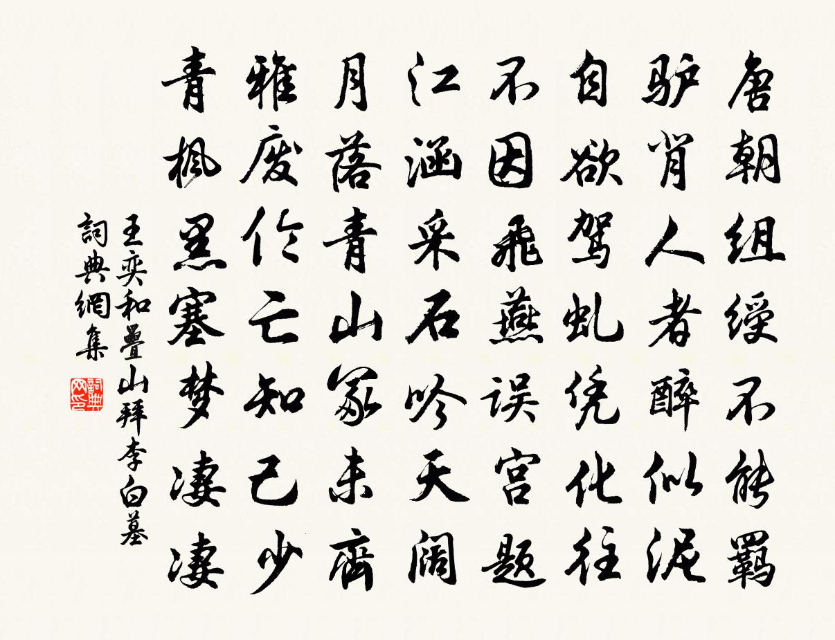 詩詞名句歷史字典書法欣賞書法字典國語詞典說文解字康熙字典古漢語字典標 題 作 者 詩 句 和疊山拜李白墓作者:王奕 朝代:宋代和疊山拜李白墓原文唐朝組綬不能羈,驢背人者醉似泥。自欲駕虬憑化往,不因飛燕誤宮題。江涵採石吟天闊,月落青山冢未齊。雅廢倫亡知己少,青楓黑塞夢淒淒。詩詞問答問:和疊山拜李白墓的作者是誰?答:王奕問:和疊山拜李白墓寫於哪個朝代?答:宋代王奕和疊山拜李白墓書法欣賞和疊山拜李白墓書法作品詩詞推薦題吳山長文英野舟五首方回〔宋代〕春潮滯雨橫舟晚,成就蘇州一段奇。向使有人爭此渡,韋郎眼底定無詩。鵲橋仙(七夕)向子諲〔宋代〕澄江如練,遠山橫翠,一段風煙如畫。層樓傑閣倚晴空,疑便是、支磯石下。寶奩瓊鑒,淡勻輕掃,縴手弄妝初罷海陽十詠蒙池劉禹錫〔唐代〕瀠渟幽壁下,深淨如無力。風起不成文,月來同一色。地靈草木瘦,人遠煙霞逼。往往疑列仙,圍棋在岩側。和三門竇程寺丞見贈魏野〔宋代〕禹門分署似仙居,誰羨同年在直廬。閒制曲教鴉角唱,醉吟詩遣鳳毛書。蒙過村巷驚玄豹,命踏廳階上白驢。莫訝秦州薛都督輓詞崔湜〔唐代〕十里絳山幽,千年汾水流。碑傳門客見,劍是故人留。隴樹煙含夕,山門月照秋。古來鐘鼎盛,共盡一蒿丘。早春陸游〔宋代〕近陂牛湩白,遠浦鴨頭青。一棹悠然去,東風吹酒醒。報師恩 疏慵丘處機〔元代〕懶看經教懶燒香。兀兀騰騰似醉狂。日月但知生與落,是非寧辨短和長。客來坐上心慵問,飯到唇邊口倦張。不是風雨終夜獨坐不寐蒲壽宬〔宋代〕風雨瀟瀟到夜終,夜寒一室坐虛空。何當樂與二三子,免使淒其六一翁。老大自甘為老大,窮通休苦較窮通。此心游曹園趙汝鐩〔宋代〕先登東畔高亭子,洗卻胸襟萬斛塵。落乍玉殘梅興盡,舊桃金吐柳芽新。倚林困鶴聊休足,巡食飢烏不避人。尚欲滿庭芳張繼先〔宋代〕閒里工夫,無中妙用,切休擬議參詳。龍降虎伏,真土自中黃。行動起居寢食,隨緣度、莫動真陽。歸根處,神凝八月七日被命上會稽沿途所歷拙於省記為韻語魏了翁〔宋代〕三十六源光奪鑒,九千餘頃稻盈車。何年使客徼微利,不管稽陰數萬家。偈頌六十首釋曇華〔宋代〕千年田,八百主。甜瓜徹蒂甜,苦瓠連根苦。君不見禾山解打鼓,又不見採菊東籬下,千山萬山疊疊高門戶。又不病起二首陳造〔宋代〕老去難堪痼疾纏,支離甘客群人憐。出門定被將迎困,緊閉風窗聽雨眠。浣溪沙許有壬〔元代〕修黛橫愁苦愛顰。*霞亂玉更宜嗔。嗅香*蕊柰何春。織就回文難會意,寫成離字亦傷神。他年不及卷中人。大暑久不請謁登南樓望成父西庵慨然奉思因成李彌遜〔宋代〕南郭子綦隱,西郊杜老居。風流如異代,臭味本吾廬。高閣深繙貝,虛堂靜散書。經旬想顏色,著雨問何如。次洪景伯韻曾惇〔宋代〕半刺風流雅好賢,幽導同舉蔡經鞭。江梅滿樹為誰好,官柳著行還自妍。筆陣如君難索敵,詩鋒顧我敢爭先。一春辨畢方鄭剛中〔宋代〕比屋皆良民,為盜豈無以。富足義所生,貧窮盜之始。凍餓家無儲,追呼官不已。妖幻隨鼓之,安得不群起。縱火探梅陸游〔宋代〕半吐幽香特地奇,正如官柳弄黃時。放翁頗具尋梅眼,可愛南枝愛北枝。句應傃〔宋代〕嘉木灌業春意好,可憐不種紫荊花。送龔員外赴江州幕徐鉉〔唐代〕煩君更上築金台,世難民勞藉俊才。自有聲名馳羽檄,不妨談笑奉尊罍。元規樓迥清風滿,匡俗山春畫障開。莫忘名句推薦待把酒送君,恰又清明後。何夢桂《摸魚兒·記年時人人何處》 當年燕子知何處,但苔深韋曲,草暗斜川。張炎《高陽台·西湖春感》 深村時節好,應為去年豐。范成大《寒食郊行書事》 仙佛茫茫兩未成,只知獨夜不平鳴。黃景仁《雜感》 蕪然蕙草暮,颯爾涼風吹。李白《秋思》 輕汗微微透碧紈,明朝端午浴芳蘭。蘇軾《浣溪沙·端午》 塵緣一點,回首西風又陳跡。吳文英《六么令·夷則宮七夕》 碧虛無雲風不起,山上長松山下水。劉禹錫《八月十五夜桃源玩月》 相思黃葉落,白露濕青苔。李白《長相思三首》 斜陽獨倚西樓。遙山恰對簾鉤。晏殊《清平樂·紅箋小字》