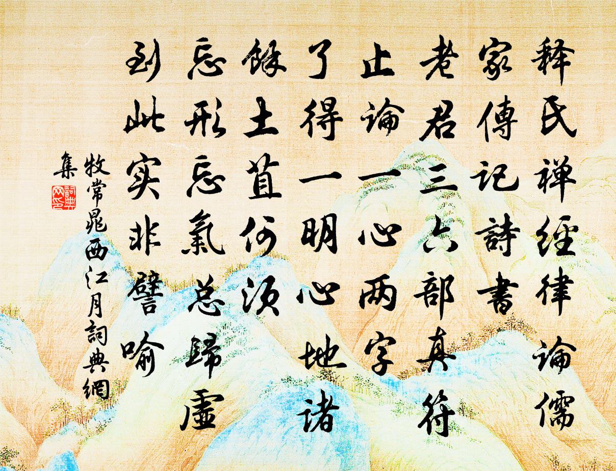 詩詞名句歷史字典書法欣賞書法字典國語詞典說文解字康熙字典古漢語字典標 題 作 者 詩 句 西江月作者:牧常晁 朝代:元代西江月原文釋氏禪經律論,儒家傳記詩書。老君三六部真符。止論一心兩字。了得一明心地,諸餘土苴何須。忘形忘氣總歸虛。到此實非譬喻。詩詞問答問:西江月的作者是誰?答:牧常晁問:西江月寫於哪個朝代?答:元代問:西江月是什麼體裁?答:詞牧常晁西江月書法欣賞西江月書法作品詩詞推薦初晴游滄浪亭蘇舜欽〔宋代〕夜雨連明春水生,嬌雲濃暖弄微晴。簾虛日薄花竹靜,時有乳鴿相對鳴。山間桃花盛開程公許〔宋代〕槿籬繩屋間桃花,晴日蒸紅片片霞光。物色為人揩病眼,亂山深處詫奢華。發黃州泊巴河游馬祈寺陸游〔宋代〕南望武昌山,北望齊安城。楚江萬頃綠,著我畫舫橫。雲帆不須掛,鼉鼓不須鳴,淡然隱曲幾,山水相逢迎。疏雨丁丑別金壇劉漫塘七首杜范〔宋代〕北風吹夏律,草木塵沙昏。枝葉曾未害,根本難具論。肉食謀何有,家食徒殷勤。誰能起東山,掃翳扶朝暾。望清遠峽楊萬里〔宋代〕剌船又入峽山間,江水初平失惡灘。道是峽山天下險,老夫令作坦塗看。嚴十八郎中在郡日改制東南樓因名清輝未立標榜…寄嚴白居易〔唐代〕嚴郎置茲樓,立名曰清輝。未及署花榜,遽征還粉闈。去來三四年,塵土登者稀。今春新太守,灑掃施簾幃。院柳韓二十七詩來雲已束歸鞍逐去鴻令人欣喜愧嘆晁說之〔宋代〕此身重滯愧征鴻,況對庭前郢樹風。暫至京師便歸去,敢期今日有黃公。哭鄒德久二首用前韻張元乾〔宋代〕出守真成夢蟻宮,天台雲色亦愁容。時來盍錫萬釘帶,仙去俄歸群玉峰。川上可驚如逝水,歲寒徒有後凋松。煩將子權朝散久在蕪湖寄郡酒四壺副以小詩張耒〔宋代〕寒流不相待,舟楫定何如。歲事日已宴,客行誰與娛。淮魚將入饌,江酒且傾壺。我似離群雁,汀洲片影無。和卞養直見示三絕簡聖書王之道〔宋代〕遲日輕風過雨天,笑聲何處送鞦韆。清明已逼長安近,寄語先生快著鞭。探釣台趙汝普〔宋代〕先生道足師天子,豈為劉郎作諫官。一線不期貪懦法,兩台自受水雲寬。忘機故把直鉤釣,適志何嫌高揭竿。千載離蘄陽守風林皇方慮風壯晚未知所止俄頃風息張耒〔宋代〕老怕風波見輒驚,賴逢談笑慰危情。縱觀雲嶺屏風合,坐見江濤鏡面平。淹速人生難預計,險夷世路不須營。塵埃學進士作大方無隅二首劉克莊〔宋代〕舉世遊方內,規規臆見拘。惟其全體大,所以四隅無。矩絜豈能盡,軌同安有殊。其崖誰見者,何岸可登乎。固異秋夕書事寄友人李中〔唐代〕信斷關河遠,相思秋夜深。砌蛩聲咽咽,檐月影沈沈。未遂青雲志,那堪素髮侵。吟余成不寐,徹曙四鄰砧。題沈弟所作短軸趙蕃〔宋代〕作詩政欲江山助,老矣東西南北人。弟卻把詩摹作畫,東西南北是知津。玉照堂觀梅二十首張鎡〔宋代〕六日新春一再來,直須登樹賞花開。攀翻徑上枝梢外,不負東風是此杯。初直省宿朱翌〔宋代〕薄暮欣暑退,吏散列閒屋。冰廳冷如水,孤坐一巾幅。久絕青綾賜,僅免床下伏。何嘗語丁寧,但愧頭蓄縮。頻年詠灑市歌者范成大〔宋代〕豈是從容唱《渭城》,箇中當有不平鳴。可憐日晏忍飢面,強作春深求友聲。送龍茶與許道人歐陽修〔宋代〕潁陽道士青霞客,來似浮雲去無跡。夜朝北斗太清壇,不道姓名人不識。我有龍團古蒼璧,九龍泉深一百尺。憑君酬蘄春王宰公明王之道〔宋代〕致身華貫屬華年,顧我駑痾久不前。醉被長官輕罵鄭,懶從學子競嘲邊。功名有日還三傑,詩酒何人繼八仙。才業名句推薦滿則慮嗛,平則慮險,安則慮危荀子《荀子·仲尼》 丹灶初開火,仙桃正落花。孟浩然《清明日宴梅道士房 / 宴梅道士山房》 今逢四海為家日,故壘蕭蕭蘆荻秋。劉禹錫《西塞山懷古》 千淘萬漉雖辛苦,吹盡狂沙始到金。劉禹錫《浪淘沙九首》 入世冷挑紅雪去,離塵香割紫雲來。曹雪芹《訪妙玉乞紅梅》 奸不自招,忠不自辯。奸者禍國,忠者禍身。來俊臣《羅織經·察奸卷第八》 明月何皎皎,照我羅床幃。佚名《明月何皎皎》 枯枝無醜葉,涸水吐清泉李白《長歌行》 學術之微,四蠹害之也。黃宗羲《明儒學案·諸儒學案上·文正方正學先生孝孺》 臣強則死,念妄則亡。來俊臣《羅織經·事上卷第二》