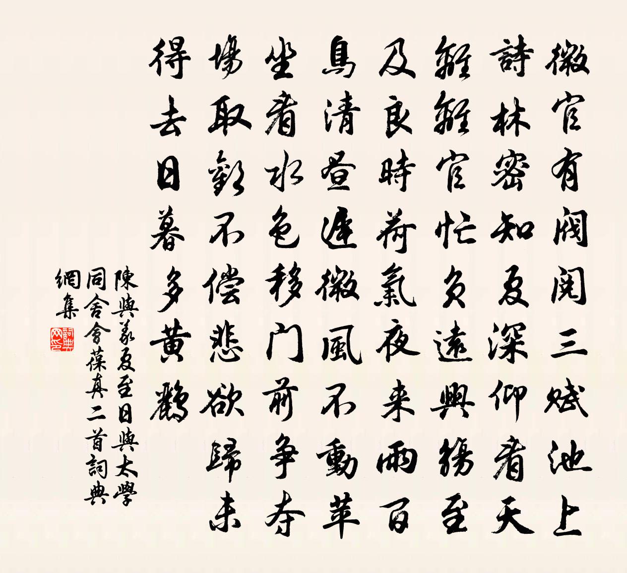 詩詞名句歷史字典書法欣賞書法字典國語詞典說文解字康熙字典古漢語字典標 題 作 者 詩 句 夏至日與太學同舍會葆真二首作者:陳與義 朝代:宋代原文微官有閥閱,三賦池上詩。林密知夏深,仰看天離離。官忙負遠興,觴至及良時。荷氣夜來雨,百鳥清晝遲。微風不動苹,坐看水色移。門前爭奪場,取歡不償悲。欲歸未得去,日暮多黃鸝。詩詞問答問:《夏至日與太學同舍會葆真二首》的作者是誰?答:陳與義問:該詩寫於哪個朝代?答:宋代問:陳與義的名句有哪些?答:陳與義名句大全書法欣賞夏至日與太學同舍會葆真二首書法作品詩詞推薦南歌子姚述堯〔宋代〕天宇霜風淨,雷封露氣寒。群賢高宴勝龍山。中有仙翁綠鬢、更朱顏。北闕心猶壯,東籬興為闌。年年身健足清歡寵辱胡宏〔宋代〕寵辱無休變萬端,阿誰能向靜中看。消磨利慾十分盡,免得臨機剖判難。早行五首趙蕃〔宋代〕落月掛林高,溪行屢著篙。不令驚水宿,頻覺送雞號。此趨今成熟,吾生毋乃勞。何能永謝去,自學小舟操。寄元九白居易〔唐代〕一病經四年,親朋書信斷。窮通合易交,自笑知何晚。元君在荊楚,去日唯雲遠。彼獨是何人,心如石不轉。憂我高宗祀明堂前朝享太廟二十一首真宗〔宋代〕聖考巍巍,光紹丕基。禮隆樂備,時維純熙。天仁兼覆,皇化無為。功成弗處,心潛希夷。出永通門經李氏莊許渾〔唐代〕飛軒危檻百花堂,朝宴歌鐘暮已荒。中散獄成琴自怨,步兵廚廢酒猶香。風池宿鳥喧朱閣,雨砌秋螢拂畫梁。力保蔡天逸以詩寄梅詩至梅不至毛滂〔宋代〕應念蕭寒槁木身,殷勤分寄嶺頭春。冰肌玉骨終安在,賴有清詩為寫真。酬公達鄭獬〔宋代〕小吏扣關聲啄啄,山夫驚落手中杯。不知天上何緣到,袖裡攜將明月來。唐樂府十首望歸馬劉駕〔唐代〕東人望歸馬,馬歸蓮峰下。蓮峰與地平,亦不更徵兵。入石橋路林木蓊鬱但聞澗聲潺潺忽驚湍飛雹駭徐大受〔宋代〕琮琤林澗只聽聞,想見縈崖絡石紋。忽作驚湍濺飛雹,半隨花雨落紛紛。步蟾宮(春景)蔣捷〔宋代〕玉窗掣鎖香雲漲。喚綠袖、低敲方響。流蘇拂處字微訛,但斜倚、紅梅一餉。濛濛月在簾衣上。做池館、春陰模樣戰城南兩漢樂府〔兩漢〕戰城南,死郭北,野死不葬烏可食。為我謂烏:且為客豪!野死諒不葬,俯腐肉安能去子逃?水深激激,蒲葦冥冥萬年春 立春日宮前對雪張之翰〔元代〕斷送余寒,舜韶聲里春風度。九重金戶。催進宜春句。道是春來,又候春將去。朝天處。柳花無數。飛滿宮前路。蝶戀花·幾許傷春春復暮賀鑄〔宋代〕幾許傷春春復暮。楊柳清陰,偏礙遊絲度。天際小山桃葉步。白頭花滿湔裙處。竟日微吟長短句。簾影燈昏,心寄夏口送屈突司直使湖南劉長卿〔唐代〕共悲來夏口,何事更南征。霧露行人少,瀟湘春草生。鶯啼何處夢,猿嘯若為聲。風月新年好,悠悠遠客情。紅窗迥·小園東柳永〔宋代〕小園東,花共柳。紅紫又一齊開了。引將蜂蝶燕和鶯,成陣價、忙忙走。花心偏向蜂兒有。鶯共燕、吃他拖逗。蜂寄題宋舜卿家小閣兼屬李亦韓梁進父二首趙蕃〔宋代〕湖北終連北,辰州是古州。故家唯宋民,舊物有書不。幾踏緣江路,頻登小閣幽。雖微少陵句,不減浣花頭。幽居雜題陸游〔宋代〕開歲頻風雨,清明氣始和。游山書半廢,耽酒睡常多。客去孫登嘯,牛疲甯戚歌。餘生猶有幾?盡底付漁蓑。回施先輩見寄新詩二首徐凝〔唐代〕九幽仙子西山卷,讀了絛繩系又開。此卷玉清宮裡少,曾尋真誥讀詩來。紫河車裡丹成也,皂莢枝頭早晚飛。料得挽方粹岩仲二首劉克莊〔宋代〕上世師朱氏,慈闈祖艾軒。惓惓篡遺緒,歷歷識前言。柳記多先友,遷書賴外孫。悲哉此奇士,寂寞向寒源。名句推薦布衣菜飯,可樂終身,不必作遠遊計也。沈復《浮生六記·閨房記樂》 車遙遙兮馬洋洋,追思君兮不可忘。傅玄《車遙遙篇》 繞池閒步看魚游,正值兒童弄釣舟。白居易《觀游魚》 滿月飛明鏡,歸心折大刀。杜甫《八月十五夜月二首》 可憐白骨攢孤冢,盡為將軍覓戰功。張蠙《吊萬人冢》 佳人應怪我,別後寡信輕諾。柳永《尾犯·夜雨滴空階》 舟遙遙以輕颺,風飄飄而吹衣。陶淵明《歸去來兮辭·並序》 不逆命,何羨壽?不矜貴,何羨名?不要勢,何羨位?不貪富,何羨貨?列子及其弟子《列子·楊朱》 紛紛墜葉飄香砌。夜寂靜,寒聲碎。范仲淹《御街行·秋日懷舊》 水榭風微玉枕涼。牙床角簟藕花香。蘇庠《浣溪沙·書虞元翁書》
