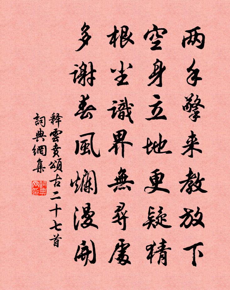 詩詞名句歷史字典書法欣賞書法字典國語詞典說文解字康熙字典古漢語字典標 題 作 者 詩 句 頌古二十七首作者:釋雲賁 朝代:宋代頌古二十七首原文兩手擎來教放下,空身立地更疑猜。根塵識界無尋處,多謝春風爛漫開。詩詞問答問:頌古二十七首的作者是誰?答:釋雲賁問:頌古二十七首寫於哪個朝代?答:宋代釋雲賁頌古二十七首書法欣賞頌古二十七首書法作品詩詞推薦訴衷情侯善淵〔元代〕玉爐金鼎虎龍蟠。紅焰滿周天。溫涼自然水火,晝夜轉烹煎。精鬱郁,*綿綿。養胎仙。功成遷轉,寶輦香車,捧海棠七首劉克莊〔宋代〕范公蜀西曲,陸老劍南詩。子美渠曾道,淵材輩豈知。送胡學士知湖州歐陽修〔宋代〕武平天下才,四十滯鉛槧。忽乘使君舟,歸榜不可纜。都門春漸動,柳色緣將暗。掛帆千里風,水闊江灩灩。吳興題漫天坡郭奕〔宋代〕秦山未盡蜀山來,日照關門兩扇開。刺史莫嫌迎候遠,相公新送陝西回。夜意裴夷直〔唐代〕蕭疏盡地林無影,浩蕩連天月有波。獨立空亭人睡後,洛橋風便水聲多。謝蓋唏之餉筆用酬以古壽春石刻剛經敖陶孫〔宋代〕詩人貴筆精,如射得矢同。有筆仍工書,如矢入轂中。先從鼠乞須,次論腰到蜂。平生竹林交,未數阮仲空。住逢天童山葉茵〔宋代〕著足萬松關,東州第一山。聽泉窮地脈,歷棧近天顏。奎畫疏煙外,鐘聲遠樹間。衲翁曾有約,分我片時閒。巴西聞收宮闕,送班司馬入京杜甫〔唐代〕聞道收宗廟,鳴鑾自陝歸。傾都看黃屋,正殿引朱衣。劍外春天遠,巴西敕使稀。念君經世亂,匹馬向王畿。又和賞梅范仲淹〔宋代〕故人為使富天才,相與抽毫賦早梅。氣豓未勞橫玉笛,風光先合倒金壘。隴頭欲寄交情遠,林下初逢病眼開。必若玉漏遲 答南樂令周斡臣來篇王惲〔元代〕竹林幽思杳。棲遲自嘆,離群孤島。萬里雲翔,海樹去相依*。鄰笛一聲喚起,憶共聽、朱絲雅調。還自笑。當年惜黃花許將〔宋代〕雁聲晚斷。寒宵雲卷。正一枝開,風前看,月下見。花占千花上,香笑千香淺。化工與、最先裁翦。誰把瑤林,閒秋夕池上宋庠〔宋代〕月御橫霄陸,溪樓敞夕霏。神龜荷里宿,仙驥露中飛。屏箑風摧暑,攀條客念歸。冶城空極望,憂樂意多違。寄叔嘉叔平陳藻〔宋代〕秋暮家書到武林,平江臘盡未聞音。兒添一巽還三艮,詩賦雙魚抵萬金。故國桃花應爛漫,北天梅蕊尚沉吟。橋門愍農張詠〔宋代〕悠悠世事稱無窮,千靈萬象生虛空。活人性命由百穀,還須著意在耕農。自有奸民逃禁律,農夫倍費耕田力。青巾蝶戀花·暮春別李公擇蘇軾〔宋代〕簌簌無風花自墮。寂寞園林,柳老櫻桃過。落日有情還照坐,山青一點橫雲破。路盡河回人轉舵。系纜漁村,月暗春日感與有懷芳洲徐瑞〔宋代〕老去空驚歲月遒,桑榆雖晚尚堪疏。髮霜任自桃花笑,客間雖憑燕語留。勝地有緣頻入夢,清吟無與獨登樓。故人故絳行杜頠〔唐代〕君不見銅鞮觀,數里城池已蕪漫。君不見萀祁宮,幾重台榭亦微濛。介馬兵車全盛時,歌童舞女妖艷姿。一代繁華題水部李羽員外招國里居鄭谷〔唐代〕野色入前軒,翛然琴與尊。畫僧依寺壁,栽葦學江村。自醞花前酒,誰敲雪裡門?不辭朝謁遠,唯要近慈恩。半山寺三首楊萬里〔宋代〕霜松雪竹老重尋,南盪東陂水自深。鳳去宅存誰與住,不如作寺免傷心。山店(一作王建詩)盧綸〔唐代〕登登山路行時盡,決決溪泉到處聞。風動葉聲山犬吠,一家松火隔秋雲。名句推薦雁啼紅葉天,人醉黃花地,芭蕉雨聲秋夢裡。張可久《清江引·秋懷》 桃今百餘尺,花落成枯枝。李白《獨不見》 八月秋高風怒號,卷我屋上三重茅。杜甫《茅屋為秋風所破歌》 動失之繁,靜失之寡。王通《中說·卷十·關朗篇》 血染征袍透甲紅,當陽誰敢與爭鋒!古來沖陣扶危主,只有常山趙子龍。羅貫中《三國演義·第四十一回》 西塞山前白鷺飛,桃花流水鱖魚肥。張志和《漁歌子·西塞山前白鷺飛》 布衣菜飯,可樂終身沈復《浮生六記·閨房記樂》 一霎荷塘過雨,明朝便是秋聲。項鴻祚《清平樂·池上納涼》 雲物不殊鄉國異,教兒且覆掌中杯。杜甫《小至》 天山雪後海風寒,橫笛偏吹行路難。李益《從軍北征》