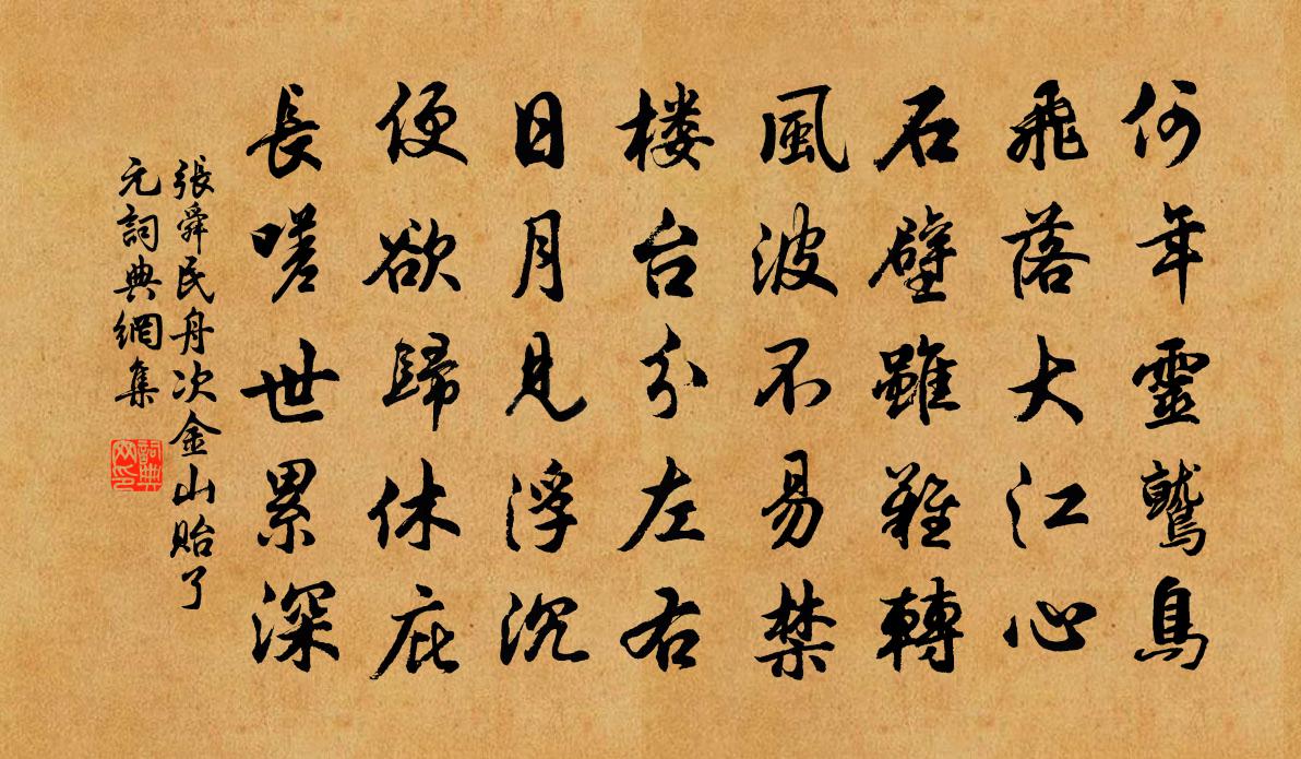 詩詞名句歷史字典書法欣賞書法字典國語詞典說文解字康熙字典古漢語字典標 題 作 者 詩 句 舟次金山貽了元作者:張舜民 朝代:宋代舟次金山貽了元原文何年靈鷲鳥,飛落大江心。石壁雖難轉,風波不易禁。樓台分左右,日月見浮沉。便欲歸休庇,長嗟世累深。詩詞問答問:舟次金山貽了元的作者是誰?答:張舜民問:舟次金山貽了元寫於哪個朝代?答:宋代張舜民舟次金山貽了元書法欣賞舟次金山貽了元書法作品詩詞推薦赴官鹹平蔡河阻水泊舟宛兵皇華亭下三首張耒〔宋代〕怒河憑雨正奔流,踏跕卑梁滯去舟。淹泊我生應有定,不須歸怨一污溝。寶相花舒岳祥〔宋代〕春風不到上林花,流落民間日又斜。曾向玉堂承雨露,可堪金屋委塵沙。生來富貴由天分,到底風流出內家。莫訝陳郎玉汝之官劉克莊〔宋代〕擇地喜將父,戴星勤坐曹。阿奴已傷錦,君子好更□。大尹徵求寡,先賢撫字勞。直須琴調古,莫倚棒頭高。剔銀燈(仙呂調)柳永〔宋代〕何事春工用意。繡畫出、萬紅千翠。艷杏夭桃,垂楊芳草,各斗雨膏煙膩。如斯佳致。早晚是、讀書天氣。漸漸園次韻李千秋中秋牟巘五〔宋代〕節物詩情總索然,漫將梨栗當盤筵。堪憐永夜空樽月,記取衰翁斷酒年。十日尚留花影在,兩瓶便作竹根眠。分明又次韻帥初諸前七首陳著〔宋代〕君是能詩猶可及,及君不可是吾年。有懷伐木相求意,但誦投瓜永好篇。沁園春(二鹿)劉克莊〔宋代〕馴於蹇驢,清於賜駒,我行爾從。幸柴車堪駕,何慚韓眾,藥苗可采,長伴龐公。野澗泉甘,陽坡草暖,有柏葉松下手遲丘處機〔元代〕物外優遊散誕身。似青霄、一片閒雲。任虛空、來往呈嘉瑞,但不惹纖塵。八表天游何所親。會三光、日月星辰。水龍吟(壽李尚書)程珌〔宋代〕道家弱水蓬萊,鯨波萬里誰知得。人間自有,南昌居士,仙風道骨。詩似白星,貌如聃老,風塵挺出。向謫仙家裡南遊於武陵〔唐代〕窮秋幾日雨,處處生蒼苔。舊國寄書後,涼天方雁來。露繁山草濕,洲暖水花開。去盡同行客,一帆猶未回。夜喜賀蘭三見訪賈島〔唐代〕漏鍾仍夜淺,時節慾秋分。泉聒棲松鶴,風除翳月雲。踏苔行引興,枕石臥論文。即此尋常靜,來多只是君。征婦詞十首劉克莊〔宋代〕去時兒在腹,忽已語嚘啞。何日番休了,迎爺兩手叉。春歸蘇泂〔宋代〕十日晴明九日非,人家庭院綠成幃。春風怕見匆忙去,莫放楊花一點飛。小重山(家人生日)毛滂〔宋代〕鶴舞青青雪裡松。冰開龜在藻,綠蒙茸。一成不記蕊珠宮。蟠桃熟,應待幾東風。玉酒紫金鍾。非煙羅幕暖,寶熏大覺高僧蘭若(和尚去冬往湖南)杜甫〔唐代〕巫山不見廬山遠,松林蘭若秋風晚。一老猶鳴日暮鍾,諸僧尚乞齋時飯。香爐峰色隱晴湖,種杏仙家近白榆。飛錫立春都堂受誓祭九宮壇方岳〔宋代〕欠伸殘夢雪髼忪,只等三茅午夜鍾。傳鑰省門星斗濕,不知春已轉蒼龍。楊柳枝詞滕邁〔唐代〕三條陌上拂金羈,萬里橋邊映酒旗。此日令人腸欲斷,不堪將入笛中吹。贈河陽李大夫(李芃,河陽節度使)韓愈〔唐代〕四海失巢穴,兩都困塵埃。感恩由未報,惆悵空一來。裘破氣不暖,馬羸鳴且哀。主人情更重,空使劍鋒摧。酹江月王哲〔元代〕正陽的祖,又純陽師父,修持深奧。更有真尊唯是叔。海蟾同居三島。弟子重陽,侍尊玄妙。手內擎芝草。歸依至寄贈湯司諫二首趙蕃〔宋代〕御史曾追慶曆唐,有孫還是紹興湯。絕知驥騄難羇絆,故遣松筠試雪霜。如許人才豈終棄,要之日月本何傷。郁孤名句推薦惱他香閣濃睡,撩亂有啼鶯。晏殊《訴衷情·東風楊柳欲青青》 君子敬其在己者,而不慕其在天者,是以日進也。荀子《荀子·天論》 一襟余恨宮魂斷,年年翠陰庭樹。仇遠《齊天樂·蟬》 天子,兵強馬壯者當為之,寧有種耶!薛居正《舊五代史·後晉·列傳十三》 感之欲嘆息,對酒還自傾。李白《春日醉起言志》 大雪北風催,家家貧白屋。環山樵《薛寶釵·雪竹》 離宮絕曠,身體摧藏,志念沒沉,不得頡頏。王昭君《怨詞》 月下飛天鏡,雲生結海樓。李白《渡荊門送別》 夜深靜臥百蟲絕,清月出嶺光入扉。韓愈《山石》 夜來小雨新霽,雙燕舞風斜。万俟詠《訴衷情·送春》