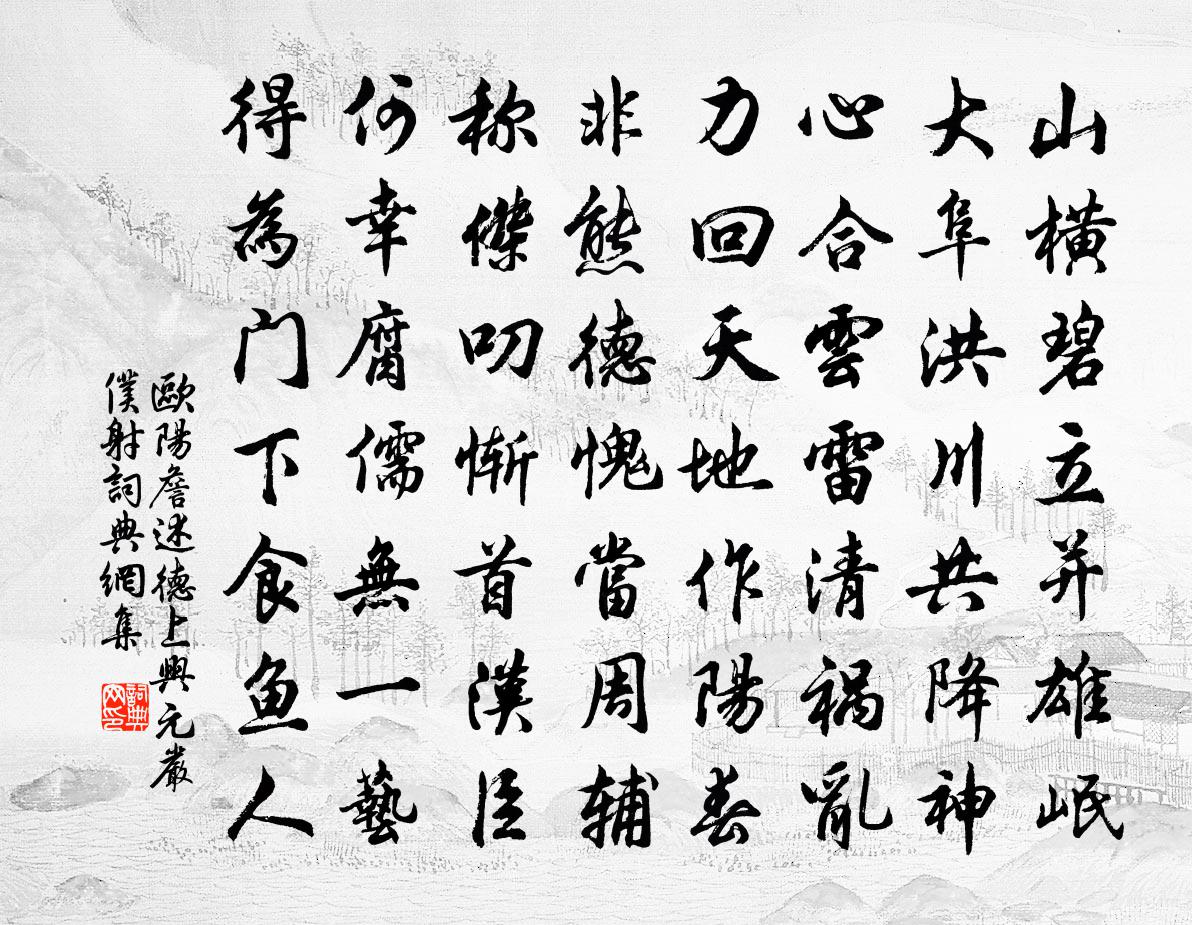 詩詞名句歷史字典書法欣賞書法字典國語詞典說文解字康熙字典古漢語字典標 題 作 者 詩 句 述德上興元嚴僕射作者:歐陽詹 朝代:唐代述德上興元嚴僕射原文山橫碧立並雄岷,大阜洪川共降神。心合雲雷清禍亂,力回天地作陽春。非熊德愧當周輔,稱傑叨慚首漢臣。何幸腐儒無一藝,得為門下食魚人。詩詞問答問:述德上興元嚴僕射的作者是誰?答:歐陽詹問:述德上興元嚴僕射寫於哪個朝代?答:唐代問:述德上興元嚴僕射是什麼體裁?答:七絕歐陽詹述德上興元嚴僕射書法欣賞述德上興元嚴僕射書法作品注釋全唐詩:卷349-38詩詞推薦聞角章孝標〔唐代〕邊秋畫角怨金微,半夜對吹驚賊圍。塞雁繞空秋不下,胡云著草凍還飛。關頭老馬嘶看月,磧里疲兵淚濕衣。餘韻三謠素屏謠白居易〔唐代〕素屏素屏,胡為乎不文不飾,不丹不青?當世豈無李陽冰之篆字,張旭之筆跡?邊鸞之花鳥,張璪之松石?吾不令郊祀慶成詩程珌〔宋代〕謂聖惟鄉饗,由心克致虔。天心今答聖,聖意更祈天。沖性猶勤德,搜求愈任賢。愚臣輸至款,端在賦甘泉。久上人出丐乞頌釋正覺〔宋代〕孤禪抖擻起僧氈,掛缽寒藤著瘦肩。破夜無私看霽月,開華不染出泥蓮。底心眾事水雲餓,何處人家粥飯緣。寄語嘲高士廉木履選人〔唐代〕刺鼻何曾嚏,蹋面不知嗔。高生兩個齒,自謂得勝人。題請息齋六言范成大〔宋代〕灩澦年年似馬,太行日日摧車。笑中恐有義甫,泣里難防叔魚。致仕後即事陸游〔宋代〕不嫌雞瘦濁醪酸,草草杯盤具亦難。食指忽搖方竊喜,小兒來請賽鄱官。次梁粹錄囚上饒方岳〔宋代〕此老清如許,寧求使節知。檄分風憲重,山到月岩奇。秋色深宜雨,寒花併入詩。聖朝本仁厚,鼠輩亦吾兒。少保席間道襄州朋舊項安世〔宋代〕持杯相向各言衰,憶得襄州未老時。曉踏青山尋秀句,夜簪紅藥聽新詞。只言坐上皆豪逸,誰信人間有別離。頭白蘭亭歸途陳起〔宋代〕山水佳如此,都忘客路難。鷗明寒渚淨,雁入野田寬。事久人多厭,心清夢卻安。獨憐鸞翼遠,誰念篋衣單。夏始和劉潺陵詩謝朓〔南北朝〕威仰窗弛蒼郊窗。龍曜窗表遙甸窗。炎光麗近邑。白苹望已騁。緗荷紛可襲。徒願尺波旋。終憐寸景戢。對窗斜日偈傾一百三十三首釋法薰〔宋代〕去卻一,拈得七。通天大路,萬重鐵壁。楓橋心肝五臟,一時剖出。臭骨頭,信彩擲。百千萬種神通,只消道個不奉和吏部楊尚書太常李卿二相公策免後即事述劉禹錫〔唐代〕文雅席關西族,席衣冠趙北席都。有聲真漢相,無纇勝隋珠。當軸龍為友,臨池鳳不孤。九天開內殿,百辟看晨趨又賡宋璲韻朱元璋〔明代〕清和未至尚春風,花幕園林似錦紅。細雨只教成子速,蕊飛彩蝶最多功。長飢陸游〔宋代〕病臥窮閰負聖時,本來吾道合長飢。朝不及夕未妨樂,死何如生行自知。早年羞學仗下馬,末路幸似泥中龜。煙波小醉吳可〔宋代〕小醉初醒過竹村,數家殘雪擁籬根。風前有恨梅千點,溪上無人月一痕。雜劇·張公藝九世同居佚名〔元代〕第一折(正末領大末、二末、三未淨行錢上)(正末雲)老夫姓張名公藝,壽張縣人氏。嫡親的四口兒家屬。老夫次主簿雪韻楊萬里〔宋代〕向來一雪亦草草,天知詩人眼未飽。相傅南風為雪骨,此言未試吾不膮。胙日忽驚冬作春,暖氣吹人軟欲倒。惟余渭上秋夕閒望魏野〔宋代〕秋夕滿秦川,登臨渭水邊。殘陽初過雨,何樹不鳴蟬。極浦涵新月,孤帆沒遠煙。漁人空老盡,誰似太公賢。紹興親享明堂二十六首佚名〔宋代〕四阿有嚴,神既戾止。佃物雖們,潔誠惟已。有來振振,相我熙事。載酌陶匏,以成毖祀。名句推薦林花謝了春紅,太匆匆。無奈朝來寒雨晚來風。李煜《相見歡·林花謝了春紅》 別有根芽,不是人間富貴花。納蘭性德《採桑子·塞上詠雪花》 千形萬象竟還空,映水藏山片復重。來鵠《雲》 求備之心,可用之以修身,不可用之心接物王永彬《圍爐夜話·第一五九則》 午醉未醒紅日晚,黃昏簾幕無人卷。蘇軾《蝶戀花·蝶懶鶯慵春過半》 積土成山,風雨興焉;積水成淵,蛟龍生焉;荀子《勸學》 杪秋霜露重,晨起行幽谷。柳宗元《秋曉行南谷經荒村》 巴山重疊相逢處。燕子占巢花脫樹。張先《漁家傲·和程公辟贈》 惡之者眾則危。荀子《荀子·正論》 明敕星馳封寶劍,辭君一夜取樓蘭。王昌齡《從軍行七首》