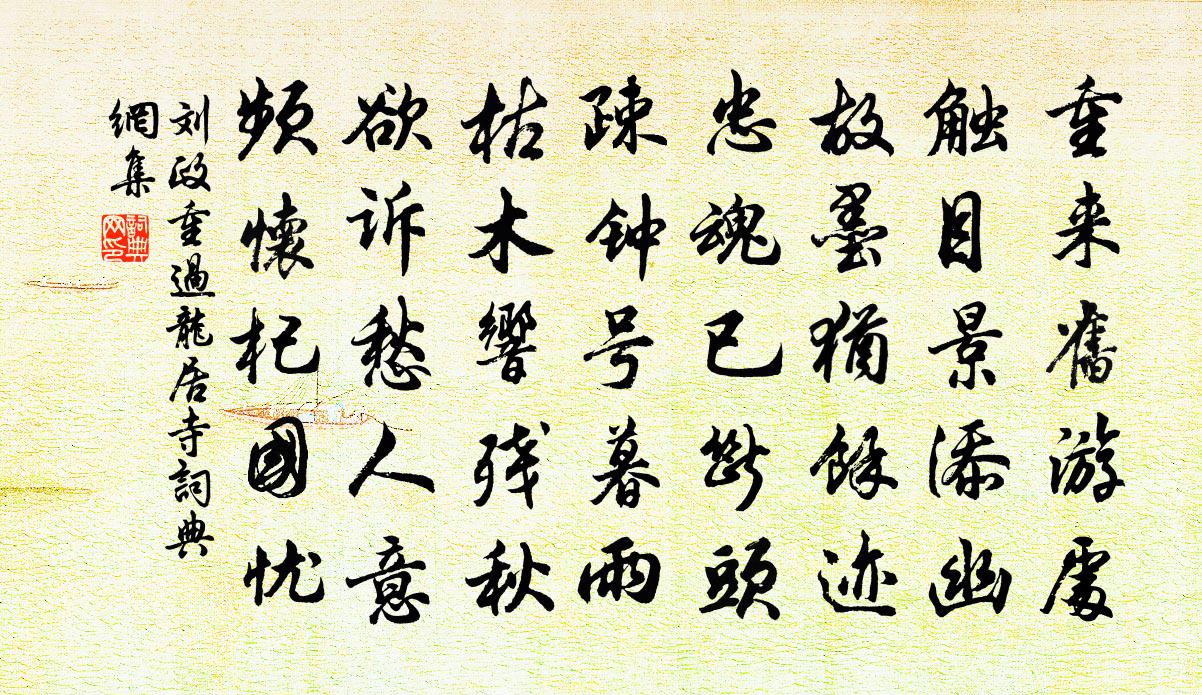 詩詞名句歷史字典書法欣賞書法字典國語詞典說文解字康熙字典古漢語字典標 題 作 者 詩 句 重過龍居寺作者:劉政 朝代:宋代重過龍居寺原文重來舊遊處,觸目景添幽。故墨猶余跡,忠魂已斷頭。疎鍾號暮雨,枯木響殘秋。欲訴愁人意,頻懷杞國憂。詩詞問答問:重過龍居寺的作者是誰?答:劉政問:重過龍居寺寫於哪個朝代?答:宋代劉政重過龍居寺書法欣賞重過龍居寺書法作品詩詞推薦代趙儀可挽劉叔丙蔡戡〔宋代〕此士不可得,鄉人今始思。迎賓多事日,教子廢科時。望屋訟自止,弄丸爭者誰。京華攜手處,憶著最傷悲。長思仙 贈眾女姑馬鈺〔元代〕女姑聽。女姑聽。學取 * 至淨清。依他妙善行。莫惺惺。莫惺惺。外做憨痴內自靈。功成赴玉京。偈釋善昭〔宋代〕胡僧金錫光,為法到汾陽。六人成大器,勸請為敷揚。采菱歌鮑照〔南北朝〕思今懷近憶。望古懷遠識。望古復懷今。長懷無終極。和四兄閒居感嘆有作晃沖之〔宋代〕掩卷忽不樂,捫心空浩嘆。家聲畏淪墜,世態屬艱難。月倒迎門屣,風彈掛壁冠。蕭然對孤竹,一笑共衰殘。寶應寺曾季貍〔宋代〕檀心素麵水沉香,一架清陰滿院涼。莫道春歸無覓處,春歸卻在贊公房。酬樂天頻夢微之元稹〔唐代〕山水萬重書斷絕,念君憐我夢相聞。我今因病魂顛倒,唯夢閒人不夢君。國朝自建隆至大中祥符七年垂五十載謝頤素始陳逸賞〔宋代〕死卻王褒五百春,資中不見有詞臣。今朝忽遇登龍客,喜殺西郊謝逸人。句楊炎正〔宋代〕吟詩報答閒。桂吳泳〔宋代〕團團玉葉振天芳,清澈瓊樓午夜光。元是小山分鐘去,移來西蜀作甘棠。湖州歌九十八首 其四十汪元量〔宋代〕鳳管龍笙處處吹,都民欣樂太平時。宮娥不識興亡事,猶唱宣和御製詞。游高陽里閻爾梅〔清代〕四野紅霜牧笛愁,悲風蹈厲卷河流。高陽里在無人醉,廣武墳凋幾樹秋。作客長眠蘆絮榻,尋僧閒坐菊花樓。田家詠月三首王安石〔宋代〕一片清光萬里兼,幾回圓極又纖纖。君看出沒非無意,豈為辛懃養玉蟾。和史侍郎游澹岩韻六首曾協〔宋代〕九重溫詔下江邊,應覽甘泉舊奏篇。卻背煙嵐理歸棹,曉猿夜鶴總悽然。漢宮春(雪)王之道〔宋代〕歡動江城,快風聲震地,雲勢頹山。半年不雨,玉霙來溉冬乾。飄飄弱絮,雜檐花、飛上賓筵。疏林表,數行征雁題花光畫山水黃庭堅〔宋代〕花光寺下對雲沙,欲把輕舟小釣車。更看道人煙雨筆,亂峰深處是吾家。禾山秋興歐陽鈇〔宋代〕夜起集萬感,胡為淹此留。詩成夔子國,人在仲宣樓。絡緯聲中淚,芭蕉雨里愁。遙知屢門倚,應念有方游。嶺外守歲(一作李德裕詩)李福業〔唐代〕冬去更籌盡,春隨斗柄回。寒暄一夜隔,客鬢兩年催。難忘曲趙崇嶓〔宋代〕弱花低繡檻,月滿綠楊津。一笑領深意,過於三月春。樽前停妙舞,堂上設華裀。上客不須醉,相將夜向晨。趙妹自鹹陽寄華州石縫山芋來作絕句二首晁說之〔宋代〕華州石縫無端芋,同谷齋中有恨翁。卯詩調來家法在,蹔時不哭此途窮。名句推薦撥雲尋古道,倚石聽流泉。李白《尋雍尊師隱居》 半夜倚喬松,不覺滿衣雪。孟郊《苦寒吟》 閉門覓句陳無己,對客揮毫秦少游。黃庭堅《病起荊江亭即事》 激濁揚清,嫉惡好善吳兢《貞觀政要·卷二·論任賢》 荒煙涼雨助人悲,淚染衣襟不自知。王安石《送和甫至龍安微雨》 哀蟬無留響,叢雁鳴雲霄。陶淵明《己酉歲九月九日》 君者,舟也;庶人者,水也。水則載舟,水則覆舟。荀子《荀子·哀公》 用功於內者,必於外無所求王永彬《圍爐夜話·第一八八則》 酒酣應對燕山雪,正冰河月凍,曉隴雲飛。周密《高陽台·送陳君衡被召》 白髮悲明鏡,青春換敝裘。岑參《武威春暮聞宇文判官西使還已到晉昌》
