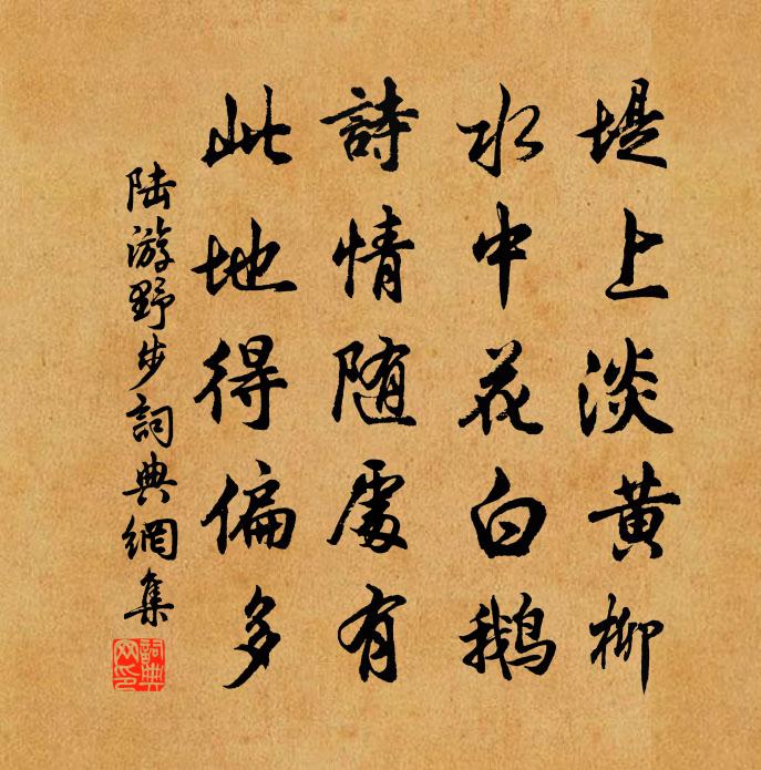 詩詞名句歷史字典書法欣賞書法字典國語詞典說文解字康熙字典古漢語字典標 題 作 者 詩 句 野步作者:陸游 朝代:宋代野步原文堤上淡黃柳,水中花白鵝。詩情隨處有,此地得偏多。詩詞問答問:野步的作者是誰?答:陸游問:野步寫於哪個朝代?答:宋代問:陸游的名句有哪些?答:陸游名句大全陸游野步書法欣賞野步書法作品詩詞推薦失調名蘇軾〔宋代〕誰教幽夢裡, * 花。讀史蕭澥〔宋代〕雁門翼處不身親,成事安知非楚人。何事當年良史筆,嗇於一傳著功臣。嘗惠山泉梅堯臣〔宋代〕吳楚千萬山,山泉莫知數。其以甘味傳,幾何若飴露。大禹書不載,陸生品嘗著。昔唯廬谷亞,久與茶經附。相襲呈摺子明丈十首趙蕃〔宋代〕故家人物幾沈淪,公獨風流似昔人。不但金聲吐佳句,尚余玉立聳長身。擬玉台體七首落日窗中歐陽修〔宋代〕朝聞驚禽去,日暮見禽歸。瑤琴坐不理,含情復為誰。浣溪沙 至元九年秋九月,登秋風亭觀雨,賦王惲〔元代〕雨勢蒼山共一雲。雨聲作氣張三軍。秋風亭下葉繽紛。官事何憂嚴限促,天心不負老農勤。夜窗孤客儘先聞。夕月十首佚名〔宋代〕猗歟崇基,右平左誠。祗率典常,屈茲秋夕。陟降惟寅,威們抑抑。神其鑒觀,穰簡是集。題徐壽畫牛仇遠〔宋代〕此大武者,二十八蹄。茂樹之下,豐草萋萋。牧童且嬉,夕陽未西。何如桃林,歸去來兮。醉後贈馬四孟浩然〔唐代〕四海重然諾,吾嘗聞白眉。秦城遊俠客,相得半酣時。夏日題悟空上人院杜荀鶴〔唐代〕三伏閉門披一衲,兼無松竹蔭房廊。安禪不必須山水,滅得心中火自涼。清商怨·關河愁思望處滿歐陽修〔宋代〕關河愁思望處滿。漸素秋向晚。雁過南雲,行人回淚眼。雙鸞衾裯悔展。夜又永、枕孤人遠。夢未成歸,梅花聞塞遠父往富沙兼簡馬莊父二首趙蕃〔宋代〕子過鉛山縣,知名有尉曹。談端抽繭紝,文力壯波濤。見子心應識,思渠首屢搔。共為徐庶友,而獨不能高。冥鴻閣即事四首白玉蟾〔宋代〕夜飲青蓮居士家,高吟大笑對梅花。饕杯自喜更籌緩,醉墨偏隨燭影斜。資殿清惠陳公哀詩三首劉克莊〔宋代〕不比堯夫新悅澤,依然迂叟舊清羸。末年先帝攀髯恨,幾處遺民隨淚碑。上自易名真獨斷,史當立傳要雄辭。道山王聖美三子補中廣文生黃庭堅〔宋代〕王家人物從來遠,今見諸孫總好賢。 * 定知魚尾進,一鳴已作雁行連。愧無藻監能推轂,願卷囊書當贈錢。歸去浣花女陸游〔宋代〕江頭女兒雙髻丫,常隨阿母供桑麻。當戶夜織聲咿啞,地爐豆秸煎土茶。長成嫁與東西家,柴門相對不上車。青裙即事趙若槸〔宋代〕雲散春山出,人閒白晝長。禽聲答空谷,樹影畫斜陽。種果期秋實,澆花趁晚涼。行藏天已定,隨分且徜徉。送朱大入秦孟浩然〔唐代〕遊人五陵去,寶劍值千金。分手脫相贈,平生一片心。夜坐觀星戴良齊〔宋代〕中夜不能旦,浩蕩思無期。茫茫宇宙間,俯仰伊何時。起坐憑前欄,粲粲天南垂。寒芒燭辰尾,歲德何所司。耿耿六言四鄧深〔宋代〕嗟此地得何晚,見孤芳陋群妍。小試鳳樓工巧,終圖麟閣風煙。名句推薦日星隱曜,山嶽潛形;范仲淹《岳陽樓記》 時無英雄,使豎子成名!房玄齡《晉書·列傳·第十九章》 紅豆不堪看,滿眼相思淚。牛希濟《生查子·新月曲如眉》 下謀上以術,術有窮者以力。來俊臣《羅織經·謀劃卷第九》 肅肅花絮晚,菲菲紅素輕。杜甫《春遠 / 春運》 人異而心異,擇其弱者以攻之,其神必潰。來俊臣《羅織經·問罪卷第十》 迢遞嵩高下,歸來且閉關。王維《歸嵩山作》 常恐秋風早,飄零君不知。盧照鄰《曲池荷》 求個良心管我,留些餘地處人。王永彬《圍爐夜話·第四七則》 大漠風塵日色昏,紅旗半卷出轅門。王昌齡《從軍行七首》