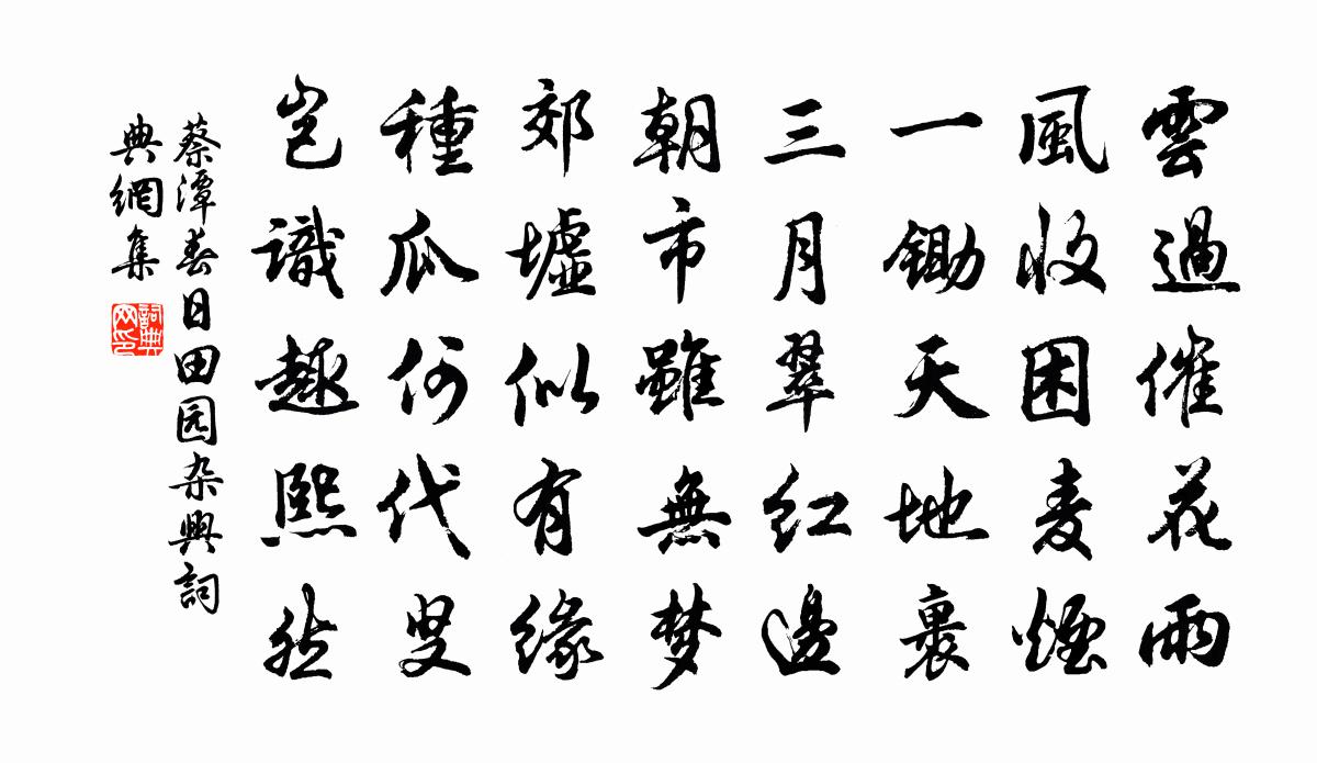 詩詞名句歷史字典書法欣賞書法字典國語詞典說文解字康熙字典古漢語字典標 題 作 者 詩 句 春日田園雜興作者:蔡潭 朝代:宋代春日田園雜興原文雲過催花雨,風收困麥煙。一鋤天地裹,三月翠紅邊。朝市雖無夢,郊墟似有緣。種瓜何代叟,豈識趣熙然。詩詞問答問:春日田園雜興的作者是誰?答:蔡潭問:春日田園雜興寫於哪個朝代?答:宋代蔡潭春日田園雜興書法欣賞春日田園雜興書法作品詩詞推薦郭氏山林十六詠高碧巖陸游〔宋代〕我誦明逸詩,豹林不可到。斯山幸不遠,何日欹紗帽。估客謠二首董嗣杲〔宋代〕浪兒重規利,半世家如寄。千金得美人,長向船窗醉。山中寄凝密大師兄弟齊己〔唐代〕一爐薪盡室空然,萬象何妨在眼前。時有興來還覓句,已無心去即安禪。山門影落秋風樹,水國光凝夕照天。借問曾平山招飲汪元量〔宋代〕老貌不隨俗,固窮而隱居。一塢百竿竹,八窗千卷書。酌以旋篘酒,薦之新網魚。興盡出門去,晚涼山雨余。再和二首蘇轍〔宋代〕病起江南力未勻,強將冠劍拂埃塵。木雞自笑真無用,芻狗何勞收已陳。行從鑾旗風日細,側聽廟樂管弦新。誰知樂牧吟金朋說〔宋代〕牛背日高方睡熟,橫吹短笛不成腔。毛球打罷歸來晚,古木寒雅又夕陽。漢州王氏林亭文同〔宋代〕短彴疏籬入野扃,竹煙松露滿襟清。奔湍激險飛寒響,弱蔓穿深掛晚英。惜去更觀曾畫壁,記來重注舊題名。門前李寅之招飲同登九江城方回〔宋代〕明年公七十,我老眉亦厖。一會豈易得,招呼酒盈缸。慷慨上高城,惻愴臨大江。雪水傾蜀峽,煙樹連淮邦。和夏致宏詠梅張嵲〔宋代〕春嵐初破曉光遲,青女消余泫玉肌。雪後離披憐落蕊,溪旁婉約愛橫枝。不隨姑射乘風去,定與飛仙待月期。山靜偈傾一百三十三首釋法薰〔宋代〕釋迦已往,彌勒未生。正當無佛世界,大地共樂昇平。不圖打草,只要蛇驚。明日雨不止風加甚趙蕃〔宋代〕大雨曉未止,疾風朝更顛。茅飛疏我屋,禾偃病民田。未可專時戾,多繇得地偏。雖然豈無念,衣薄尚無綿。宣和殿畫水仙鴝鵒圖王冕〔元代〕玉宇瓊樓天窅窅,春融紫禁菸花繞。龍光搖動五色雲,忽覺青蒲生野草。河圖埋沒龍馬藏,上林桑谷一夜長。丹穴梅花五首楊公遠〔宋代〕橫隔片煙爭向靜,深藏翠幕全真性。霞拖數日初腦沉,月掛一眉天未暝。問訊頻敲碧玉枝,覓詩踏遍蒼苔逕。有時贊歷代天師第二十二代諱善字長元白玉蟾〔宋代〕參遍名山謁洞天,相逢卻是活神仙。歸來換骨回陽日,屈指人間九十年。贈苗端公二首薛能〔唐代〕繁總近何如,君才必有餘。身歡步兵酒,吏寫魯連書。坐默聞鼙吹,庭班見雪初。沉碑若果去,一為訪鄰居。至老傷白積殿丞林逋〔宋代〕吏散門牆轉寂然,疏狂投分向生前。苦無名位高今世,空有文章出古賢。遺傳得誰修闕下,孤墳應祇客江邊。池陽西江月(再游龍隱岩,追和陶商翁韻)方信孺〔宋代〕碧洞青崖著雨,紅泉白石生寒。朅來十月九湖山。人笑元郎太漫。絕壑偏宜疊鼓,夕陽休喚歸鞍。茲游未必勝驂鸞木蘭花令周邦彥〔宋代〕歌時宛轉饒風措。鶯語清圓啼玉樹。斷腸歸去月三更,薄酒醒來愁萬緒。孤燈翳翳昏如霧。枕上依稀聞笑語。惡嫌春日餐霞閣施肩吾〔唐代〕灑水初晴物候新,餐霞閣上最宜春。山花四面風吹入,為我鋪床作錦茵。隴右途中遭非語員半千〔唐代〕趙有兩毛遂,魯聞二曾參。慈母猶且惑,況在行路心。冠冕無醜士,賄賂成知己。名利我所無,清濁誰見理。敝服名句推薦獨倚危欄,神遊無際,天地猶嫌隘。朱栴《念奴嬌·雪霽夜月中登樓望賀蘭山作》 菀菀黃柳絲,濛濛雜花垂。常建《春詞二首》 試問春歸誰得見?飛燕,來時相遇夕陽中。辛棄疾《定風波·暮春漫興》 平明尋白羽,沒在石棱中。盧綸《和張僕射塞下曲六首》 養其小者為小人,養其大者為大人。孟子《孟子·告子章句上·第十四節》 遠路應悲春晼晚,殘霄猶得夢依稀。李商隱《春雨》 布被秋宵夢覺,眼前萬里江山。辛棄疾《清平樂·獨宿博山王氏庵》 萬里歸來顏愈少,微笑,笑時猶帶嶺梅香。蘇軾《定風波·南海歸贈王定國侍人寓娘》 相思休問定何如。情知春去後,管得落花無。晁沖之《臨江仙·憶昔西池池上飲》 倦遊京洛風塵,夜來病酒無人問。晁端禮《水龍吟·詠月》