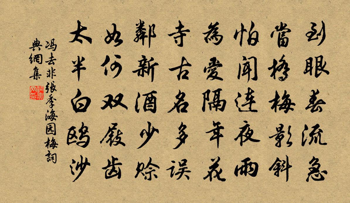 詩詞名句歷史字典書法欣賞書法字典國語詞典說文解字康熙字典古漢語字典標 題 作 者 詩 句 張季海園梅作者:馮去非 朝代:宋代張季海園梅原文到眼春流急,當橋梅影斜。怕聞連夜雨,為愛隔年花。寺古名多誤,鄰新酒少賒。如何雙屐齒,太半白鷗沙。詩詞問答問:張季海園梅的作者是誰?答:馮去非問:張季海園梅寫於哪個朝代?答:宋代問:張季海園梅是什麼體裁?答:五古馮去非張季海園梅書法欣賞張季海園梅書法作品詩詞推薦踏莎行王以寧〔宋代〕位正三槐,光生九族。人間一夢黃粱熟。邇來荊楚地行仙,卜居深在延原北。笑問從前,誰調玉燭。當筵鮑老那能湖州歌九十八首 其五十汪元量〔宋代〕使臣開閘過高郵,楊柳絲絲拂去舟。宮女開篷猶自笑,閒拋金彈打沙鷗。夜蚊楊簡〔宋代〕夜蚊告教一何奇,妙語都捐是與非。偏向耳旁呈雅奏,直來面上發深機。惜哉頑固終難入,多是聾迷聽者希。費盡棲白庵呂江〔宋代〕門外竹千個,崖顛兩徑分。奔泉流碎月,高樹礙行雲。遊客倦欲臥,道人言少文。但云秦學士,曾此遇茅君。頌古五十五首釋紹曇〔宋代〕太平時節歲豐登,旅不齎糧永不扃。官路無人夜無月,唱歌歸去月三更。詠史 九年十一月作。白居易〔唐代〕秦磨利刀斬李斯,齊燒沸鼎烹酈其。可憐黃綺入商洛,閒臥白雲歌紫芝。彼為菹醢機上盡,此作鸞凰天外飛。去者迎神李建勛〔唐代〕攂蠻鼉,吟塞笛,女巫結束分行立。空中再拜神且來,滿奠椒漿齊獻揖。陰風窣窣吹紙錢,妖巫瞑目傳神言。與君山居丁謂〔宋代〕峒口清香徹海濱,四時芬馥四時春。山多綠桂憐同氣,谷有幽蘭讓後塵。草解忘憂憂底事,花能含笑笑何人。爭如古樂府鄧允端〔宋代〕梧桐葉落秋容早,夜夜寒蛩泣衰草。鳳釵金冷鬢雲凋,可惜紅顏鏡中老。音塵望斷沈雙鯉,喚起相思何日已。瑣窗路逢襄揚楊少府入城,戲呈楊四員外綰杜甫〔唐代〕寄語楊員外,山寒少茯苓。歸來稍暄暖,當為劚青冥。翻動神仙窟,封題鳥獸形。兼將老藤杖,扶汝醉初醒。送坊州賈監軍徐鉉〔唐代〕聖主欲東封,憐君四護戎。鄉心經霸岸,詩思省豳風。舊業今成旅,朱顏已變翁。忘懷一杯酒,閒夜與誰同。棲霞寺趙伯晟〔宋代〕棲霞境界何清壯,岳立五峰如列障。三徵不復見高人,千刻尚能瞻寶相。摩空老木韻秋聲,雲屋天岩滿意行。夜闌題靈鷲窗劉子翬〔宋代〕翠合初疑無路往,停鞭邂逅成清賞。僧爐坐穩紙窗明,細雨忽來山竹響。沁園春李道純〔元代〕說與學人,火無斤兩,候無卦爻。也沒抽添,也無作用,既無形象,不必烹炮。件件非真,般般是假,著意作工空丁田家有贈王維〔唐代〕君心尚棲隱,久欲傍歸路。在朝每為言,解印果成趣。晨雞鳴鄰里,群動從所務。農夫行餉田,閨妾起縫素。開軒悼周晉仙釋永頤〔宋代〕詩救元和失,先生學最精。律嚴方苦硬,才大始縱橫。貞曜何須謚,魏閒相繼生。他年詩集著,風雅被家聲。鷓鴣天辛棄疾〔宋代〕上巳風光好放懷。憶君猶未看花回。茂林映帶誰家竹,曲水流傳第幾杯。摛錦繡,寫玫瑰。長年富貴屬多才。要知僻居秋思寄友人伍喬〔唐代〕門巷秋歸更寂寥,雨餘閒砌委蘭苗。夢回月夜蟲吟壁,病起茅齋藥滿瓢。澤國舊遊關遠思,竹林前會負佳招。身名胡寅赴明州慈谿尉宋祁〔宋代〕久困天官調,東南亦第如。客篙新溜急,春樹雜花餘。越{榷木換月}豐池鴨,吳袍競庫綀。還音與歸夢,併附浙老樹戴表元〔宋代〕老樹老且枯,數柯枝綴之。蟲來食其葉,藤來纏其皮。幸然根本堅,未至甚雕披。風霜既無損,雨露猶見私。如何名句推薦萬一禪關砉然破,美人如玉劍如虹。龔自珍《夜坐二首》 前不見古人,後不見來者。陳子昂《登幽州台歌》 山寺月中尋桂子,郡亭枕上看潮頭。白居易《憶江南·江南憶》 波上馬嘶看棹去,柳邊人歇待船歸。溫庭筠《利州南渡》 牽牛織女遙相望,爾獨何辜限河梁。曹丕《燕歌行二首·其一》 風蕭蕭兮易水寒,壯士一去兮不復還。佚名《荊軻歌 / 渡易水歌》 章台柳,章台柳,昔日青青今在否?韓翃《章台柳·寄柳氏》 數樹梨花,晚風吹墮半汀鷺。吳文英《齊天樂·新煙初試花如夢》 窈窕淑女,君子好逑。佚名《關雎》 一曲新詞酒一杯,去年天氣舊亭台。晏殊《浣溪沙·一曲新詞酒一杯》