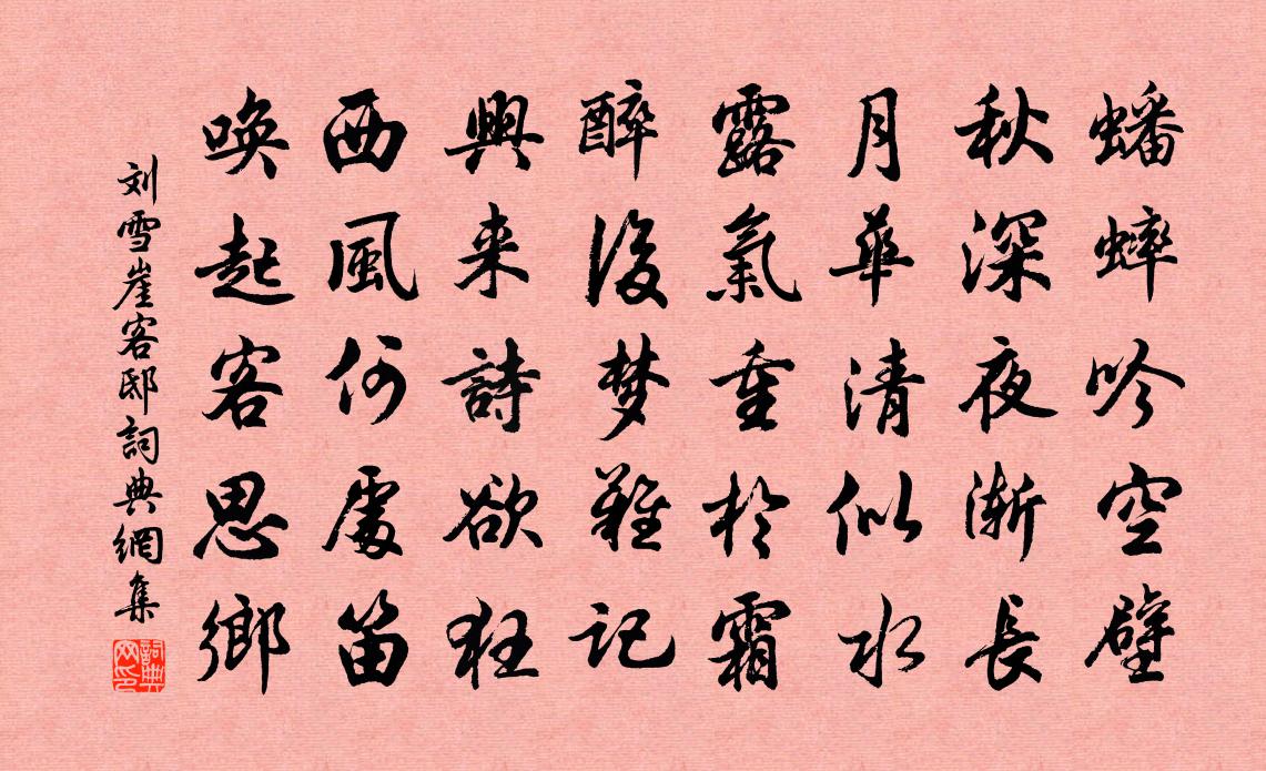 詩詞名句歷史字典書法欣賞書法字典國語詞典說文解字康熙字典古漢語字典標 題 作 者 詩 句 客邸作者:劉雪崖 朝代:宋代客邸原文蟠蟀吟空壁,秋深夜漸長。月華清似水,露氣重於霜。醉後夢難記,興來詩欲狂。西風何處笛,喚起客思鄉。詩詞問答問:客邸的作者是誰?答:劉雪崖問:客邸寫於哪個朝代?答:宋代劉雪崖客邸書法欣賞客邸書法作品詩詞推薦失鶴劉學箕〔宋代〕頂上新成九轉丹,□花日日到春壇。夜深飛上雲霄去,華表月明風露寒。頌古一百首釋智愚〔宋代〕事到無心不苟欺,鳥玄鵠白尚懷疑。自非親見黃頭老,爭敢逢人匯漏伊。送沈記室夜別范雲〔南北朝〕桂水澄夜氛,楚山清曉雲。秋風兩鄉怨,秋月千里分。寒枝寧共采,霜猿行獨聞。捫蘿正意我,折桂方思君。酬刑部姚郎中馬戴〔唐代〕路歧人不見,尚得記心中。月憶瀟湘渚,春生蘭杜叢。鳥啼花半落,人散爵方空。所贈誠難答,泠然一榻風。贈從孫義興宰銘李白〔唐代〕天子思茂宰,天枝得英才。朗然清秋月,獨出映吳台。落筆生綺繡,操刀振風雷。蠖屈雖百里,鵬鶱望三台。退食答戴用齋教諭羅公升〔宋代〕學書早無書成,學劍書老可怕書。不如書反初服,一鍤始學稼。雖煩遠公招,實恐惠子嚇。綸言若春風,枯朽歘變投所知李中〔唐代〕孤琴塵翳劍慵磨,自顧泥蟠欲奈何。千里交親訊息斷,一庭風雨夢魂多。題橋未展相如志,叩角誰憐甯戚歌。唯賴有感 其四王冕〔元代〕依違思故里,吟嘯倚闌乾。野水隨潮漲,山雲帶雨寒。歸鴻悲別漵,羈客呆長安。何日干戈息?山林樂考□。偈頌六十首釋曇華〔宋代〕現成公案,百匝千重。峻如嶮崖,平如鏡面。執之失度,必入邪路。放之自然,體無去住。御苑採茶歌十首熊蕃〔宋代〕雲腴貢使手親調,旋放春天采玉條。伐鼓危亭驚曉夢,嘯呼齊上苑東橋。雷塘晚歸王珪〔唐代〕塘梢黯黯夕雲低,蒼莽荒原望四迷。海日光寒銜島樹,江潮聲暴壓城鼙。喬林風勁橫鵰眼,淺草霜乾快馬蹄。戰血雪岩釋可湘〔宋代〕片片不於他處落,當陽突出險崖機。此時築著聱禪客,卒急龐公未得歸。雨徐夤〔唐代〕引電隨龍密又輕,酒杯閒噀得嘉名。千山草木如雲暗,陸地波瀾接海平。灑竹几添春睡重,滴檐偏遣夜愁生。陰妖紹興以後祀五方帝六十首佚名〔宋代〕[圜鍾為宮]離明御正,德協於火。有感其生,維帝是何。帝圖炎炎,貽福錫我。鑒於妥虔,高靈下墮。金剛隨機無盡頌善現起請分第二釋印肅〔宋代〕降伏在何人,能言不能聲。解語非關舌,廓然風月清。雨後散步後園陸游〔宋代〕淡日輕雲未快晴,涓涓溝水去無聲。為憐一徑新 * ,別就牆陰取路行。題李公麟山莊圖其五發真塢蘇轍〔宋代〕山開稍有路,水放亦成川。遊人得所息,真意方澹然。殿前生桂樹陳陶〔唐代〕仙娥玉宮秋夜明,桂枝拂檻參差瓊。香風下天漏丁丁,牛渚翠梁橫淺清,羽帳不眠恨吹笙。棲烏暗驚仙子落,步月蝶戀花納蘭性德〔清代〕眼底風光留不住,和暖和香,又上雕鞍去。欲倩菸絲遮別路,垂楊那是相思樹。惆悵玉顏成間阻,何事東風,不作小院釋紹嵩〔宋代〕小院無人夜,樓高月迥明。偈吟諸祖意,茶試老僧鐺。門掩園林僻,窗虛筆硯輕。殷勤供一笑,一笑可憐生。名句推薦此地朝來餞行者,翻向此中牧征馬。孟浩然《高陽池送朱二》 一年將盡夜,萬里未歸人。戴叔倫《除夜宿石頭驛》 力田不如逢年,善仕不如遇合。司馬遷《史記·佞幸列傳》 以天下之所順,攻親戚之所畔;故君子有不戰,戰必勝矣。孟子《孟子·公孫丑章句下·第一節》 至今雲雨帶愁容,月斜江上,征棹動晨鐘牛希濟《臨江仙·峭壁參差十二峰》 荊溪白石出,天寒紅葉稀。王維《山中》 去意徊徨,別語愁難聽。周邦彥《蝶戀花·早行》 男兒不展風雲志,空負天生八尺軀。馮夢龍《警世通言·卷四十》 雪後燕瑤池,人間第一枝。趙令畤《菩薩蠻·春風試手先梅蕊》 飲馬渡秋水,水寒風似刀。王昌齡《塞下曲四首》