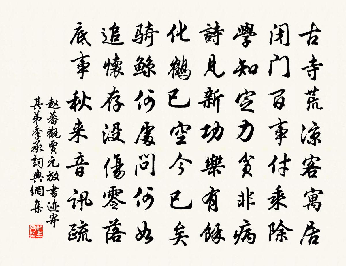 詩詞名句歷史字典書法欣賞書法字典國語詞典說文解字康熙字典古漢語字典標 題 作 者 詩 句 觀賈元放書跡寄其弟季承作者:趙蕃 朝代:宋代觀賈元放書跡寄其弟季承原文古寺荒涼客寓居,閉門百事付乘除。學知定力貧非病,詩見新功樂有餘。化鶴已空今已矣,騎鯨何處問何如。追懷存沒傷零落,底事秋來音訊疏。詩詞問答問:觀賈元放書跡寄其弟季承的作者是誰?答:趙蕃問:觀賈元放書跡寄其弟季承寫於哪個朝代?答:宋代趙蕃觀賈元放書跡寄其弟季承書法欣賞觀賈元放書跡寄其弟季承書法作品詩詞推薦贈閭近道人孫應時〔宋代〕子下幾人能具眼,世間萬事可忘言。猶將筆墨瀾翻說,多笑先生不憚煩。觀文殿學士陳公輓詞樓鑰〔宋代〕幾見衣冠偉,終聞羽翼成。先皇崇舊學,大政任名卿。神器親傳授,崇朝再太平。功成身自退,寵利不豪輕。和清源太保寄湖州潘郎中徐鉉〔唐代〕老大離群一倍愁,谿山風物且淹留。{左酉右昷}成春酒誰斟酌,抄得新書自校讎。莫似牧之矜曠達,須教子重讓東風辭毛滂〔宋代〕凍雲不凝層冰活,阿香推車上空闊。大蛇夢驚鱗甲暖,霰雪影斷清光奪。玉帝手持發生機,馳召東風俾回斡。東風醉蓬萊(舟次東山憶西湖舊遊)張輯〔宋代〕記澄湖抱練,畫舫參差,鬧花時節。油壁鳴堤,有障縈屏列。燕草香融,鴉條香淺,似渭城煙雪。急管斜陽,衛娘送蔡貫之葛紹體〔宋代〕君去江東幾日程,我來東越漫雲萍。客情自是難為別,何況鄉情兼別情。又和游吳氏園二首司馬光〔宋代〕天氣清和無喘牛,花林爛漫竹林幽。臨風高詠足為樂,有勇方知笑仲由。過武陵溪二首張詠〔宋代〕生平苦愛山兼水,南國晴凝侭可攜。即問世間誰見我,扁舟初下武陵溪。初寒姜特立〔宋代〕露冷天寒欲隕霜,夜眠輾轉怯更長。衰翁枕上閒尋句,風入家林月到床。別萱桂白居易〔唐代〕使君竟不住,萱桂徒栽種。桂有留人名,萱無忘憂用。不如江畔月,步步來相送。紹熙癸丑二月二十六日蔣助教言正招游陽華婆李長庚〔宋代〕偶尋三逕到陽華,碧玉珍瓏真可家。追想舊遊如夢寐,摩挲石刻但咨嗟。春日登吳門崔塗〔唐代〕故國望不見,愁襟難暫開。春潮映楊柳,細雨入樓台。靜少人同到,晴逢雁正來。長安遠於日,搔首獨徘徊。寄題黃應亨東明齋二首劉子翬〔宋代〕齋居雅意與誰論,會見依光沐寵恩。慚愧野人欺我懶,相招炙背坐松根。僧德殊家水簾求予詠王安石〔宋代〕淙淙萬音落石顛,皎皎一派當檐前。清風高吹鸞鶴唳,白日下照蛟龍涎。浮雲妝額自能卷,缺月琢鉤相與縣。朱門歸寂頌釋從朗〔宋代〕三十年來住木陳,時中無一假功成。有人間我西來意,展似眉毛作麽生。冬日偶書寇準〔宋代〕戶庭初過雪,鳥雀亦聲稀。天淡雲容結,林寒日影微。虛名何足道,前是旋成非。簪紱全忘念,終須掃澗扉。謁隱士段庭李復〔宋代〕人生何多謀,常甘饑寒侵。裘完甑有炊,於世澹無心。築室清澗曲,窈窕幽徑深。閉門長松下,歲無車馬音。古書哭矩齋先生丘葵〔宋代〕早悟官為崇,晚將家付兒。公今成佛去,仆尚是人猗。柿葉收遺墨,梅花憶贈詩。自嫌聞道晚,有淚哭先師。立秋日出郊有感郭印〔宋代〕霽色千山曉,秋聲一葉風。田原矜雨足,秔芋報年豐。甲冑三軍解,車書萬里同。黎元如永息,和義有深功。閒遊陸游〔宋代〕大冠長劍已焉哉,短褐禿巾歸去來!五世業儒書有種,一生任運仕無媒。麥經小雨家家下,菊著新霜處處開。自笑名句推薦盛而不驕,勞而不矜其功。左丘明《國語·越語·范蠡進諫勾踐持盈定傾節事》 餘霞散成綺,澄江靜如練。謝朓《晚登三山還望京邑》 飛鳥沒何處,青山空向人。劉長卿《餞別王十一南遊》 拆桐花爛熳,乍疏雨、洗清明。柳永《木蘭花慢·拆桐花爛熳》 春雨斷橋人不度,小舟撐出柳陰來。徐俯《春遊湖》 不挾長,不挾貴,不挾兄弟而友。孟子《孟子·萬章章句下·第三節》 不義不昵,厚將崩。左丘明《左傳·隱公·隱公元年》 伊川桃李正芳新,寒食山中酒復春。宋之問《寒食還陸渾別業》 愛人者人恆愛之,敬人者人恆敬之。孟子《孟子·離婁章句下·第二十八節》 長堤春水綠悠悠,畎入漳河一道流。王之渙《宴詞》