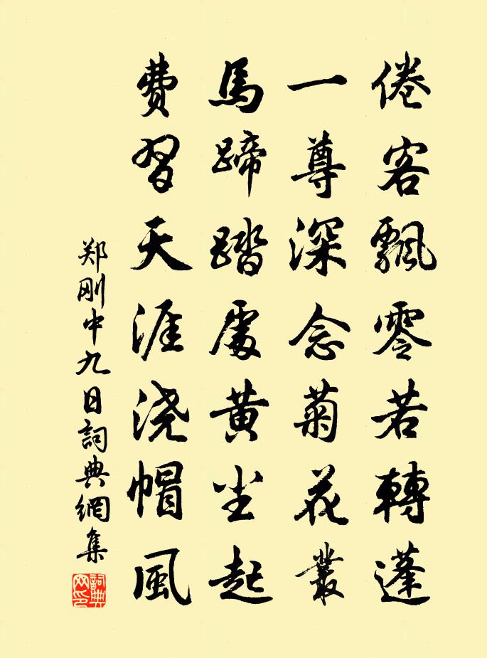 詩詞名句歷史字典書法欣賞書法字典國語詞典說文解字康熙字典古漢語字典標 題 作 者 詩 句 九日作者:鄭剛中 朝代:宋代九日原文倦客飄零若轉蓬,一尊深念菊花叢。馬蹄踏處黃塵起,費習天涯澆帽風。詩詞問答問:九日的作者是誰?答:鄭剛中問:九日寫於哪個朝代?答:宋代鄭剛中九日書法欣賞九日書法作品詩詞推薦通守田太尉生辰二首姜特立〔宋代〕犀許淵角凜英姿,褒鄂凌煙想畫時。建武堂深閒緩帶,籌邊樓迥靜喔詩。曾乘神驥參天仗,還插宮花則寶卮。今日清平樂(呈昌父,時仆以病止酒,昌父日作詩數遍,末章及之)辛棄疾〔宋代〕雲菸草樹。山北山南雨。溪上行人相背去。惟有啼鴉一處。門前萬斛春寒。梅花可摧殘。使我長忘酒易,要君不十月三日相公花下小飲賦四題拒霜梅堯臣〔宋代〕木杪芙蓉花,開非紅艷早。常畏晚霜寒,朱華競衰草。句張文規〔唐代〕誰雲隼旟吏,長對虎頭岩。賦山茶示陳慧甫三首張明中〔宋代〕檀心絳蕊壓牆低,南海山根巧自移。濃艷未應輸石醋,吹香底用倩風姨。送蔣評事往福州皇甫冉〔唐代〕江上春常早,閩中客去稀。登山怨迢遞,臨水惜芳菲。煙樹何時盡,風帆幾日歸。還看復命處,盛府有光輝。奉送浙西李僕射相公赴鎮劉禹錫〔唐代〕建節東行是舊遊,歡聲喜氣滿吳州。郡人重得黃丞相,童子爭迎郭細侯。詔下初辭溫室樹,夢中先到景陽樓。自憐湘山王鞏〔宋代〕半嶺風吹草木香,落階花雨送春忙。從師遠借雲庵臥,還我平生午枕涼。蓮社緇黃常得伴,鹿門妻子亦相將。化身苦雨陸游〔宋代〕盡道迎梅雨,能無一日晴。窗昏愁細字,檐滴亂疏更。未怪蛙爭席,真憂水冒城。何由收積潦,蕭鼓賽西成?奉和詠弓楊師道〔唐代〕霜重麟膠勁,風高月影圓。烏飛隨帝輦,雁落逐鳴弦。閒居釋行海〔宋代〕蕩蕩空山草木青,枝禽飛下菜池冰。夜深月照茅檐靜,翠石幽泉落幾層。答任殿中宗記室王中書別詩蕭衍〔南北朝〕問我去何節。光風正悠悠。蘭華時未晏。舉袂徒離憂。緩客承別酒。鳴琴和好仇。清宵一已曙。藐爾泛長洲。眷言眼兒媚趙長卿〔宋代〕槐陰密處囀黃鸝。午日正長時。一番過雨,綠荷池面,冷浸琉璃。紅塵不到華堂里,纖楚對蛾眉。笑偎人道,新詞散庵即事趙蕃〔宋代〕屋冷頻添火,窗深遠炷香。荊榛白墮境,杖履黑甜鄉。晚日誰雲短,閒身得暫長。畏人成免俗,治藥屢傳方。木蘭花/玉樓春程垓〔宋代〕疏枝半作窺窗老。又是一年春意早。風低小院得香遲,月傍女牆和影好。去年苦被離情惱。今日逢花休草草。後時河陽秋思六首宋庠〔宋代〕自古悲秋物,多傷黯黯魂。鱸魚輕客臣,紈扇感君恩。潁瀨寒明野,嵩雲側露村。此中知止地,歸去掩柴門。秋夜書事馮時行〔宋代〕燈暗文書隔縠羅,寒欹竹枕倦吟喔。本來無事消魂得,作意撩人奈雨何。二十五聲秋點冷,百千萬緒客愁多。海山題寶應縣雍陶〔唐代〕雪樓當日動晴寒,渭水梁山鳥外看。聞說德宗曾到此,吟詩不敢倚闌乾。贈胡泟將軍王建〔唐代〕書生難得是金吾,近日登科記總無。半夜進儺當玉殿,未明排仗到銅壺。朱牌面上分官契,黃紙頭邊押敕符。恐要江南冬至和人懷洛下陸龜蒙〔唐代〕昔居清洛涯,長恨苦寒遲。自作江南客,稀遲下雪時。有煙棲菊梗,無凍落杉枝。背日能尋徑,臨風尚覆棋。鳥聲名句推薦秋叢繞舍似陶家,遍繞籬邊日漸斜。元稹《菊花》 丈夫非無淚,不灑離別間。陸龜蒙《別離》 山城過雨百花盡,榕葉滿庭鶯亂啼。柳宗元《柳州二月榕葉落盡偶題》 江上春山遠,山下暮雲長。葛長庚《水調歌頭·江上春山遠》 去年今日臥燕台,銅鼓中宵隱地雷王守仁《元夕二首》 春欲盡,日遲遲,牡丹時歐陽炯《三字令·春欲盡》 落日心猶壯,秋風病欲疏。杜甫《江漢》 瓊樓玉宇。分明不受人間暑。尋常豈是無三五。郭應祥《醉落魄·丙寅中秋》 昨夜斗回北,今朝歲起東。孟浩然《田家元日》 初聞征雁已無蟬,百尺樓高水接天。李商隱《霜月》