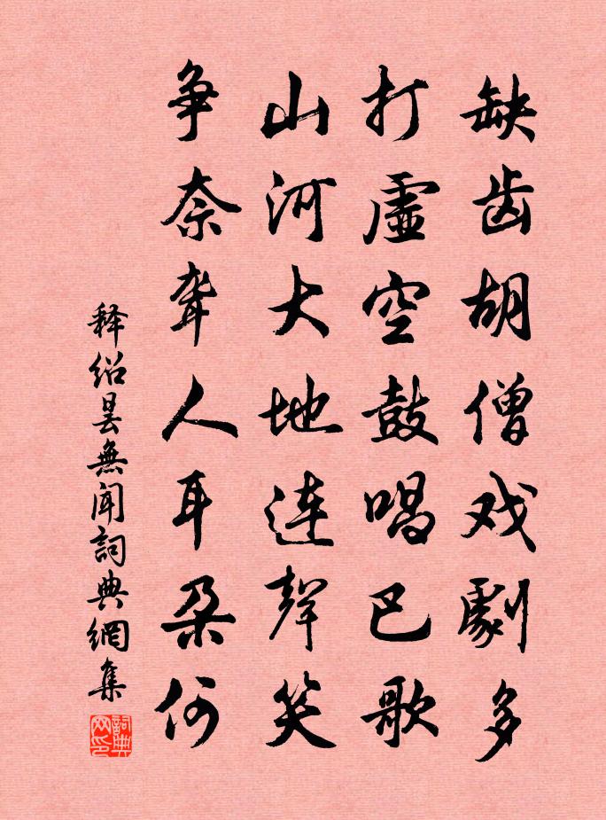 詩詞名句歷史字典書法欣賞書法字典國語詞典說文解字康熙字典古漢語字典標 題 作 者 詩 句 無聞作者:釋紹曇 朝代:宋代無聞原文缺齒胡僧戲劇多,打虛空鼓唱巴歌。山河大地連聲笑,爭奈聾人耳朶何。詩詞問答問:無聞的作者是誰?答:釋紹曇問:無聞寫於哪個朝代?答:宋代釋紹曇無聞書法欣賞無聞書法作品詩詞推薦別廬州郡人鄭綮〔唐代〕唯有兩行公廨淚,一時灑向渡頭風。浣溪沙晏幾道〔宋代〕床上銀屏幾點山。鴨爐香過瑣窗寒。小雲雙枕恨春閒。惜別漫成良夜醉,解愁時有翠箋還。那回分袂月初殘。廄馬夏竦〔宋代〕萬里無塵塞草秋,玉輪金軛未巡遊。上林苜蓿天池水,館食長鳴可自羞。蒙恩監南嶽廟劉克莊〔宋代〕久問嫖姚乞退閒,今朝準敕放生還。人欺解罷青油幕,帝遣監臨紫蓋山。營卒展辭回玉帳,林僧講賀到柴關。丈夫白石枕錢起〔唐代〕琢珉勝水碧,所貴素且貞。曾無白圭玷,不作浮磬鳴。捧來太陽前,一片新冰清。沈沈風憲地,待爾秋已至。璞堅閭門即事張繼〔唐代〕耕夫召募愛樓船,春草青青萬項田;試上吳門窺郡郭,清明幾處有新煙。秋霜閣徐良弼〔宋代〕秋霜閣下水潺潺,一片清泉漱玉寒。試把塵襟來此濯,要看披腹吐琅玕。戲用晁補之韻蘇軾〔宋代〕昔我嘗陪醉翁醉,今君但吟詩老詩。清詩咀嚼那得飽,瘦竹瀟灑令人飢。試問鳳凰飢食竹,何如駑馬肥苜蓿。知君上樂使君救康成公(一作陳陶續古詩)賈島〔唐代〕曾夢諸侯笑,康囚議脫枷。千根池裡藕,一朵火中花。送史申之峽州司空曙〔唐代〕峽口巴江外,無風浪亦翻。蒹葭新有雁,雲雨不離猿。行客思鄉遠,愁人賴酒昏。檀郎好聯句,共滯謝家門。不寐二首陳造〔宋代〕追思可樂是丁年,日力孳孳有食眠。頭觸屏風只燈後,慈親笑勸掩陳編。酬楊直閣知府吳芾〔宋代〕識破人間偽與真,自憐擾擾百年身。誰教來作剖符客,仍更去為分閫人。故里溪山空入夢,舊家亭館想生塵。願言臨洮客舍留別祁四岑參〔唐代〕無事向邊外,至今仍不歸。三年絕鄉信,六月未春衣。客舍洮水聒,孤城胡雁飛。心知別君後,開口笑應稀。和劉珵西湖十洲竹嶼舒坦〔宋代〕欲問葛陂安在哉,端疑波底化龍來。子猷此興君知否,小徑何妨卷竹開。沉黎四首李石〔宋代〕蜀相披荒壘,唐人拓密林。四川襟帶重,六詔霧雲深。鹽米成民業,珠犀作吏箴。官閒無一事,閉合念親心。會覽亭三首張嵲〔宋代〕縹緲飛亭都郡樓,平崗絕岸對滄洲。天邊遠岫寒無色,城下澄江湛不流。林影終朝垂澹{左氵右頹}。水禽隨暖弄酹江月/念奴嬌陳允平〔宋代〕霽空虹雨,傍啼螿莎草,宿鷺汀洲。隔岸人家砧杵急,微寒先到簾鉤。步幄塵高,征衫酒潤,誰暖玉香篝。風燈微寶嚴寺王伯廣〔宋代〕平湖鏡淨中,背貼青峰巒。去郭二十里,金碧輝波瀾。是曰寶華境,萬象郁以盤。壯哉窣堵坡,一瞰天地寬。誰懷答故人白居易〔唐代〕故人對酒嘆,嘆我在天涯。見我昔榮遇,念我今磋跎。問我為司馬,官意復如何?答雲且勿嘆,聽我為君歌。我本游虎丘林拱中〔宋代〕 * 岩前秋已闌,黑雲疏雨洗林巒。鐵花煙落石泉冷,羽井苔深霜月寒。隱浦疾帆風去飽,疏寮森木曉催丹。清齋名句推薦廬山煙雨浙江潮,未至千般恨不消。蘇軾《廬山煙雨浙江潮》 勞歌一曲解行舟,紅葉青山水急流。許渾《謝亭送別》 一雙舞燕,萬點飛花,滿地斜陽。陳子龍《訴衷情·春遊》 唯有相思似春色,江南江北送君歸。王維《送沈子歸江東 / 送沈子福之江東》 小姑織白紵,未解將人語。李白《湖邊採蓮婦》 有兼聽之明,而無矜奮之容;有兼覆之厚,而無伐德之色。荀子《荀子·正名》 亂點鴛鴦譜馮夢龍《醒世恆言·卷八》 克城以武,戡亂以仁。張廷玉《明史·本紀·卷一》 機中錦字論長恨,樓上花枝笑獨眠。皇甫冉《春思》 情往似贈,興來如答。劉勰《文心雕龍·物色》