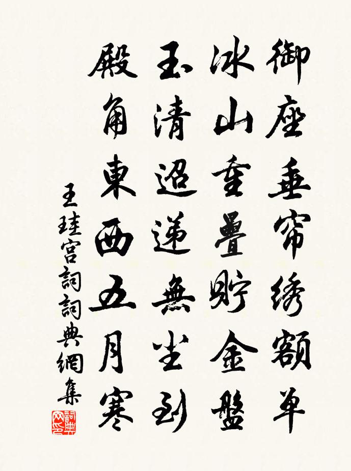 詩詞名句歷史字典書法欣賞書法字典國語詞典說文解字康熙字典古漢語字典標 題 作 者 詩 句 宮詞作者:王珪 朝代:唐代宮詞原文御座垂簾繡額單,冰山重疊貯金盤。玉清迢遞無塵到,殿角東西五月寒。詩詞問答問:宮詞的作者是誰?答:王珪問:宮詞寫於哪個朝代?答:唐代王珪宮詞書法欣賞宮詞書法作品詩詞推薦沙鷗齊己〔唐代〕暖傍漁船睡不驚,可憐孤潔似華亭。晚來灣浦沖平碧,晴過汀洲拂淺青。翡翠靜中修羽翼,鴛鴦閒處事儀形。何如臨江仙(西湖)孫居敬〔宋代〕觸事老來情緒懶,西湖債未曾還。試呼小艇訪孤山。昔年鷗鶴侶,總笑鬢斕斑。仙去坡翁山耐久,煙霏空翠憑闌。偶失一丹瓢戲書李流謙〔宋代〕誰取一瓢去,虛勞九轉功。徵杯驚羽化,開畫嘆幮空。已墮寧論甑,雖亡未失弓。人間閒得喪,盡付綠樽中。六月望日月堂老禪示仆眾偈隨喜愧甚唐士恥〔宋代〕江月主人清冰壺,以月名堂月不如。門前船泊五湖客,兩眼歷照心與俱。我來追涼暑雲徂,牛腰大軸開我愚。萬口峽水袁燮〔宋代〕峽石險而怪,峽水清且湍。伊誰剪蒙密,發此奇偉觀。兩龍會為一,激烈不可士。蜿蜒潄鳴玉,千古甘以寒。誰雲金剛隨機無盡頌一體同觀分第十八釋印肅〔宋代〕眾生種性深,安可類圓心。妄迷塵數業,三界自漂沉。水調歌頭(寄王信父)張炎〔宋代〕白髮已如此,歲序更駸駸。化機訊息,莊生天籟雍門琴。頗笑論文說劍,休問高車駟馬,袞袞□黃金。蟻在元無夢春日吟釋文珦〔宋代〕春山青,春水綠,野鳥啼春聲續續。提壺勸我飲,杜鵑勸我歸。吾歸不待勸,吾貧無酒資。之二蟲,不吾知,徒爾宮詞長孫翱〔唐代〕一道甘泉接御溝,上皇行處不曾秋。誰言水是無情物,也到宮前咽不流。和尚善韻李洪〔宋代〕出郭尋幽興自長,叢林梅子未全黃。問禪欲契風幡話,宴坐聊參知見香。觸念未通成擊橛,安心無法是還鄉。卻憐和趙用明梅胡寅〔宋代〕淨幾寒花日,悠然萬慮忘。詩筒忽到手,花信已催妝。茅舍斜斜彴,冰溪短短牆。仙膚下姑射,嬌額映昭陽。崔竹水簾羅鄴〔唐代〕萬點飛泉下白雲,似簾懸處望疑真。若將此水為霖雨,更勝長垂隔路塵。紅鈴月頭額賈似道〔宋代〕蟲名月額及紅鈴,來往交鋒暫或贏。縱然得勝終難久,贏得錢來不可行。覓句張鎡〔宋代〕覓句先須莫苦心,從來瓦注勝如金。見成若不拈來使,箭已離弦作麽尋。感秋三絕張耒〔宋代〕秋思鄉愁兩苦辛,每臨西北望秋雲。此生更老情終在,誰為寄聲千里人。送南康姚明府賈島〔唐代〕銅章美少年,小邑在南天。版籍多遷客,封疆接洞田。靜江鳴野鼓,發纜帶村煙。卻笑陶元亮,何須憶醉眠。頌古五十五首釋紹曇〔宋代〕村落誰家醜女兒,家將苕菷畫蛾眉。蓬人掩鼻嫌腥穢,鴉臭當風自不知。五老師子釋重顯〔宋代〕踞地盤空勢未休,爪牙何必競時流。天教生在千峰上,不得雲擎也出頭。鷓鴣天晏幾道〔宋代〕醉拍春衫惜舊香天將離恨惱疏狂年年陌上生秋草日日樓中到夕陽雲渺渺,水茫茫征人歸路許多長相思本是無憑語莫念奴嬌袁去華〔宋代〕竹陰窗戶薦微涼,積雨郊墟新霽。萬里飛雲都過盡,天闕星河如洗。檐隙風來,流螢飄墮,苒苒還飛起。魂清骨冷名句推薦細雨夢回雞塞遠,小樓吹徹玉笙寒。李璟《攤破浣溪沙·菡萏香銷翠葉殘》 人生不相見,動如參與商。杜甫《贈衛八處士》 都道是金玉良姻,俺只念木石前盟。曹雪芹《終身誤》 謙謙君子,卑以自牧佚名《易傳·象傳上·謙》 酒闌更喜團茶苦,夢斷偏宜瑞腦香。李清照《鷓鴣天·寒日蕭蕭上瑣窗》 冷艷全欺雪,余香乍入衣。丘為《左掖梨花》 冰合井泉月入閨,金缸青凝照悲啼。李白《夜坐吟》 枯木逢春猶再發,人無兩度再少年。佚名《增廣賢文·上集》 一場愁夢酒醒時,斜陽卻照深深院。晏殊《踏莎行·小徑紅稀》 遇沉沉不語之士,且莫輸心;見悻悻自好之人,應須防口。洪應明《菜根譚·概論》
