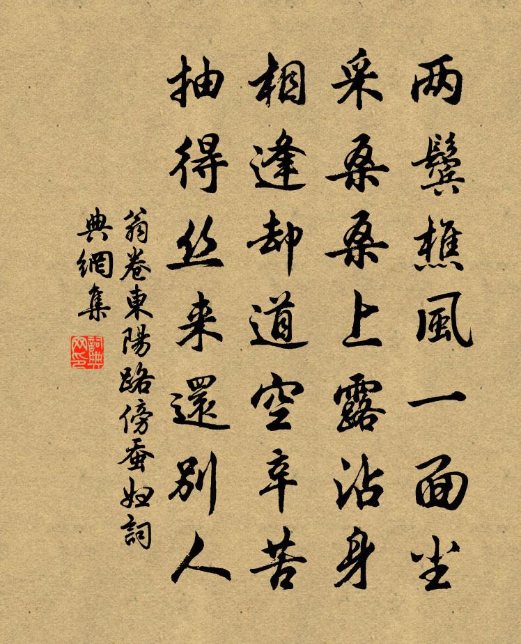 詩詞名句歷史字典書法欣賞書法字典國語詞典說文解字康熙字典古漢語字典標 題 作 者 詩 句 東陽路傍蠶婦作者:翁卷 朝代:宋代東陽路傍蠶婦原文兩鬢樵風一面塵,採桑桑上露沾身。相逢卻道空辛苦,抽得絲來還別人。詩詞問答問:東陽路傍蠶婦的作者是誰?答:翁卷問:東陽路傍蠶婦寫於哪個朝代?答:宋代翁卷東陽路傍蠶婦書法欣賞東陽路傍蠶婦書法作品詩詞推薦平園創三層樓子直秘書遠貺新詩有山中宰之句周必大〔宋代〕弘景掛冠永明年,築樓三層家政傳。俯聽松風輒欣然,時人望之疑是仙。天教輕捷遊方外,自喜向來不為宰。耄期寄友朱浚〔宋代〕溪月知相憶,江雲約共吟。夜船書一紙,飛過赤楓林。招義銘育王見佛照劉過〔宋代〕豪傑書生懶散仙,小庵藏跡得安間。禪曾勘破諸公去,詩在推敲一字間。夜雨滴殘梧葉老,夕陽行處水花慳。買舟有邀余游中原者余以親老辭王子賢未知來餞別黎廷瑞〔宋代〕有客六轡濡且均,要我共看中都春。孔林喬木故無恙,首陽高風應未泯。亦知江山不負我,政恐風塵能涴人。故友西湖竹枝詞盧浩〔元代〕記郎別時風颼颼,銀鼠帽子黃鼠袍。別來轍跡不可見,湖邊青草如人高。示諸弟陳舜俞〔宋代〕吾家崛起蓬蒿間,先君為學良苦艱。典衣買書教我讀,平生貧窶不此慳。歲晚才沾寸祿養,天禍無何頹泰山。況時頌四賓主釋印肅〔宋代〕何處更容絲髮許,脫體無依誰會舉。玄玄玄了說玄玄,究竟談玄猶寐語。吟詩自笑用前韻陳造〔宋代〕退歸我欲學真長,君定才名江夏黃。考父舊嘗睎吉甫,陵陽端的嗣黔陽。八聲甘州(壽建康帥胡長文給事。時方閱拆紅梅之舞,且有錫帶之寵)辛棄疾〔宋代〕把江山好處付公來,金陵帝王州。想今年燕子,依然認得,王謝風流。只用平時尊俎,彈壓萬貔貅。依舊鈞天夢,送李五王昌齡〔唐代〕玉碗金罍傾送君,江西日落起黃雲。扁舟乘月暫來去,誰道滄浪吳楚分?題漠口鋪韓玉父〔宋代〕南行逾萬山,復入武陽路。黎明與雞興,理髮漠口鋪。旴江在何所,極目煙水暮。生平良自珍,羞為浪子婦。題江參山水橫軸畫俞秀才所藏二首陳與義〔宋代〕卷中袞袞溪山去,筆下明明開闢初。不肯一褌為婦計,俞郎作意未全疏。頌古二十五首釋崇岳〔宋代〕大梅梅子熟,龐老已先知。正眼驗深要,相逢拍手歸。贈別王鍊師往羅浮施肩吾〔唐代〕道俗駢闐留不住,羅浮山上有心期。卻愁仙處人難到,別後音書寄與誰。和晁應之山中張耒〔宋代〕康樂雖為吏,不忘山水情。我無連璧美,君許托車行。幽鳥花前語,春泉竹外鳴。勒移無草草,吾友笑功名。首夏二首方回〔宋代〕曬繭未繰絲,晴天麥最宜。樹陰常獨立,禽語不吾疑。苦筍烹勝肉,新茶嗅醒脾。薰風吹此句,突過一春詩。春詞方岳〔宋代〕翠鼎香深旋作花,餘酲牽夢幾還家。夢中記得春池綠,曾共丁寧下番花。下赤山嶺過渡至石子澗別施八評事梅堯臣〔宋代〕三年守廬次,雨回來澗邊。臨塘愛魚樂,近竹見人賢。今我西歸日,逢君小隱年。重將車馬去,驚起野鷗眠。七里灘張伯玉〔宋代〕漱玉鳴珠七里灘,到今猶照客星寒。盧奴有水徒千頃。未得高賢一瞬看。初秋行圃四首楊萬里〔宋代〕花梢飛下兩鳴鳩,欲住還行行復留。拾得來禽吞不得,啄來啄去竟成休。名句推薦滿園花菊鬱金黃,中有孤叢色似霜。白居易《重陽席上賦白菊》 但知江湖者,都是薄命人。佚名《增廣賢文·下集》 父不慈則子不孝顏之推《顏氏家訓·治家篇》 誰家玉笛暗飛聲,散入春風滿洛城。李白《春夜洛城聞笛 / 春夜洛陽城聞笛》 問相思、他日鏡中看,蕭蕭發。嚴羽《滿江紅·送廖叔仁赴闕》 遊絲冉冉花枝靜,青壁迢迢白鳥過。王守仁《春晴》 自春來、慘綠愁紅,芳心是事可可。柳永《定風波·自春來》 微雨靄芳原,春鳩鳴何處。韋應物《東郊》 誰知萬里客,懷古正躊躕。陳子昂《峴山懷古》 志於道,據於德,依於仁,游於藝。孔子弟子《論語·述而篇》