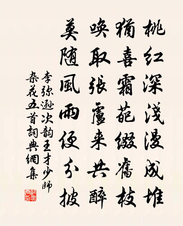 詩詞名句歷史字典書法欣賞書法字典國語詞典說文解字康熙字典古漢語字典標 題 作 者 詩 句 次韻王才少師雜花五首作者:李彌遜 朝代:宋代次韻王才少師雜花五首原文桃紅深淺漫成堆,猶喜霜葩綴舊枝。喚取張盧來共醉,莫隨風雨便分披。詩詞問答問:次韻王才少師雜花五首的作者是誰?答:李彌遜問:次韻王才少師雜花五首寫於哪個朝代?答:宋代李彌遜次韻王才少師雜花五首書法欣賞次韻王才少師雜花五首書法作品詩詞推薦烏夜啼(夜坐)張鎡〔宋代〕月兒猶未全明。乞憐生。幾片彩雲來去、更風輕。應見我。行又坐。苦凝情。捲起簾兒不睡、到三更。水調歌頭(戊午九月,偕同官延慶閣過碧沚)吳潛〔宋代〕重九先三日,領客上危樓。滿城風雨都住,天亦相邀頭。右手持杯滿泛,左手持螯大嚼,萸菊互相酬。徒倚闌乾角蝶戀花(丁丑七夕)劉鎮〔宋代〕誰送涼蟾消夜暑。河漢迢迢,牛女何曾渡。乞得巧來無用處。世間枉費閒針縷。人在江南煙水路。頭白鴛鴦,不道煙雨樓吳育〔宋代〕一上危樓七澤分,勝游平日此怡神。荊台蕪沒千年地,楚望雲披四面春。城南縣尉水亭得長字蘇軾〔宋代〕兩尉郁相望,東西百步場。插旗蒲柳市,伐鼓水雲鄉。已作觀魚檻,仍開射鴨堂。瀲瀲波頭細,疏疏雨腳長。全家虞美人辛棄疾〔宋代〕夜深困倚屏風后。試請毛延壽。寶釵小立白翻香。旋唱新詞猶誤、笑持觴。四更山月寒侵席。歌舞催時日。問他何王簡卿侍郎以詩贈王孟同王成叟之侄也輒亦繼葉適〔宋代〕季父昔從我,寒燈聽微更。強扶瘖聾和,誤策蹇跋行。坐令兩銷落,無復一崢嶸。宜汝逝不留,出門訪鹹英。大溪戊戌入都別友人譚嗣同〔清代〕家國兩愁絕,人天一粲然。只余心獨在,看汝更千年。世界幾痕夢,微塵萬座蓮。後來憑弔意,分付此山川。懷酒李新〔宋代〕清聖滌濁賢莫區滌分,一入愁腸功等倫。石爐三日不舉火,麴車過門齒生津。松滌草玄亦已勤,好事勿謂秦無人。次宋省齋菊花五絕楊公遠〔宋代〕凡卉徒妖迥不同,輸渠籬下自叢叢。趨時示肯隱君子,比竟依然帶晉風。拜無垢先生祠劉黻〔宋代〕中興遺此老,夢寐亦中原。泣血兩朝事,披肝一萬言。名方登禁掖,身已謫南源。苦學無寒暑,雙趺片石存。送李員外院長分司東都韓愈〔唐代〕去年秋露下,羈旅逐東征。今歲春光動,驅馳別上京。飲中相顧色,送後獨歸情。兩地無千里,因風數寄聲。送唐介南遷五首謝景初〔宋代〕諫逐古今有,例為朝政疵。況與廊廟臣,世復惡其私。安危治亂跡,此事姑置之。儻未監謗者,失得何須悲。重寄金山寺僧方乾〔唐代〕風濤匝山寺,磬韻達漁船。此處別師久,遠懷無信傳。月華妨靜燭,鳥語答幽禪。已見如如理,灰心應不然。夫人閣四首蘇軾〔宋代〕節物荊吳舊,嬉遊禁掖閒。仙風隨畫箑,拜賜落人間。送法寶禪師陳師道〔宋代〕平生夫鐵腳,道價喧宇宙。望禮東南雲,吾今獨何後。晚始識其子,瑤林一枝秀。初聞飲光笑,復作空生瘦。今年湖州歌九十八首 其五十七汪元量〔宋代〕新濟州來舊濟州,柳門西畔兩三鷗。酒邊笑謔消長日,弄竹彈絲盡勝流。句釋曉瑩〔宋代〕而今總入老夫詩。石漕生辰馮時行〔宋代〕夢斷熊羆夜,祥呈饋鯉初。固應賢有後,誰謂慶無餘。為國家相似,憂民子不如。符分四郡虎,金佩十年魚。未補錢塘海潮賀鑄〔宋代〕高岸如陵累石頑,一支漲海橫中間。九軍雷鼓震玉壘,萬里墨雲驅雪山。奏政維舟羞膽怯,史遷舐筆恨才慳。錢郎名句推薦只知逐勝忽忘寒,小立春風夕照間。楊萬里《最愛東山晴後雪》 此日六軍同駐馬,當時七夕笑牽牛。李商隱《馬嵬·其二》 昔聞洞庭水,今上岳陽樓杜甫《登岳陽樓》 海燕歲微渺,乘春亦暫來。張九齡《歸燕詩》 惟有樓前流水,應念我、終日凝眸。李清照《鳳凰台上憶 * ·香冷金猊》 治國有常,而利民為本;政教有經,而令行為上。劉安及其門客《淮南子·汜論訓》 賊是小人,智過君子。佚名《增廣賢文·上集》 嶺樹重遮千里目,江流曲似九迴腸。柳宗元《登柳州城樓寄漳汀封連四州》 山不在高,有仙則名水不在深,有龍則靈劉禹錫《陋室銘》 起來搔首,梅影橫窗瘦。汪藻《點絳唇·新月娟娟》