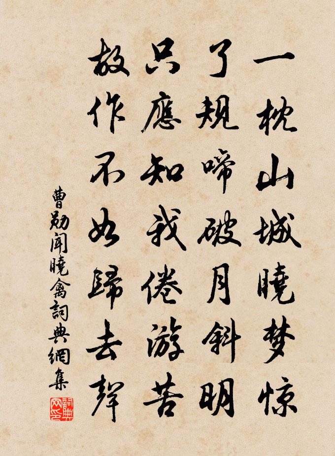 詩詞名句歷史字典書法欣賞書法字典國語詞典說文解字康熙字典古漢語字典標 題 作 者 詩 句 聞曉禽作者:曹勛 朝代:宋代聞曉禽原文一枕山城曉夢驚,了規啼破月斜明。只應知我倦遊苦,故作不如歸去聲。詩詞問答問:聞曉禽的作者是誰?答:曹勛問:聞曉禽寫於哪個朝代?答:宋代曹勛聞曉禽書法欣賞聞曉禽書法作品詩詞推薦次韻黃文叔正言送日鑄茶樓鑰〔宋代〕古人養老食而酳,後人既飽須啜茗。唐稱陽羨顧渚茶,惠建之名猶未省。小團花{左革右夸}矞雲龍,競巧爭妍動僑寄山居霍然幾月凡見之於目聞之於耳者輒綴王志道〔宋代〕樵得田頭二麥歸,做成餅餌飽妻兒。農家喜有耘田本,接到秈禾稻熟時。錢殿撰輓詞樓鑰〔宋代〕雋譽蜚庠校,孤忠動冕旒。捄荒心欲折,憂國鬢先秋。惠滿長江水,風清八詠樓。禁途交一臂,人物等閒休。北園雜詠陸游〔宋代〕暮年身似一虛舟,付與滄波自在流。垂地雪雲吹不散,且傾桑落膾槎頭。過宋州李端〔唐代〕睢陽陷虜日,外絕救兵來。世亂忠臣死,時清明主哀。荒郊春草遍,故壘野花開。欲為將軍哭,東流水不回。和曾吉甫九日吳芾〔宋代〕龍山陳跡已成灰,尚憶當年戲馬台。我幸偶陪 * 醉,君應亦向白衣來。風高日朗三秋霽,野曠天清萬象開。好對感時仲並〔宋代〕忽傳群盜下淮瀕,又逐黃州韓使君。卻望長安在天上,愁看天際有孤雲。有鳥二十章(庚寅)元稹〔唐代〕有鳥有鳥名老鴟,鴟張貪很老不衰。似鷹指爪唯攫肉,戾天羽翮徒翰飛。朝偷暮竊恣昏飽,後顧前瞻高樹枝。珠丸述古以詩見責屢不赴會複次前韻蘇軾〔宋代〕我生孤癖本無鄰,老病年來益自珍。肯對紅裙辭白酒,但愁新進笑陳人。北山怨鶴休驚夜,南畝巾車欲及春。多謝和林和靖先生梅韻胡銓〔宋代〕一年佳處早梅時,鉤引清風巧釣詩。未分霜冷禁瘦朵,漸看春入奈愁枝。晚尤奇特憐無伴,夜更分明不可私。冷落和元亨出示山扉詩姜特立〔宋代〕手自葺柴荊,山扉亦自扃。莫辭蓬篳陋,要護草堂靈。忙為幽人啟,閒無俗士經。不妨老赤腳,應戶代奴星。立秋前四日夜泛舟至跨湖橋陸游〔宋代〕短楫追涼十里來,夜深卻御便風回。離離蒲葉先秋老,嫋嫋苹花帶露開。陌上歌呼簪稻穗,橋邊燈火賣官醅。時平達磨在師贊釋慧開〔宋代〕賊布告水露罪全彰,攬得西乾沸似湯。頂上鐵枷無計脫,卻來東土強攤贓。高峰庵呂希純〔宋代〕予嘗登高峰,近瞰碧溪塢。老松如臥龍,夾道忽騰翥。危梯過百折,直下看雲雨。善導有遺蹤,十佛從口吐。歲久詠南嶽徑松狄煥〔唐代〕一陣雨聲歸岳嶠,兩條寒色下瀟湘。客吟晚景停孤棹,僧踏清陰徹上方。送李大夫渡口阻風戴叔倫〔唐代〕浪息定何時,龍門到恐遲。輕舟不敢渡,空立望旌旗。仲和親迎慈谿葛紹體〔宋代〕萬卷何如一寸心,心涵萬卷自知音。聖功不是尋常事,泰華高寒滄海深。海棠繆鑒〔宋代〕滴滴妖嬈睡未醒,碎花猶帶馬嵬塵。少年正抱憂時恨,更有因花比太真。和趙相公登鸛雀樓(樓在河中府,前瞻中條,下瞰大河)殷堯藩〔唐代〕危樓高架泬寥天,上相閒登立彩旃。樹色到京三百里,河流歸漢幾千年。晴峰聳日當周道,秋谷垂花滿舜田。雲路滿江紅(海棠下歌后村調共和)劉辰翁〔宋代〕淡淡胭脂,似褪向、景陽鴛石。依然是、春睡未足,捧心猶癖。藉甚不禁君再顧,嫣然卻記渠初拆。黯銷魂、欲盡名句推薦冷冷水向橋東去。漠漠雲歸溪上住。劉鎮《玉樓春·東山探梅》 記得年時臨上馬,看人眼淚汪汪。劉彤《臨江仙·千里長安名利客》 西風潑眼山如畫,有黃花休恨無錢。張可久《風入松·九日》 憐夜冷孀娥,相伴孤照。吳文英《花犯·謝黃復庵除夜寄古梅枝》 我是人間惆悵客,知君何事淚縱橫,斷腸聲里憶平生。納蘭性德《浣溪沙·殘雪凝輝冷畫屏》 十年驅馳海色寒,孤臣於此望宸鑾。戚繼光《望闕台》 夜來幽夢忽還鄉,小軒窗,正梳妝。相顧無言,惟有淚千行。蘇軾《江城子·乙卯正月二十日夜記夢》 細雨濕衣看不見,閒花落地聽無聲。劉長卿《別嚴士元》 雲雨朝還暮,煙花春復秋。李珣《巫山一段雲·古廟依青嶂》 只恐夜深花睡去,故燒高燭照紅妝。蘇軾《海棠》