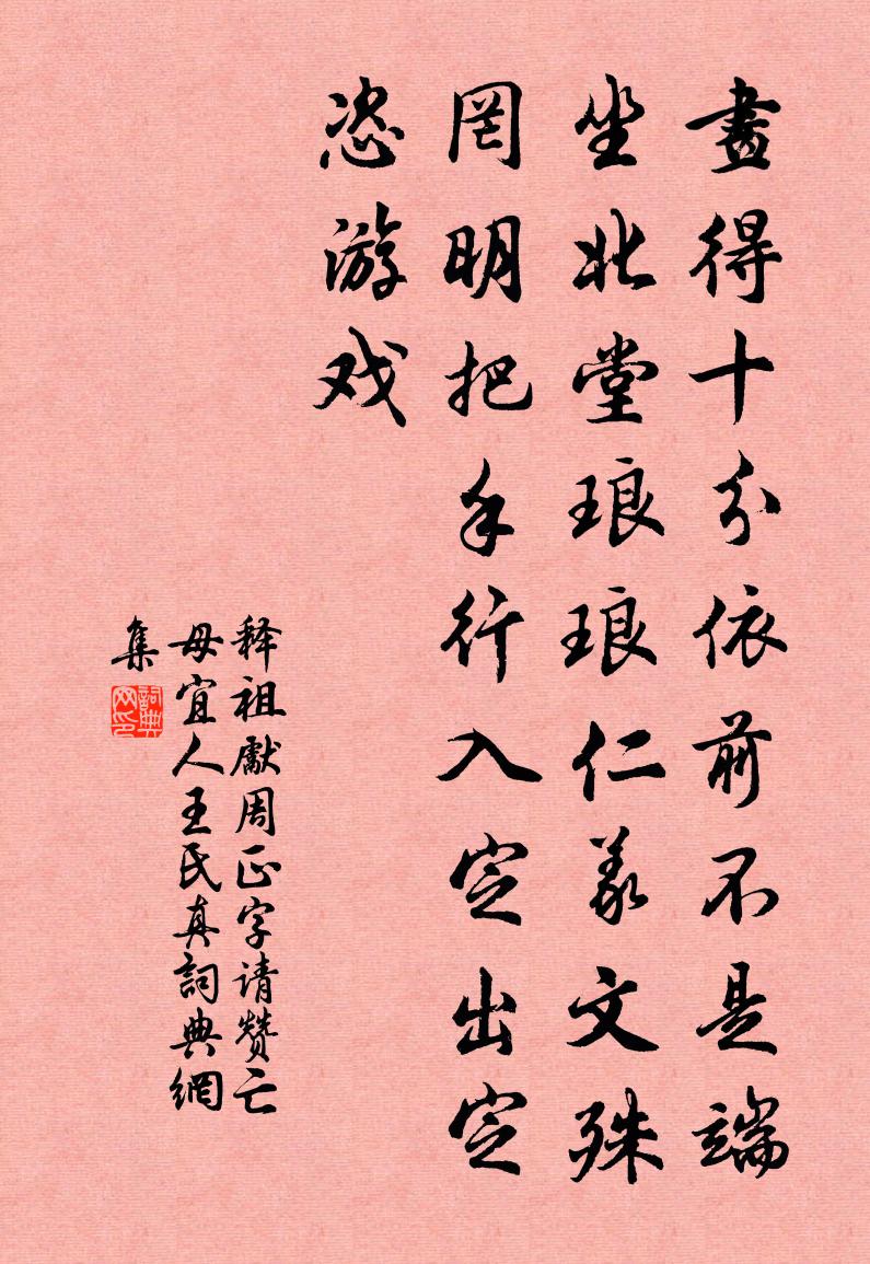 詩詞名句歷史字典書法欣賞書法字典國語詞典說文解字康熙字典古漢語字典標 題 作 者 詩 句 周正字請贊亡母宜人王氏真作者:釋祖先 朝代:宋代周正字請贊亡母宜人王氏真原文畫得十分,依前不是。端坐北堂,琅琅仁義。文殊罔明把手行,入定出定恣遊戲。詩詞問答問:周正字請贊亡母宜人王氏真的作者是誰?答:釋祖先問:周正字請贊亡母宜人王氏真寫於哪個朝代?答:宋代釋祖先周正字請贊亡母宜人王氏真書法欣賞周正字請贊亡母宜人王氏真書法作品詩詞推薦訪梅殊未有開意趙蕃〔宋代〕不憚朝寒起杖藜,問梅隨往到山蹊。枯根半死苔痕剝,細蕾深藏藤刺迷。倚市懸知無正態,入空還恐見深擠。幽居贈劉師服韓愈〔唐代〕羨君齒牙牢且潔,大肉硬餅如刀截。我今呀豁落者多,所存十餘皆兀臲。匙抄爛飯穩送之,合口軟嚼如牛呞。妻兒山下留別佛光和尚白居易〔唐代〕勞師送我下山行,此別何人識此情。我已七旬師九十,當知後會在他生。送曹叔時歸淮東陳深〔宋代〕閏農去我遠,醇風日以澆。遺經秘幽旨,千載空寥寥。溓洛導其源,百川始東朝。我生性顬蒙,望道彌堅高。鍼砭送元勛不伐侍親之官泉南八首李廌〔宋代〕泉南南蒲是南溟,瘴霧熏人不用醒。想對文書搔首罷,刺桐花下學蘭亭。謝司路鈐遺菊花塔喻良能〔宋代〕夫君遺我菊浮屠,分得清香供讀書。突兀便高三數尺,層層畫影綠扶疏。和陶和胡西曹示顧賊曹蘇軾〔宋代〕長春如稚女,飄颻倚輕颸。卯酒暈玉頰,紅綃卷生衣。低顏香自斂,含睇意頗微。寧當娣 * ,未肯姒戎葵。誰言送蘇修撰赴闕四首張載〔宋代〕秦弊於今未息肩,高蕭從此法相沿。生無定業田疆壞,赤子存亡任自然。中秋待月陸龜蒙〔唐代〕轉缺霜輪上轉遲,好風偏似送佳期。簾斜樹隔情無限,燭暗香殘坐不辭。最愛笙調聞北里,漸看星澹失南箕。何人曬舊衣周壽昌〔清代〕卅載綈袍檢尚存,領襟雖破卻餘溫。重縫不忍輕移拆,上有慈親舊線痕。和陶九日閒居蘇軾〔宋代〕九日獨何日,欣然愜平生。四時靡不佳,樂此古所名。龍山憶孟子,栗里懷淵明。鮮鮮霜菊艷,溜溜糟床聲。閒居木蘭花慢盧祖皋〔宋代〕翠陰春晝永,乍簾幕、暖飄香。正玉節來歸,斑衣戲舞,□□熒煌。椿期始開九秩,看芝蘭、奕葉早傳芳。都把一浪淘沙(觀潮作)曾覿〔宋代〕一線海門來。雪噴雲開。崑山移玉下瑤台。捲地西風吹不斷,直到蓬萊。羯鼓譟春雷。鼉舞蛟回。歌樓鼓吹夕陽催西湖雜詩黃任〔清代〕魚羹宋嫂六橋無,原是樊樓舊酒壚。宣索可憐停玉食,官家和淚話東都。點絳唇廖行之〔宋代〕玳席華筵,嘉賓環集三千履。蘭膏芬芷。一簇紅蓮里。花覆玉郎,苒苒青衫媺。鹹傾企。小登科第。有底新桃李。病目作近體詩五首晁說之〔宋代〕病目經旬作夢中,只應天意欲教慵。詩成願作瞎太祝,位極恥為盲老公。不用千憂徒畫足,何妨一笑謾書空。頗不天童道上二首袁燮〔宋代〕太白峰前三十里,古松夾道奏竽笙。清輝秀色交相映,未羨山 * 上行。賦園中所有十首蘇轍〔宋代〕萱草朝始開,呀然黃鵠觜。仰吸日出光,口中爛如綺。纖纖吐須鬣,冉冉隨風哆。朝陽未上軒,粲粲幽閒女。美女驀山溪 贈文登縣駱守清王哲〔元代〕守清花守淨。各花各開明花。兩兩做修持,你個個、心頭修省。虛虛實實,里花取炎涼,尋自在,覓逍遙,漸漸歸金市大水一首王阮〔宋代〕日氣方穿戶,風潮忽及門。郊原雨腳密,窗牖浪花翻。船系家家屋,帆飛處處村。江南一羈客,微命托乾坤。名句推薦兩株桃杏映籬斜,妝點商州副使家。王禹偁《春居雜興·兩株桃杏映籬斜》 所謂伊人,在水一方。佚名《蒹葭》 蓄疑敗謀,怠忽荒政佚名《尚書·周書·周官》 解鞍欹枕綠楊橋,杜宇一聲春曉。蘇軾《西江月·頃在黃州》 楓葉千枝復萬枝,江橋掩映暮帆遲。魚玄機《江陵愁望寄子安》 武帝宮中人去盡,年年春色為誰來。岑參《登古鄴城》 親卿愛卿,是以卿卿;我不卿卿,誰當卿卿?劉義慶《世說新語·惑溺》 卻下水晶簾,玲瓏望秋月。李白《玉階怨》 當時父母念,今日爾應知。白居易《燕詩示劉叟》 行舟逗遠樹,度鳥息危檣。陰鏗《渡青草湖》