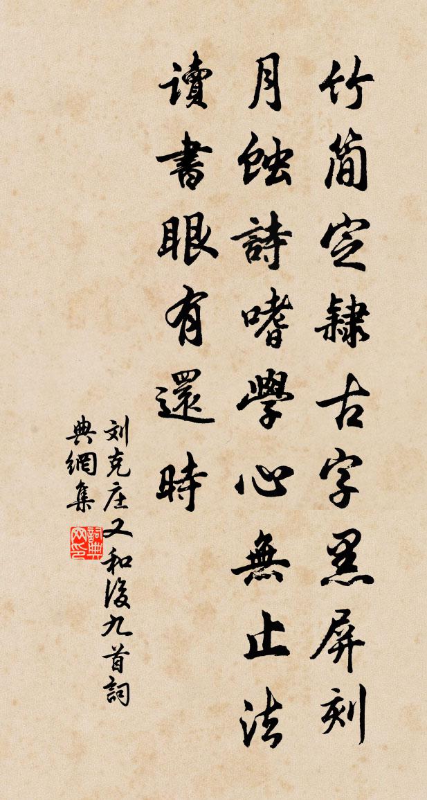 詩詞名句歷史字典書法欣賞書法字典國語詞典說文解字康熙字典古漢語字典標 題 作 者 詩 句 又和後九首作者:劉克莊 朝代:宋代又和後九首原文竹簡定隸古字,黑屏刻月蝕詩。嗜學心無止法,讀書眼有還時。詩詞問答問:又和後九首的作者是誰?答:劉克莊問:又和後九首寫於哪個朝代?答:宋代問:劉克莊的名句有哪些?答:劉克莊名句大全劉克莊又和後九首書法欣賞又和後九首書法作品詩詞推薦蔡君俊五世家慶圖詩楊維楨〔元代〕蔡家肉譜繇司徒,西蜀蔓衍雲間居。胡笳一洗怨女孤,世世解讀中郎書。傳家五葉忠孝俱,郁蔥佳氣無時無。有母華乾攜茶入園晚坐柔桑下朱翌〔宋代〕光穿兩腳間彤霞,聲急城頭集暮鴉。且與鳳雛桑下坐,共烹龍焙雨前茶。的中薏嫩蓮新采,筍上竿成竹已斜。讀得賀陳基載重陽日文同〔宋代〕文酒尋常不厭求,坐中須得買長頭。幸逢九日稱佳節,宜對三嵎賞素秋。歲月但看隨葉落,利名當信與雲浮。憑君再次韻白誑簡賓王二首陳造〔宋代〕魚避清澄鳥愛昏,陶翁歸計酒盈樽。山田雨足鳩呼婦,籬院春深竹有孫。百首旋編新賦詠,三生猶憶舊精魂。小摩句夏竦〔宋代〕雪度維楊臘,花逢北國春。壬戌立冬十朋十一日陪路文周朋攜提祖同訪後王洋〔宋代〕倦緣閒景散閒情,人未歸庵戶不扃。試撥柴煙尋宿火,旋添泉水洗茶瓶。黃花采采盈衣袖,橡實離離傍生萍。何日湖胡仲弓〔宋代〕獨坐過湖船,涼生欲暮天。鷗眠汀草亂,魚躍浪花圓。足跡煙霞外,今聲風月邊。萬緣無所欠,只欠買山錢。貴妃閣春帖子許應龍〔宋代〕翠管銀罌舊事傳,新春賸喜在新年。巧裁彩勝迎佳節,更禍君王壽萬千。飲於梅山弟家醉書八首陳著〔宋代〕人閒杯酒易暌乖,只為閨門意弗諧。每到梅山醉終日,不聞人語自安排。浪淘沙惠洪〔宋代〕城裡久偷閒。塵浣雲衫。此身已是再眠蠶。隔岸有山歸去好,萬壑千岩。霜曉更憑闌。減盡晴嵐。微雲生處是茅庵步出夏門行 艷曹操〔魏晉〕雲行雨步,超越九江之皋。臨觀異同,心意懷豫,不知當復何從?經過至我碣石,心惆悵我東海。惜雙雙(中呂宮)張先〔宋代〕城上層樓天邊路。殘照里、平蕪綠樹。傷遠更惜春暮。有人還在高高處。斷夢歸雲經日去。無計使、哀弦寄語。相送金松槜歸永嘉鄭會〔宋代〕可惜西風早,無因得放遲。吹將客歸去,空有夢相隨。舊舍松根在,新坊酒價低。倘行天竺路,須為記留題。韓蘄王夫人楊維楨〔元代〕巫家卜偶不為嫌,優女占夫事更堅。 看取異時真畏友,九重書上議黃天。 頌古二十五首釋崇岳〔宋代〕臘月燒山,天寬地寬。築著磕著,徹骨毛寒。頌古四十八首釋慧開〔宋代〕識得最初句,便會末後句。末後下最初,不是者一句。蘇幕遮 點化道友王哲〔元代〕個人人,常守鋪。瓮里合頭,鐵索纏縛住。怎識從來光耀處。元是神仙,何不開心悟。覓清涼,搜穩步。若要飄蓬代人上建守四首李呂〔宋代〕潛藩雄鎮七閩頭,親睹賢侯利澤周。不借寇恂留潁尾,卻教郭伋再并州。失鶴二首薛能〔唐代〕偶背雕籠與我違,四方端佇竟忘歸。誰家白日雲間見,何處滄洲雨里飛。曾啄稻粱殘粒在,舊翹泥潦半蹤稀。憑人郫縣春日吟吳泳〔宋代〕雨腳垂垂未肯休,舍東流滿舍西流。八分春種胚胎了,新水才來便徹頭。名句推薦十二闌乾,故國三千里。王庭筠《鳳棲梧·衰柳疏疏苔滿地》 年年陌上生秋草,日日樓中到夕陽。晏幾道《鷓鴣天·醉拍春衫惜舊香》 目妄視則淫,耳妄聽則惑,口妄言則亂。劉安及其門客《淮南子·主術訓》 美人自刎烏江岸,戰火曾燒赤壁山,將軍空老玉門關。張可久《賣花聲·懷古》 騷人可煞無情思,何事當年不見收。李清照《鷓鴣天·桂花》 今日江頭兩三樹,可憐和葉度殘春。元稹《離思五首》 善學者盡其理,善行者究其難。荀子《荀子·大略》 雲山有意,軒裳無計,被西風吹斷功名淚劉致《山坡羊·燕城述懷》 佳辰強飲食猶寒,隱几蕭條戴鶡冠。杜甫《小寒食舟中作》 寧我負人,毋人負我。陳壽《三國志·魏書·武帝紀》