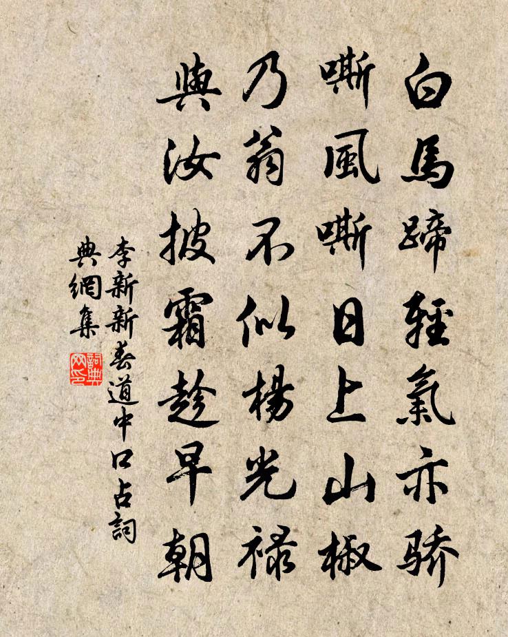 詩詞名句歷史字典書法欣賞書法字典國語詞典說文解字康熙字典古漢語字典標 題 作 者 詩 句 新春道中口占作者:李新 朝代:宋代新春道中口占原文白馬蹄輕氣亦驕,嘶風嘶日上山椒。乃翁不似楊光祿,與汝披霜趁早朝。詩詞問答問:新春道中口占的作者是誰?答:李新問:新春道中口占寫於哪個朝代?答:宋代李新新春道中口占書法欣賞新春道中口占書法作品詩詞推薦疥療洪咨夔〔宋代〕疥療悲志郁,發涼慨年徂。人特自苦耳,天竟可恃夫。忘憂草良嫵,蠲忿花更姝。多渠有酒醑,寬我無錢沽。阿芝滿庭芳(詠浮橋)黃裳〔宋代〕瓊館煙輕,銀河風細,玉橋雲鎖方開。曉虹千丈,宛轉下天來。人在水精宮裡,行樂處、錦繡成堆。仍相問,人間雅琴篇司馬逸客〔唐代〕亭亭嶧陽樹,落落千萬尋。獨抱出雲節,孤生不作林。影搖綠波水,彩絢丹霞岑。直乾思有托,雅志期所任。匠者寺齋睡起二首黃庭堅〔宋代〕小黠大痴螳捕蟬,有餘不足夔憐蚿。退食歸來北窗夢,一江風月桃李船。碧宇書興張鎡〔宋代〕非關鄙性泥林泉,境熟由來意自便。童子靜看煎藥灶,鷺鷥閒上釣魚船。隈叢野石雲蒸黑,帶雨堤花錦壓偏。辦取送伯紀禮部造朝兼簡息庵二首劉克莊〔宋代〕傳聞東澗拜南宮,朝野皆忻泰道通。不比唐家超子厚,壹如元佑起坡公。官箴健論猶當續,雪月浮文不必工。十載嘲解十首王邁〔宋代〕一相當朝總百官,升沉只在笑談間。及門炙手趨炎火,傾國將身靠泰山。子獨何人蜉撼樹,眾皆重足虎當關。仙舟宿新市徐公店楊萬里〔宋代〕籬落疏疏一徑深,樹頭花落未成陰。兒童急走追黃蝶,飛入菜花無處尋。紅梅方蒙仲〔宋代〕不但色濃華,更覺香幽迥。笑殺海棠仙,死抱淵材恨。偈六十九首釋道寧〔宋代〕祖師妙旨,覿面無私。該括古今,何嘗欠少。自是根機不等,見有差殊。方便門開,為君舉唱。送僧二首馬戴〔唐代〕親在平陽憶久歸,洪河雨漲出關遲。獨過舊寺人稀識,一一杉松老別時。龕中破衲自持行,樹下禪床坐一生。來往蜜蜂釋寶曇〔宋代〕兩股花多上粉須,趁衙去計未全疏。蜜脾一點香先透,萬斛醍醐總不如。臨別成都帳飲萬里橋贈譚德稱陸游〔宋代〕成都城南萬里橋,蘆根苹末風蕭蕭。映花碾草鈿車小,駐坡驀澗青驄驕。入門翠徑絕窈窕,臨水飛觀何迢嶢。判無金陵雜興二百首蘇泂〔宋代〕車聲轆轆馬蕭蕭,山色何如換六朝。要識相傳風俗在,居人道得語音嬌。即事十首方岳〔宋代〕藤蔓穿籬礙草扉,與僮扶起繞松圍。髯龍鱗甲動雲雨,縛著空山莫遣飛。慈濟庵二首留元崇〔宋代〕笑指星壇近斗傍,七松上映七星光。黃龍洞口胡麻飯,不是神仙不得嘗。玲瓏四犯史達祖〔宋代〕雨入愁邊,翠樹晚,無人風葉如翦。竹尾通涼,卻怕小簾低卷。孤坐便怯詩慳,念後賞、舊曾題遍。更暗塵、偷鎖道傍小桃楊萬里〔宋代〕吹盡殘桃無可殘,也無地上落花痕。獨行尋到青苔處,拾得嫣紅一片看。雪晴再次韻陳造〔宋代〕璇穹瑩澈晴風后,曉日初融陌路泥。老檜蒼筠潛動色,迎春送臘好分題。藏春僧合心曾戀,闖海山亭夢到迷。回首舟次嚴陵方岳〔宋代〕與雁分洲宿,連雲做夢清。江風人事老,夜雨客心驚。潮急仍吞瀨,更寒不過城。子陵吾所韙,蓑外底須名。名句推薦不用憑欄苦回首,故鄉七十五長亭。杜牧《題齊安城樓》 弈之為數,小數也;不專心致志,則不得也。孟子《孟子·告子章句上·第九節》 君子戰雖有陳,而勇為本焉。墨子《墨子·02章 修身》 眾里嫣然通一顧,人間顏色如塵土。王國維《蝶戀花·窈窕燕姬年十五》 日射紗窗風撼扉,香羅拭手春事違。李商隱《日射》 如何亡國恨,盡在大江東!屈大均《秣陵》 晨興理荒穢,帶月荷鋤歸。陶淵明《歸園田居·其三》 胭脂淚,相留醉,幾時重。李煜《相見歡·林花謝了春紅》 素富貴,行乎富貴;素貧賤,行乎貧賤子思《中庸·第十四章》 溪深難受雪,山凍不流雲。洪升《雪望》