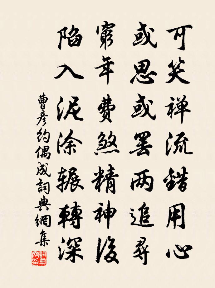 詩詞名句歷史字典書法欣賞書法字典國語詞典說文解字康熙字典古漢語字典標 題 作 者 詩 句 偶成作者:曹彥約 朝代:宋代偶成原文可笑禪流錯用心,或思或罷兩追尋。窮年費煞精神後,陷入泥塗輾轉深。詩詞問答問:偶成的作者是誰?答:曹彥約問:偶成寫於哪個朝代?答:宋代曹彥約偶成書法欣賞偶成書法作品詩詞推薦西園獨步二首孔武仲〔宋代〕官居何以滌冥煩,喜有廳西北涉園。白日漸長公事少,紅英已盡葉陰繁。淥波似鏡池能照,巧舌如簧鳥解言。風景醉落魄/一斛珠程垓〔宋代〕晚涼時節。翠梧風定蟬聲歇。有人睡起香浮頰。倚著闌乾,笑揀青荷葉。如今往事愁難說。曲池依舊閒風月。田田已亥出南康宮伯稱以詩贈行次韻三首李呂〔宋代〕君才端可用於時,努力行將徹主知。出處到頭皆分定,相期於道不須離。方務德元夕不張燈留飲賞梅務觀索賦古風韓元吉〔宋代〕昨日風雨今日晴,綠水橋南春水生。使君元夕罷高宴,亭午邀客花間行。危亭直上花幾許,水仙夾徑梅縱橫。不須雜詩 其四陶淵明〔魏晉〕裊裊松標崖,婉孌柔童子。年始二五間,喬柯何可倚。養色含津氣,粲然有心理。聲聲慢王沂孫〔宋代〕高寒戶牖,虛白尊罍,千山盡入孤光。玉影如空,天葩暗落清香。平生此興不淺,記當年、獨據胡床。怎知道,是長相思令·煙霏霏吳淑姬〔宋代〕煙霏霏,雪霏霏。雪向梅花枝上堆,春從何處回?醉眼開,睡眼開,疏影橫斜安在哉?從教塞管催。示兒二首謝枋得〔宋代〕門戶興衰不自由,樂天知命我無憂。大兒安得孔文舉,生子何如孫仲謀。天上麒麟元有數,人間豚犬不須愁。養男王竟攜酒,高亦同過,共用寒字杜甫〔唐代〕臥病荒郊遠,通行小徑難。故人能領客,攜酒重相看。自愧無鮭菜,空煩卸馬鞍。移樽勸山簡,頭白恐風寒。頌古一百首釋智愚〔宋代〕坑坑坎坎,險險巘巘。一言易出,駟馬難追。都昌書事趙崇鉘〔宋代〕世事可無酒,春藤還有花。山雲欲到地,街鼓又催衙。風緊魚休市,市貧飯帶沙。天機不得問,暮 * 棲鴉。米元章鑒遠前詩帖贊岳珂〔宋代〕登覽之勝,隨寓有感。野燒之觀,不石俱慘。逞志一快,忘彼物情。是以老氏惡夫佳兵。觀乎觀乎,彼以為觀而予浣溪沙向子諲〔宋代〕花想儀容柳想腰。融融曳曳一團嬌。綺羅叢里最妖嬈。歌罷碧天零影亂,舞時紅袖雪花飄。幾回相見為魂銷。感興六首賀鑄〔宋代〕皂鵰獰觜爪,飛走披肝腦。不知遊獵兒,必爾韝上老。別袁席之二首敖陶孫〔宋代〕漏盡書有行客,書袁侯挽不書來。掉頭緇塵中,胡為此徘徊。何處非詩具,螺江如潑醅。公子亦豈痴,索笑西湖梅龜山寺納涼呈宗衍師孔武仲〔宋代〕寶洞然香罷,山堂問話中。日將秋共淡,心與境渾空。彈指看浮世,披襟納遠風。因知宴坐者,白首樂無窮。頌古四首釋雲賁〔宋代〕帶雪含霜半倚籬,磺斜影時露仙姿。前村昨夜春來了,竹屋老僧猶未知。秋洞宿施肩吾〔唐代〕夜深秋洞裡,風雨報龍歸。何事觸人睡,不教胡蝶飛。聞潁州通判國博與知郡學士唱和頗多因以奉寄歐陽修〔宋代〕一自蘇梅閉九泉,始聞東潁播新篇。金樽留客史君醉,玉麈高談別乘賢。十里秋風紅菡萏,一溪春水碧漪漣。政成因題象罔亭榜呈太素韓維〔宋代〕一顆圓明不欠虧,胡來胡現大鈞知。如今象罔渾無用,榜樣從教作世師。名句推薦是非成敗轉頭空。楊慎《臨江仙·滾滾長江東逝水》 還與去年人,共藉西湖草。蘇軾《卜運算元·感舊》 茶鼎熟,酒卮揚,醉來詩興狂。張大烈《阮郎歸·立夏》 榆柳蕭疏樓閣閒,月明直見嵩山雪。孟郊《洛橋晚望》 良冶之子,必學為裘;良弓之子,必學為箕戴聖《禮記·學記》 施惠勿念,受恩莫忘。朱柏廬《朱子家訓·全文》 便向夕陽影里,倚馬揮毫。納蘭性德《風流子·秋郊即事》 只解沙場為國死,何須馬革裹屍還。徐錫麟《出塞》 滿堂唯有燭花紅,歌且從容,杯且從容。辛棄疾《一剪梅·中秋元月》 逍遙以針勞,談笑以藥倦劉勰《文心雕龍·養氣》