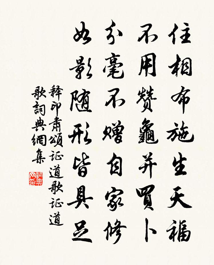 詩詞名句歷史字典書法欣賞書法字典國語詞典說文解字康熙字典古漢語字典標 題 作 者 詩 句 頌證道歌證道歌作者:釋印肅 朝代:宋代頌證道歌證道歌原文住相布施生天福,不用贊龜並買卜。分毫不贈自家修,如影隨形皆具足。詩詞問答問:頌證道歌證道歌的作者是誰?答:釋印肅問:頌證道歌證道歌寫於哪個朝代?答:宋代釋印肅頌證道歌證道歌書法欣賞頌證道歌證道歌書法作品詩詞推薦秋燕司空圖〔唐代〕從撲香塵拂面飛,憐渠只為解相依。經冬好近深爐暖,何必千岩萬水歸?春老陸游〔宋代〕春色垂垂老,山家處處忙。園丁賣菰白,蠶妾採桑黃。候雨占秧信,催兒築麥場。醉眠官道上,人為護牛羊。踏莎行胡翼龍〔宋代〕合數冰蓮,注情金葉。臂痕猶記嗔時跡。小樓幾個月黃昏,荷香柳影都知得。問字燈深,學書窗黑。衣襟詩卷留殘書齋仇遠〔宋代〕穀雨宜晴花亂開,一壺春色聚書齋。園林此後無車馬,竹杖芒鞋政自佳。訪李卿不遇錢起〔唐代〕畫戟朱樓映晚霞,高梧寒柳度飛鴉。門前不見歸軒至,城上愁看落日斜。觀李固請司馬弟山水圖三首杜甫〔唐代〕簡易高人意,匡床竹火爐。寒天留遠客,碧海掛新圖。雖對連山好,貪看絕島孤。群仙不愁思,冉冉下蓬壺。方丈乙卯七月庚子魁祀禮成同舍諸新元相與宴擬鹿姚勉〔宋代〕四州八邑此同窗,鏗石鏘金日擊撞。鵬翼相將摶北海,龍頭更奪過西江。蒿苹是日開先宴,萸菊他時捷各邦。橫浦贈五行家董季謙曾豐〔宋代〕奴隸侯千戶,屠沽祿萬鍾。書生無此望,造物不吾容。漁釣其清職,田園乃素封。煩君試推似,天意合相從。以詩問谹父病五首王洋〔宋代〕病為世上真良藥,佛是人間大道師。十八師兄齊飽後,卻言無病可醫治。休沐端居有懷希聖李維〔宋代〕銀闕琳房視草餘,龍門岑寂斷軒車。彩毫閒試金壺墨,青案時看玉字書。王令風流希謝傅,子云詞賦敵相如。瓊枝論語七則佚名〔先秦〕 子曰:“吾十有五而志於學,三十而立,四十而不惑,五十而知天命,六十而耳順,七十而從心所欲,不踰矩和劉制遺梅李曾伯〔宋代〕感君寄我一枝春,雨虐風饕苦不仁。羞得玉奴渾不放,含香猶待浣溪人。奉和襲美宿報恩寺水閣陸龜蒙〔唐代〕峰抱池光曲岸平,月臨虛檻夜何清。僧穿小檜才分影,魚擲高荷漸有聲。因憶故山吟易苦,各橫秋簟夢難成。周顒淨遠亭晚望楊萬里〔宋代〕鸂鶆嬌紅野鴨青,為人浮沒為人鳴。忽開風起仍波起,乃是飛聲與落聲。句卞震〔宋代〕雨壁長秋菌,風枝落病蟬。送佛麵杖與羅浮長老蘇軾〔宋代〕十方三界世尊面,都在東坡掌握中。送與羅浮德長老,攜歸萬竅總號風。寄題龔立道崑山棲閒堂陸游〔宋代〕我居山陰古大澤,出門尚恨風煙迮。欲求曠快舒眼力,夢中去作棲閒客。棲閒主人計不疏,萬卷讀盡家藏書。平時禪人並化主寫真求贊釋正覺〔宋代〕去就清貧,擔何苦辛。兀默三椽老,平生五合陳。出家意謂了身,住院還相累人。野水連天半夜月,叢林和氣十方縱筆陸游〔宋代〕晝倦夜常成美睡,病多老卻未全衰。歸從冊府猶披卷,了卻官書更賦詩。錢塘晚渡別友釋文珦〔宋代〕寒月照沙頭,輕風引客舟。掛帆重曠望,舉櫂復夷猶。地勢連吳越,星躔次鬥牛。雁煙縈別思,漁火點鄉愁。雙鬢名句推薦杪秋霜露重,晨起行幽谷。柳宗元《秋曉行南谷經荒村》 可有梅花寄一枝?雪來翠羽飛。吳錫麒《長相思·以書寄西泠諸友即題其後》 樓前綠暗分攜路,一絲柳、一寸柔情。吳文英《風入松·聽風聽雨過清明》 睡起莞然成獨笑,數聲漁笛在滄浪。蔡確《夏日登車蓋亭》 懸衡而知平,設規而知圓。韓非及後人《韓非子·飾邪》 南去北來徒自老,故人稀。賀鑄《釣船歸·綠淨春深好染衣》 山不在高,有仙則名水不在深,有龍則靈劉禹錫《陋室銘》 執子之手,與子偕老。詩經《擊鼓》 家有千口,主事一人。佚名《增廣賢文·下集》 夫人雖有性質美而心辯知,必將求賢師而事之荀子《荀子·性惡》