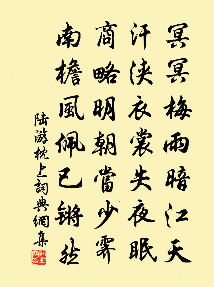 詩詞名句歷史字典書法欣賞書法字典國語詞典說文解字康熙字典古漢語字典標 題 作 者 詩 句 枕上作者:陸游 朝代:宋代枕上原文冥冥梅雨暗江天,汗浹衣裳失夜眠。商略明朝當少霽,南檐風佩已鏘然。詩詞問答問:枕上的作者是誰?答:陸游問:枕上寫於哪個朝代?答:宋代問:陸游的名句有哪些?答:陸游名句大全陸游枕上書法欣賞枕上書法作品詩詞推薦錫杖歌送明楚上人歸佛川權德輿〔唐代〕上人遠自西天竺,頭陀行遍國朝寺。口翻貝葉古字經,手持金策聲泠泠。護法護身唯振錫,石瀨雲溪深寂寂。乍來走筆贈獨孤駙馬李白〔唐代〕都尉朝天躍馬歸,香風吹人花亂飛。銀鞍紫鞚照雲日,左顧右盼生光輝。是時仆在金門裡,待詔公車謁天子。長揖同鄭君瑞出瀨溪即事十首劉克莊〔宋代〕北耗而今杳不知,路傍羽檄走無時。自憐滿鏡星星發,羞見官中募士旗。登岳陽樓陳杰〔宋代〕扁舟小系畫欄西,萬里清光一拄頤。湖面欲包天外去,嶠鬟疑割海中來。高空自瀉軒皇樂,元氣長涵老杜詩。慶曆雜興張鎡〔宋代〕照乘復垂棘,固足為國寶。朝有宣力賢,愛惜莫草草。成湯昔在上,剪髮救枯稿。念民有念已,頃刻動穹昊。太宗史太師入覲賜帶以不知官高卑玉帶懸金魚為韻釋寶曇〔宋代〕東家熟黃粱,西家夢飛蓋。起來試捫腹,閱人莫如帶。和中丞徐容齋貫戶維揚王奕〔宋代〕岳到東原掌樣平,南州師友樹高名。聖人門戶三千教,老子胸懷百萬兵。學要絕時須著繼,道逢夷處不消爭。鳳池盧求榜讖佚名〔唐代〕裴頭黃尾,三求六李。臨江仙葛勝仲〔宋代〕檻外奇葩江外種,嬌春未減酲紅。畫樓晴日斂雲峰。佛香來海岸,蜀錦薦燈籠。今夜那憂殺風景,酒花來斗妖濃。出城李復〔宋代〕今日何日我心傷,出門下馬走東岡。東岡路高人跡斷,獨立矯首望八荒。長空澹澹地莽莽,停雲黯淡山淒蒼。回薄重送宋中道梅堯臣〔宋代〕隴草陳根發,山樓宿霧蒸。將過周故宅,先下漢諸陵。柏道春經雨,官溝暗溜冰。蓴羹休定價,羊酪易為勝。宮詞王珪〔唐代〕紅濕春羅染御袍,透簾三丈日華高。金針玉尺裁縫處,一對盤龍落剪刀。頌古三十八首釋慧方〔宋代〕台山路上人難進,獨有趙州親到來。勘破老婆回首處,從此行人眼不開。紹興享先農十一首佚名〔宋代〕大事在祀,齊潔為先。既興而升,奉以周旋。下觀而化,無敢不蠲。惟神降格,監厥精虔。俳體戲書二首方回〔宋代〕世變茫茫不可期,珊瑚作婢搗黃糜。八千里有假附子,二十年無生荔枝。司馬夢迷蘇小小,屏山詩痛李師師。只應張宮苑拜嘉州刺史知恩州宋祁〔宋代〕二年同守夢刀城,遙節初為北道行。飛將負才曾捕虜,伏波見上數論兵。劍南剩臘梅迎使,塞下新春柳映營。貴寵頌四賓主釋印肅〔宋代〕大地山河眼裹塵,自古至今強立名。祗個絕邊無縫塔,不曾來往逐有情。寄示兒孫翁承贊〔唐代〕力學燒丹二十年,辛勤方得遇真仙。便隨羽客歸三島,旋聽霓裳適九天。得路自能酬造化,立身何必戀林泉。予家愛日陳普〔宋代〕一寸光陰直萬錢,況兼妙質與崇年。睡魔懶崇俱驅去,要與窗駒鬥著鞭。憶仙姿·蓮葉初生南浦賀鑄〔宋代〕蓮葉初生南浦,兩岸綠楊飛絮。向晚鯉魚風,斷送彩帆何處?凝佇,凝佇,樓外一江煙雨。名句推薦細腰爭舞君沉醉,白日秦兵天下來。李涉《楚宮怨二首·其一》 娶妻莫恨無良媒,書中自有顏如玉。趙恆《勸學詩》 九日明朝酒香,一年好景橙黃。張可久《滿庭芳·客中九日》 卻恨悲風時起,冉冉雲間新雁,邊馬怨胡笳。葉夢得《水調歌頭·秋色漸將晚》 枕中雲氣千峰近,床底松聲萬壑哀。曾公亮《宿甘露寺僧舍》 鷫鸘換美酒,舞衣罷雕龍。李白《怨歌行》 忙日苦多閒日少,新愁常續舊愁生。陸游《浣溪沙·和無咎韻》 千里搭長棚,沒有個不散的筵席曹雪芹《紅樓夢·第二十六回》 殘雪樓台,遲日園林。韓疁《高陽台·除夜》 小荷才露尖尖角,早有蜻蜓立上頭。楊萬里《小池》
