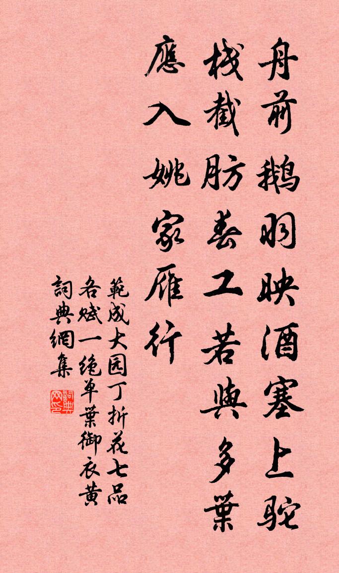詩詞名句歷史字典書法欣賞書法字典國語詞典說文解字康熙字典古漢語字典標 題 作 者 詩 句 園丁折花七品各賦一絕單葉御衣黃作者:范成大 朝代:宋代原文舟前鵝羽映酒,塞上駝棧截肪。春工若與多葉,應入姚家雁行。詩詞問答問:《園丁折花七品各賦一絕單葉御衣黃》的作者是誰?答:范成大問:該詩寫於哪個朝代?答:宋代問:范成大的名句有哪些?答:范成大名句大全書法欣賞園丁折花七品各賦一絕單葉御衣黃書法作品詩詞推薦開封古城阻淺聞永叔喪女梅堯臣〔宋代〕去年我喪子與妻,君聞我悲嘗俛眉。今年我聞君喪女,野岸孤坐還增思。思君平昔憐此女,戲弄膝下無不宜。昨來喜春來徐再思〔元代〕春雲巧似山翁帽,古柳橫為獨木橋,風微塵軟落紅飄。沙岸好,草色上羅袍。春來南國花如繡,雨過西湖水似油,望鄉夕泛駱賓王〔唐代〕歸懷剩不安,促榜犯風瀾。落宿含樓近,浮月帶江寒。喜逐行前至,憂從望里寬。今夜南枝鵲,應無繞樹難。和王微之秋浦望齊山感李太白杜牧之王安石〔宋代〕齊山置酒菊花開,秋浦聞猿江上哀。此山漠漠雲垂地,南埭悠悠水映人。馳道蔽虧松半死,射場埋沒雉多馴。登高木蘭花毛熙震〔唐代〕掩朱扉,鉤翠箔,滿院鶯聲春寂寞。勻粉淚,恨檀郎,一去不歸花又落。對斜暉,臨小閣,前事豈堪重想著。金帶寄奉符大有叔王之道〔宋代〕血氣侵凌不復豪,往來欹倒似乘濤。寧知懶過嵇中散,亦有詩如謝法曹。舊藁只堪供醬瓿,故人相贈有綈袍。兗州長相思曹鄴〔唐代〕妾顏與日改,君心與日新。三年得一書,猶在湘之濱。料君相輕意,知妾無至親。況當受明禮,不合再嫁人。願君水調歌頭利登〔宋代〕相聚不知好,相別始知愁。筍輿伊軋,穿盡斜照古平州。今夜荒風脫木,明夜山長水遠,後夜已他州。轉覺家山遠應天長(兩峰插雲)張矩〔宋代〕暮屏翠冷,秋樹赭疏,雙峰對起南北。好與霽天相接,浮圖現西極。苕嶢處,雲共碧。漫費盡、少年游屐。故鄉近老柏圖為張心田賦王冕〔元代〕高堂素壁無纖埃,上有老柏參天來。銅柯旁奮龍爪出,密葉暗擁玄雲堆。江乾水落見白石,小竹無聲弄秋碧。君不悲歌行李白〔唐代〕悲來乎,悲來乎。主人有酒且莫斟,聽我一曲悲來吟。悲來不吟還不笑,天下無人知我心。君有數斗酒,我有三尺倣歸去來辭晃逈〔宋代〕陶令釣魚曾言歸去釣魚來,解釣魚還家不回首。屏貴都遺身外名,忘憂酷嗜杯中釣魚。白傳曾言歸去來,了知浮世偈頌一百三十六首釋惟一〔宋代〕不如隨分納些些,何處青山不是家。玉笛橫吹皇化里,風前清韻徹天涯。贈三局能師二絕蘇轍〔宋代〕得失從來似偶然,因師聊復問行年。此生竟墮陰陽數,方信修行力未全。旅食江乾秋復春,歸耕未遂不勝貧。憑師過神助橋亭楊萬里〔宋代〕下轎渾將野店看,只驚腳底水聲寒。不知竹外長江近,忽有高桅出寸竿。八月十五日夜同衛諫議看月秦韜玉〔唐代〕常時月好賴新晴,不似年年此夜生。初出海濤疑尚濕,漸來雲路覺偏清。寒光入水蛟龍起,靜色當天鬼魅驚。豈獨詠瀟湘八景各一首洞庭秋月劉克莊〔宋代〕寄聲謝軒帝,不必奏鈞天。一碧九萬里,橫吹鐵笛眠。南海石門戍懷古陳陶〔唐代〕漢家征百越,落地喪貔貅。大野朱旗沒,長江赤血流。鬼神尋覆族,宮廟變荒丘。唯有朝台月,千年照戍樓。耕甫歸書約信二字為別二首杜范〔宋代〕實之謂信,言巽行果。言有不實,自喪厥我。誰其掩之,不善已播。人而無信,不知其可。十日夜月中馬上作陸游〔宋代〕身游碧海跨鯨魚,心似寒冰貯玉壺。衣濕三更清露墜,眼明萬里片雲無。橫空孤鶴曾相識,散發飛僊定可呼。老向名句推薦把酒看花想諸弟,杜陵寒食草青青。韋應物《寒食寄京師諸弟》 故知之始己,自知而後知人也。王詡《鬼谷子·反應》 材愨者常安利,盪悍者常危害荀子《荀子·榮辱》 高風吹玉柱,萬籟忽齊飄司空曙《風箏》 自與東君作別,剗地無聊。納蘭性德《風流子·秋郊即事》 積土成山,風雨興焉;積水成淵,蛟龍生焉;荀子《勸學》 隱隱飛橋隔野煙,石磯西畔問漁船。張旭《桃花溪》 把酒祝東風,且莫恁、匆匆去。王安石《傷春怨·雨打江南樹》 富貴不離其身,然後能保其社稷,而和其民人。孔子及其弟子《孝經·諸侯》 白雲千里萬里,明月前溪後溪。劉長卿《謫仙怨·晴川落日初低》