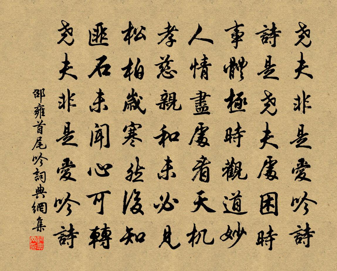 詩詞名句歷史字典書法欣賞書法字典國語詞典說文解字康熙字典古漢語字典標 題 作 者 詩 句 首尾吟作者:邵雍 朝代:宋代首尾吟原文堯夫非是愛吟詩,詩是堯夫處困時。事體極時觀道妙,人情盡處看天機。孝慈親和未必見,松柏歲寒然後知。匪石未聞心可轉,堯夫非是愛吟詩。詩詞問答問:首尾吟的作者是誰?答:邵雍問:首尾吟寫於哪個朝代?答:宋代邵雍首尾吟書法欣賞首尾吟書法作品詩詞推薦題西湖竹閣寺姚勉〔宋代〕千古清風白樂天,昔時曾此飽談禪。自從西閣無吟跡,惟有東坡嗣舊傳。來往只應湖上寺,聽聞誤說海中仙。我來北苑侍宴雜詠詩菊徐鉉〔唐代〕細麗披金彩,氣氳散遠馨。泛杯頻奉賜,緣解制頹齡。次韻和答孔毅甫黃庭堅〔宋代〕鵬飛鯤化未即逍遙遊,龍章鳳姿終作廣陵散。湓浦爐邊督數錢,故人陸沉心可見。氣與神兵上鬥牛,詩如晴雪濯江行香子 止酒五首張翥〔元代〕酒量無多。不飲從他。看黃壚、似隔山河。淵明自止,醉尉誰呵。也莫豪吟,莫狂舞,莫高歌。鷗外風波。蝸角乾再上湘江柳宗元〔唐代〕好在湘江水,今朝又上來。不知從此去,更遣幾年回。吳門道中劉宰〔宋代〕三吳豪俠騁輕肥,儘是當年襁褓兒。鬢髮蒼蒼顏色改,問翁如此復何為。觀音院讀壁間蘇在廷少卿兩小詩次韻陸游〔宋代〕揚鞭暮出錦官城,小院無僧有月明。不信道人心似鐵,隔城猶送搗衣聲。上禮部侍郎陳情施肩吾〔唐代〕九重城裡無親識,八百人中獨姓施。弱羽飛時攢箭險,蹇驢行處薄冰危。晴天欲照盆難反,貧女如花鏡不知。卻向導引佚名〔宋代〕三弄曉、雲黯天低。攀六引、轉悲悽。儉慈孝哲鍾天性,深仁厚澤遍群黎。東西南北傒商霓。功甫就、別宸閨。臣麾蚊李劉〔宋代〕煙驅扇系手頻撾,奈爾傳呼又滿衙。我醉不眠君不去,下帷高枕任喧譁。掃徑郭印〔宋代〕陰森百畝林,所向無不好。俗客豈曾來,幽處通蓬島。一色盡琅玕,堅潤真可寶。天風時脫葉,滿徑堆殘槁。適然兔罝佚名〔先秦〕肅肅兔罝,椓之丁丁。赳赳武夫,公侯干城。肅肅兔罝,施於中逵。赳赳武夫,公侯好仇。肅肅兔罝,施於中林。再和並答楊次公蘇軾〔宋代〕昆盧海上妙高峰,二老遙知說此翁。聊復艤舟尋紫翠,不妨持節散陳紅。高懷卻有雲門興,好句真傳雪竇風。唱我溪亭春日二首借屋三間俯近郊,溪流如練繞蘭程公許〔宋代〕極目青天蜀道難,無因長坂得聊驂。思鄉浪費腸回九,行世何妨臂拍三。楊柳風微生百媚,棠梨書永帶餘酣。天涯石湖行春橋顧逢〔宋代〕十里湖光漾碧霄,山雲吞吐筆難描。宜涼宜月猶宜雪,何獨行春過此橋。次韻答璧侍者五首陳造〔宋代〕為向詩翁致命回,定應禪老笑顏開。盤餐要是隨宜飽,{上四下各}具油蔥市海苔。賦終南山用風字韻應詔楊師道〔唐代〕眷言懷隱逸,輟駕踐幽叢。白雲飛夏雨,碧嶺橫春虹。草綠長楊路,花疏五柞宮。登臨日將晚,蘭桂起香風。和許給事中直夜簡諸公張九齡〔唐代〕未央鐘漏晚,仙宇藹沉沉。武衛千廬合,嚴扃萬戶深。左掖知天近,南窗見月臨。樹搖金掌露,庭徙玉樓陰。他日挽仁宗皇帝辭五首鄭獬〔宋代〕付託神靈器,子孫千萬年。果為天下福,遂得聖人傳。已定無疆業,方成顧命篇。明朝無一事,脫屣或登仙。殘句醉中有客眠何害蘇軾〔宋代〕醉中有客眠何害,須信陶潛未若賢。名句推薦虛牖傳寒柝,孤燈照絕編。歐陽詹《除夜長安客舍》 杪秋霜露重,晨起行幽谷。柳宗元《秋曉行南谷經荒村》 小酌酒巡銷永夜,大開口笑送殘年。白居易《雪夜小飲贈夢得》 幸遇三杯酒好,況逢一朵花新。朱敦儒《西江月·世事短如春夢》 顧此耿耿存,仰視浮雲白。文天祥《正氣歌》 名不正,則言不順;言不順,則事不成孔子弟子《論語·子路篇》 娶妻無媒毋須恨,書中自有顏如玉。趙恆《勸學詩》 風吹柳花滿店香,吳姬壓酒喚客嘗。李白《金陵酒肆留別》 馬驕泥軟錦連乾,香袖半籠鞭。薛昭蘊《喜遷鶯·清明節》 暗柳啼鴉,單衣佇立,小簾朱戶。周邦彥《瑣窗寒·寒食》