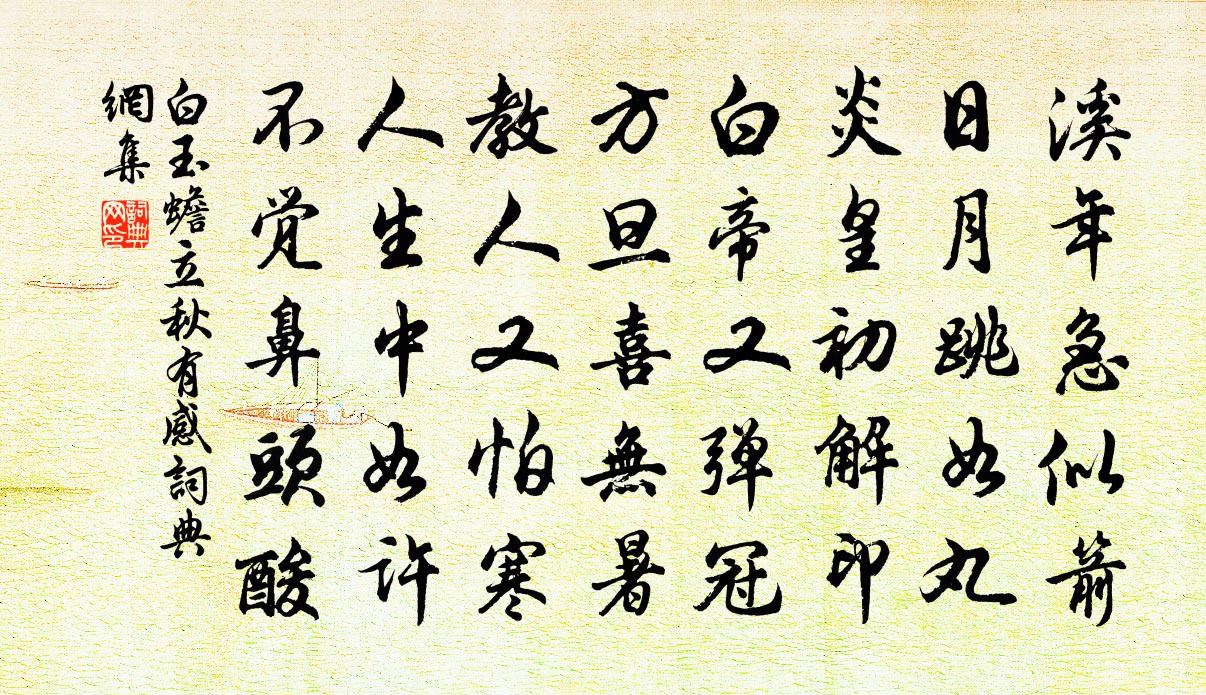 詩詞名句歷史字典書法欣賞書法字典國語詞典說文解字康熙字典古漢語字典標 題 作 者 詩 句 立秋有感作者:白玉蟾 朝代:宋代立秋有感原文溪年急似箭,日月跳如丸。炎皇初解印,白帝又彈冠。方旦喜無暑,教人又怕寒。人生中如許,不覺鼻頭酸。詩詞問答問:立秋有感的作者是誰?答:白玉蟾問:立秋有感寫於哪個朝代?答:宋代問:立秋有感是什麼體裁?答:五古白玉蟾立秋有感書法欣賞立秋有感書法作品詩詞推薦省試中式記夢於觀文〔宋代〕東堂令史報來時,仙桂雲攀第九枝。乍聽言音猶似夢,卻思公道即無疑。寒門仿佛春將到,幽徑朦朧月漸移。殘漏念奴嬌(菊)鄭清之〔宋代〕楚天霜曉,看老來秋圃,寒花猶在。金闕栽培端正色,全勝東籬風采。雅韻清虛,幽香淡泊,惟有陶家愛。由他塵寓寺八首張耒〔宋代〕病臥淮陽太昊城,牡丹叢畔過清明。那知春暮長江上,竹里招提聽曉鶯。秋暖張鎡〔宋代〕秋暖渾如水上春,意行幽徑散衣巾。海棠突過色尤好,荷葉打空芽更新。焉得便遭田父飲,不須真現宰官身。今朝水龍吟元好問〔金代〕漢家金粟堆空,玉花驚見天池種。并州畫角,迴腸淒斷,清霜曉弄。世事浮雲,白衣蒼狗,知誰搏空。恨北平老守越中言事二首(鹹通八年琅琊公到任後作)方乾〔唐代〕異術閒和合聖明,湖光浩氣共澄清。郭中雲吐啼猿寺,山上花藏調角城。香起荷灣停棹飲,絲垂柳陌約鞭行。遊人送吳興使君郎中分務歸姑蘇夏竦〔宋代〕罷郡歸南國,分曹在別京。江山適清尚,圭組謝浮名。桂楫鄉入送,雲槳舊吏迎。夕香薰徑遠,春溜斂池平。累去避虜入洞庭孫銳〔宋代〕朔風一夜渡江村,北望雲飛不忍言。仙隱老尋雙橘柚,避秦人愛小桃源。煙波亂逐鴟夷舸,烽火遙騰馬僨轅。聞道望江南戴復古〔宋代〕有說未盡處,為續四曲壺山好,博古又通今。結屋三間藏萬卷,揮毫一字直千金。四海有知音。門外路,咫尺是湖觀物二首洪咨夔〔宋代〕飽飯茶甌罷,閒觀萬物情。狗加獅立號,貓冒虎為名。故沼慈姑王,新畦腐婢榮。蟬從何許變,忽送出林聲。行次潁州值雨留駐數日因貽郡守秘閣刁公楊億〔宋代〕夢想蒼龍闕,盤桓汝水濱。郡侯偏愛客。秋雨更留人。饌盛嘗鱸膾,樽空倒角巾。羈愁不能遣,唯恐二毛新。鄰家曉雞仇遠〔宋代〕嚴城鼓角送鐘聲,頃刻三更四五更。卻是鄰家雞唱準,不差訊息已天明。歙州盧中丞見惠名醞杜牧〔唐代〕誰憐賤子啟窮途,太守封來酒一壺。攻破是非渾似夢,削平身世有如無。醺醺若借嵇康懶,兀兀仍添寧武愚。猶念送新酒糟蟹與賈之奇五首曹勛〔宋代〕陋巷何能有玉醅,閒人正以鄙惟罍。搗香篩辣宜相送,似勝騎鯨月下杯。憶王孫馬鈺〔元代〕長安雲步去還來。萬朵金蓮火里開。獨飲刀圭勝濁醅。兩三杯。滌盡曹十九舞綠鈿元稹〔唐代〕急管清弄頻,舞衣才攬結。含情獨搖手,雙袖參差列。騕褭柳牽絲,炫轉風回雪。凝眄嬌不移,往往度繁節。山中遇雨李彌遜〔宋代〕卯酒催歸夢,僧房借枕頭。客愁三日雨,山意十分秋。鳴澗漲還落,凝雲去復留。陽烏肯回翼,高處卜深游。詠雪舒坦〔宋代〕茅君失卻三神鶴,王母應添五色麟。草木未春花事動,乾坤不夜月華新。正月三日大雪雪晴有感張耒〔宋代〕平生對雪須千首,何事今春無片詞。老大怯寒唯泥酒,窮愁須醉不吟詩。潤催庭柳將開眼,冷送江梅欲別枝。何處戲贈蕭處士、清禪師白居易〔唐代〕三杯嵬峨忘機客,百衲頭陀任運僧。又有放慵巴郡守,不營一事共騰騰。名句推薦恰同學少年,風華正茂;書生意氣,揮斥方遒。 * 《沁園春·長沙》 琵琶金翠羽,弦上黃鶯語。韋莊《菩薩蠻》 金風飄菊蕊,玉露泫萸枝。韋安石《奉和九日幸臨渭亭登高應制得枝字》 紫塞門孤,金河月冷,恨誰訴?朱彝尊《長亭怨慢·雁》 馬驕泥軟錦連乾,香袖半籠鞭。薛昭蘊《喜遷鶯·清明節》 但去莫復問,白雲無盡時。王維《送別》 成人不自在,自在不成人。曹雪芹《紅樓夢·第八十二回》 無言獨上西樓,月如鉤。寂寞梧桐深院鎖清秋。李煜《相見歡·無言獨上西樓》 樹德務滋,除惡務本佚名《尚書·周書·泰誓》 不辭山路遠,踏雪也相過。張九齡《答陸澧》