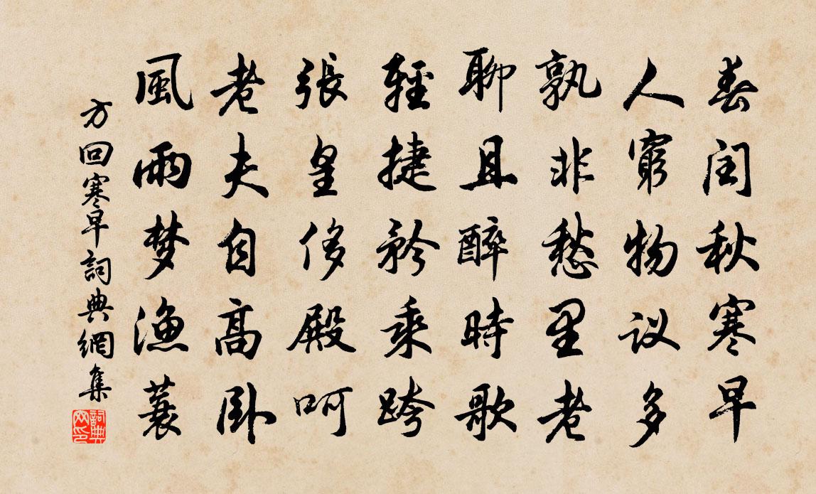 詩詞名句歷史字典書法欣賞書法字典國語詞典說文解字康熙字典古漢語字典標 題 作 者 詩 句 寒早作者:方回 朝代:宋代寒早原文春閏秋寒早,人窮物議多。孰非愁里老,聊且醉時歌。輕捷矜乘跨,張皇侈殿呵。老夫自高臥,風雨夢漁蓑。詩詞問答問:寒早的作者是誰?答:方回問:寒早寫於哪個朝代?答:宋代方回寒早書法欣賞寒早書法作品詩詞推薦十月二月二日晚同向景先閱江船忽雨作從教授趙蕃〔宋代〕誰令類痴兒,乃是妨曰假。君方溯歸鴻,我政專野馬。成詩忽能送,有酒胡不瀉。此段亦可傳,誰與妙揮灑。建德新牆詩梅堯臣〔宋代〕山廨不營堵,筠篁為密籬。初年固可蔽,晏歲不能支。已被巢蜂蠹,復為荒葛虆。夏雨久枯脆,秋風遂傾敧。雞鶩雜感陸游〔宋代〕世事紛紛無已時,勸君杯到不須辭。但能爛醉三千日,楚漢興亡總不知。句釋曇穎〔宋代〕自從游紫陌,誰肯隱青山。中伏日省中當直楊億〔宋代〕火雲烘赫臨中伏,青鎖深嚴直右曹。吏散階庭時縱步,詩成几案獨揮毫。相烏影轉風微起,仙掌陰斜日漸高。何處八聲甘州(競渡)姚雲文〔宋代〕卷絲絲、雨織半晴天,析歌發清舷。甚蒼虬怒躍,靈龜急吼,雪涌平川。樓外榴裙幾點,描破綠楊煙。把畫羅遙指曉晴過猿藤逕楊萬里〔宋代〕厭雨欣初霽,貪程敢晏眠。排天雙壁起,受日一峰先。入逕惟逢樹,無人況有煙。藤深猿不見,聲到客愁邊。渡楊子江遇顛風和霍希文韻三首袁說友〔宋代〕危檣恰恰傍金山,風送船回勢莫攀。忘卻波濤望金碧,無邊閣上幾層欄。晚涼登山亭陸游〔宋代〕庭空葉飛秋,村迥鳩喚雨。新涼入巾褐,老子顛欲舞。憑高望稽山,秀色溢天宇。一鏡三百里,水落分別浦。淒涼天人閣端午帖子詞宋庠〔宋代〕漢家宮掖與天連,桃印金刀瑞氣鮮。朱夏雖稱五之日,皇圖自樂萬斯年。智果庵徐月溪〔宋代〕居廛終是俗,飯罷即禪房。竹蔭一庭綠,荷分兩岸香。拙鳩呼雨緩,老衲補衣忙。不厭頻來此,岩深風自涼。端午帖子皇帝閣周必大〔宋代〕嘗記唐家逢五日,近臣藩鎮貢衿鞶。吾君教朴無來獻,卻疊香羅賜百官。【雙調】清江引馬致遠〔元代〕野興樵夫覺來山月底,釣叟來尋覓。你把柴斧拋,我把魚船棄。尋取個穩便處閒坐地。綠蓑衣紫羅袍誰是主,兩件戰掉醜奴兒馬鈺〔元代〕千門萬戶人聽勸,好結良因。恤念飢人。共設三冬粥濟貧。福彌臻。一抄半撮慈悲米,功行非輕。遠勝看經。惻隱與趙五話別釋斯植〔宋代〕送君無計路漫漫,玉笛聲悲遠戍間。自是行人多有恨,離情吹不到陽關。句李璟〔唐代〕靈槎思浩蕩,老鶴倚崆峒。蒼苔迷古道,紅葉亂朝霞。棲鳳枝梢猶軟弱,化龍形狀已依稀。九日登方山滕玲〔宋代〕知君夙昔愛登山,特地相攜上峻巒。豈但登高如杜牧,故應訪舊憶未寬。凝眸直欲小東魯,振袂如將近廣寒。幸有贈來進士鵬李鹹用〔唐代〕語玄人不到,星漢在靈空。若使無良遇,虛言有至公。月明千嶠雪,灘急五更風。此際若吟力,分將造化功。題劉練師屋壁胡寅〔宋代〕誰言無路出塵氛,丹灶初聞一語真。窗外未堆千嶂玉,坐中先盎一壺春。初見梅懷玉山友弟趙蕃〔宋代〕江路野梅初折來,班班已有數花開。細看渾覺風神在,且老空驚鬢髮摧。我所思兮千萬里,知其趣爾五三杯。半年名句推薦楓樹夜猿愁自斷,女蘿山鬼語相邀李商隱《楚宮》 渡頭楊柳青青。枝枝葉葉離情。晏幾道《清平樂·留人不住》 龍游淺水遭蝦戲,虎落平原被犬欺。吳承恩《西遊記·第二十八回》 春日遲遲,卉木萋萋。佚名《出車》 勞而不伐,有功而不德,厚之至也。佚名《易傳·繫辭傳上·第八章》 相見時難別亦難,東風無力百花殘。李商隱《無題·相見時難別亦難》 驟雨過,珍珠亂撒,打遍新荷。元好問《驟雨打新荷》 相逢不盡平生事,春思入琵琶。劉迎《烏夜啼·離恨遠縈楊柳》 風蒲獵獵小池塘。過雨荷花滿院香。李重元《憶王孫·夏詞》 學不可以已。荀子《荀子·勸學》