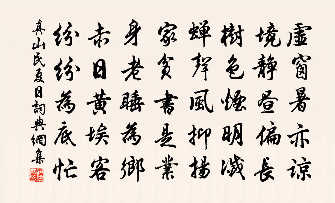 詩詞名句歷史字典書法欣賞書法字典國語詞典說文解字康熙字典古漢語字典標 題 作 者 詩 句 夏日作者:真山民 朝代:宋代夏日原文虛窗暑亦諒,境靜晝偏長。樹色煙明滅,蟬聲風抑揚。家貧書是業,身老睡為鄉。赤日黃埃客,紛紛為底忙。詩詞問答問:夏日的作者是誰?答:真山民問:夏日寫於哪個朝代?答:宋代真山民夏日書法欣賞夏日書法作品詩詞推薦贈別安邑韓少府耿湋〔唐代〕子真能自在,江海意何如。門掩疏塵吏,心閒閱道書。古城寒欲雪,遠客暮無車。杳杳思前路,誰堪千里餘。添字採桑子李清照〔宋代〕窗前誰種芭蕉樹?陰滿中庭;陰滿中庭,葉葉心心、舒捲有餘情。傷心枕上三更雨,點滴霖霪;點滴霖霪,愁損北移牡丹栽白居易〔唐代〕金錢買得牡丹栽,何處辭叢別主來?紅芳堪惜還堪恨,百處移將百處開。贈南回了豐上人三首張嵲〔宋代〕連階澹澹方江水,擁檻煌煌百日花。遙想老豐秋雨夜,跏趺刎坐聽鳴蛙。丙除夜泊舟東湖用白石歸苕溪韻書懷徐端〔宋代〕空山歲晚足堪娛,殘雪千峰水半湖。明發臨風相諸弟,共扶白髮進屠蘇。夢覺舒邦佐〔宋代〕夢覺還尋夢,胚胎一想中。失身邯鄲枕,得意大槐宮。周在蝶何在,蕉空鹿亦空。自憐心未靜,起坐究幡風。短歌行曹丕〔魏晉〕仰瞻帷幕,俯察几筵。其物如故,其人不存。神靈倏忽,棄我遐遷。靡瞻靡恃,泣涕連連。呦呦游鹿,草草鳴麑。答顯忠上人梅堯臣〔宋代〕驅馬傍馳道,歸自許西偏。高車非舊貴,立避槐樹邊。心雖欲往謁,仆餒行不前。是甘處窮巷,晨笑微生煙。儻有贈僧皎然顏真卿〔唐代〕秋意西山多,別岑縈左次。繕亭歷三癸,趾趾鄰什寺。元化隱靈蹤,始君啟高致。誅榛養翹楚,鞭草理芳穗。俯砌句齊鎬〔唐代〕蓮中花更好,雲里月常新。積雨作寒范成大〔宋代〕壓屋雨雲晝暗,環城霖潦夏寒。西池半沒荷柄,南蕩平沉芡盤。冬日釋文珦〔宋代〕交因貧盡絕,懶與病相兼。客里朱顏失,吟中白髮添。衲衣冬未補,霜氣夜來嚴。坐待朝曦上,支離曝短檐。南郊即景趙善信〔宋代〕勝日覓芳行,白雲朝露濕。沙頭人過頻,橋底湍流急。花在隔籬明,鵑於高樹泣。青簾沽酒家,和氣春風集。餞修史宮講吏部陳大著赴鎮贛州方逢辰〔宋代〕蠡湖擘破亨衢開,山川鍾作魁奇材。九關叫後入雲岫,六陰卷出登蓬萊。著庭萬卷了汗竹,粉闈胡事初先幞。非徒入朝曲謝朓〔南北朝〕江南佳麗地,金陵帝王州。逶迤帶綠水,迢遞起朱樓。飛甍夾馳道,垂楊蔭御溝。凝笳翼高蓋,疊鼓送華輈。獻納首夏病間白居易〔唐代〕我生來幾時,萬有四千日。自省於其間,非憂即有疾。老去慮漸息,年來病初愈。忽喜身與心,泰然兩無苦。況茲歸來徐照〔宋代〕歸來長獨坐,誰更伴吾行。不念為生拙,偏思得句清。園晴秋菜少,井涸夜泉生。愛聽燈前雨,松聲相雜鳴。太平寺水楊萬里〔宋代〕太平古寺劫灰余,夕陽惟照一塔孤。得得來看還不樂,竹莖荒處破殿虛。偶逢老僧聽僧話,道是壁間留古畫。徐生和吳山泉萬竹亭釋道璨〔宋代〕風流不減晉諸賢,冰雪精神已凜然。歲晚莫教冰雪盛,聽他明月下青天。寄殿院高侍御吳融〔唐代〕黃梅雨細冪長洲,柳密花疏水慢流。釣艇正尋逋客去,繡衣方結少年游。風前不肯看垂手,燈下還應惜裹頭。一夜名句推薦中夜四五嘆,常為大國憂。李白《經亂離後天恩流夜郎憶舊遊書懷贈江夏韋太守良宰》 巧笑倩兮,美目盼兮。佚名《碩人》 我有所念人,隔在遠遠鄉。白居易《夜雨》 幸災不仁,乘危不武張廷玉《明史·列傳·卷一百三十六》 傷心莫語,記那日旗亭,水嬉散盡,中酒阻風去。納蘭性德《摸魚兒·午日雨眺》 順天意者,義政也;反天意者,力政也。墨子《墨子·26章 天志(上)》 敗莫大於不自知。呂不韋《呂氏春秋·論·不苟論》 寒食時看郭外春,野人無處不傷神。雲表《寒食詩》 天下有道,卻走馬以糞。天下無道,戎馬生於郊。老子《老子·德經·第四十六章》 今朝有酒今朝醉,明日愁來明日愁。羅隱《自遣》